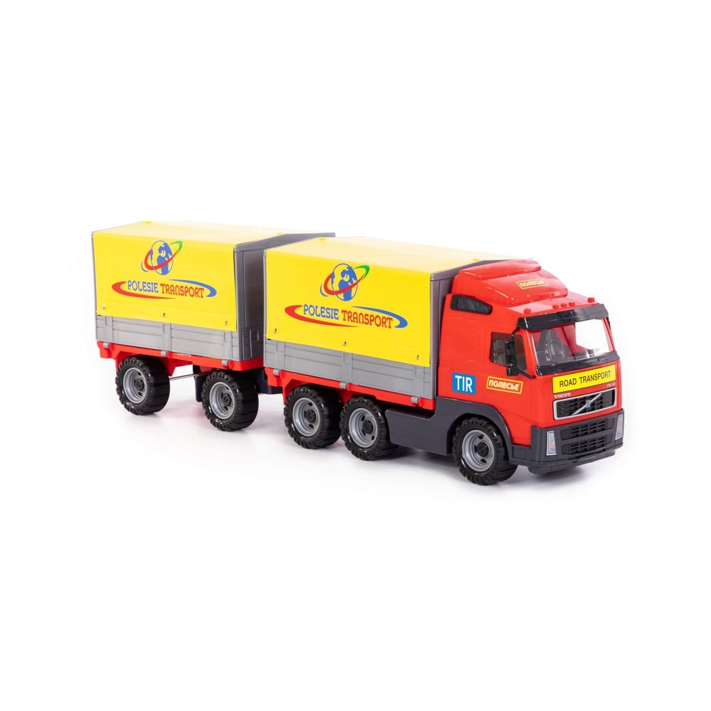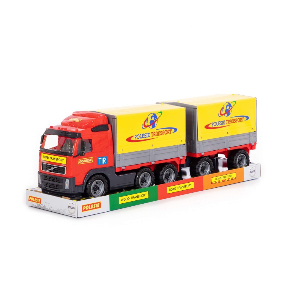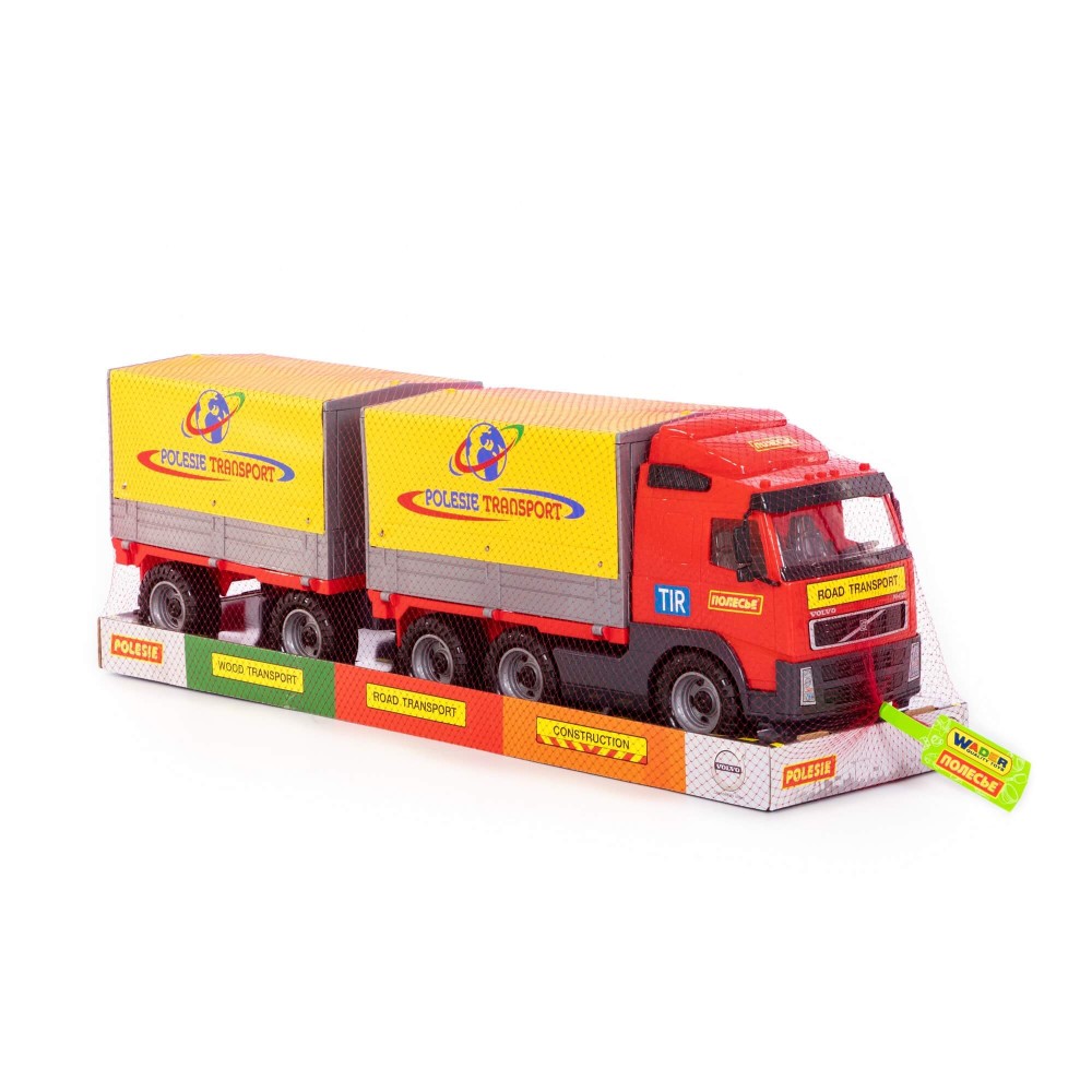 Автомобиль бортовой тентовой «Volvo» с прицепом от компании «Полесье» создан по подобию оригинального большегруза. Игрушка выполнена из качественного и надежного пластика. Автомобиль оснащён съёмным тентом и бортами, которые легко убрать. Таким образом, можно перевозить более габаритные грузы. К автомобилю крепится полуприцеп, что делает игрушку более функциональной. Играть автомобилем удобно как в помещении, так и на свежем воздухе.
