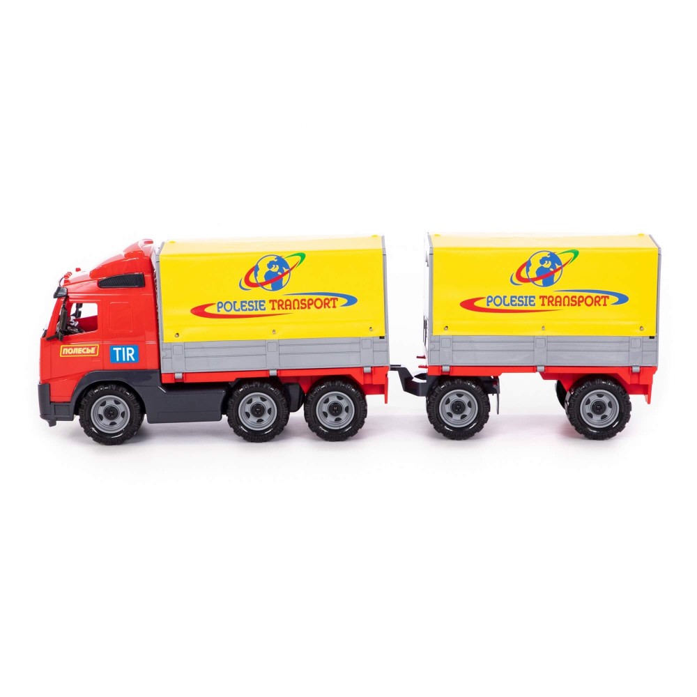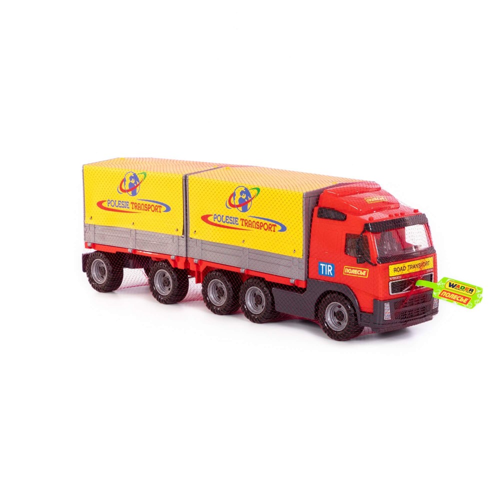 Автомобиль бортовой тентовой «Volvo» с прицепом от компании «Полесье» создан по подобию оригинального большегруза. Игрушка выполнена из качественного и надежного пластика. Автомобиль оснащён съёмным тентом и бортами, которые легко убрать. Таким образом, можно перевозить более габаритные грузы. К автомобилю крепится полуприцеп, что делает игрушку более функциональной. Играть автомобилем удобно как в помещении, так и на свежем воздухе.