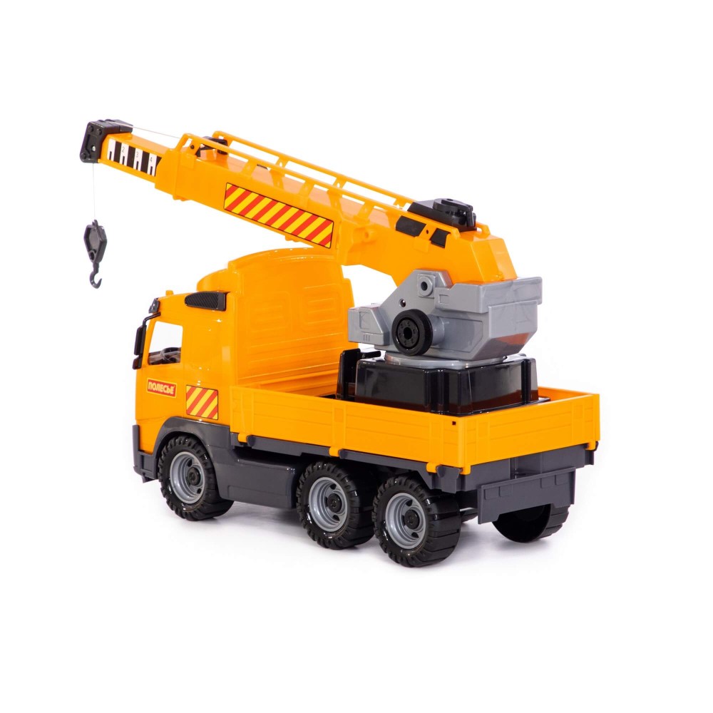 Автомобиль-кран уникален тем, что подъемный механизм работает как у настоящего крана. Платформа крана поворачивается на 360°. Стрела крана поднимается на 45° и выдвигается на 23 см. Трос в виде веревочки опускается с помощью лебёдки на 50 см. Кроме того, борта автомобиля можно открыть или снять. Автомобиль выполнен надёжно, имеет достойный внешний вид и относится к подарочной серии автомобилей.
