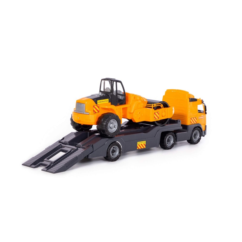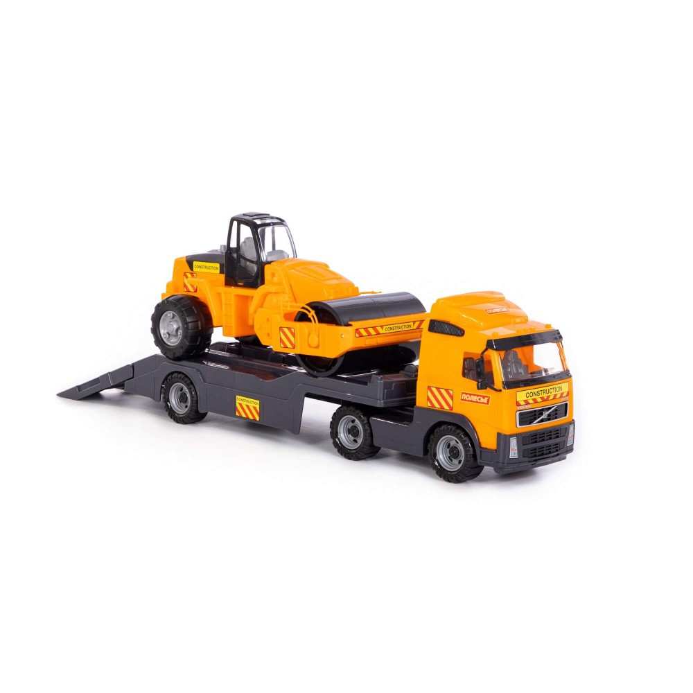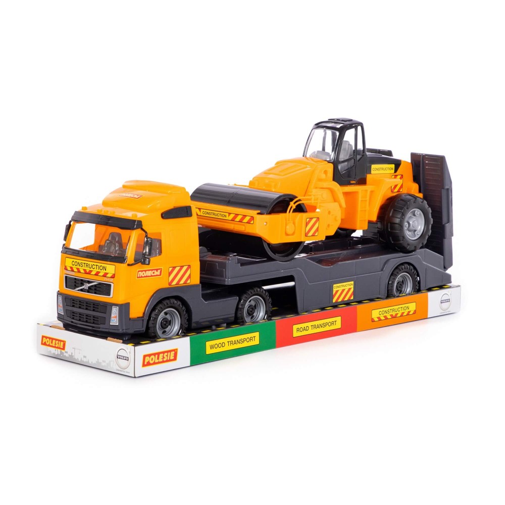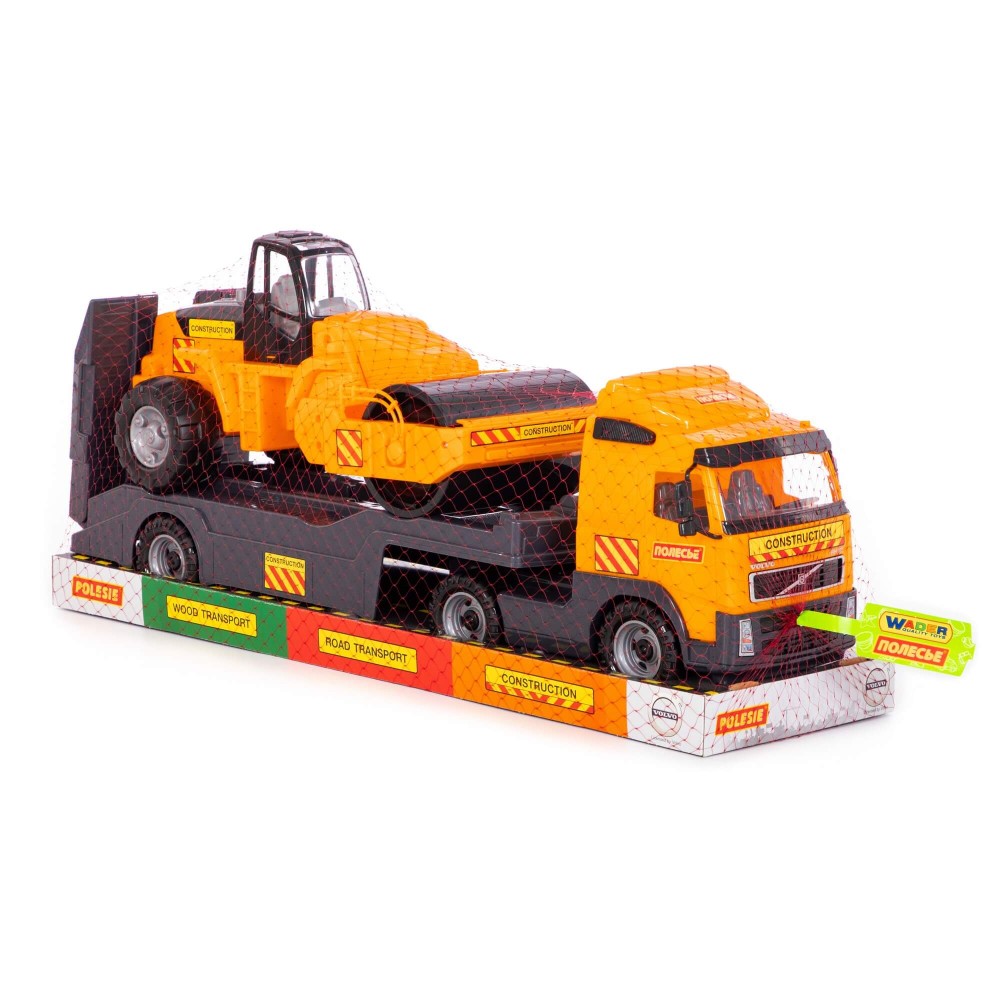 В одной упаковке — 2 игрушки! Это автомобиль-трейлер и дорожный каток. Внешний вид техники приближен к дизайну прототипов. Автомобиль и трактор выполнены из прочного, качественного пластика. Автомобиль-трейлер предназначен для перевозки различной техники, а на платформу помещается дорожный каток. Трейлер оснащён складным трапом. С таким комплектом можно разыгрывать различные сценарии, строить дорожное полотно и перевозить габаритные грузы. С набором автомобилей серии «Volvo» ребёнок больше узнает о большегрузной технике и её функционале.