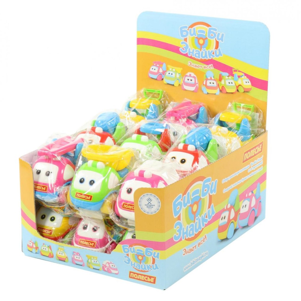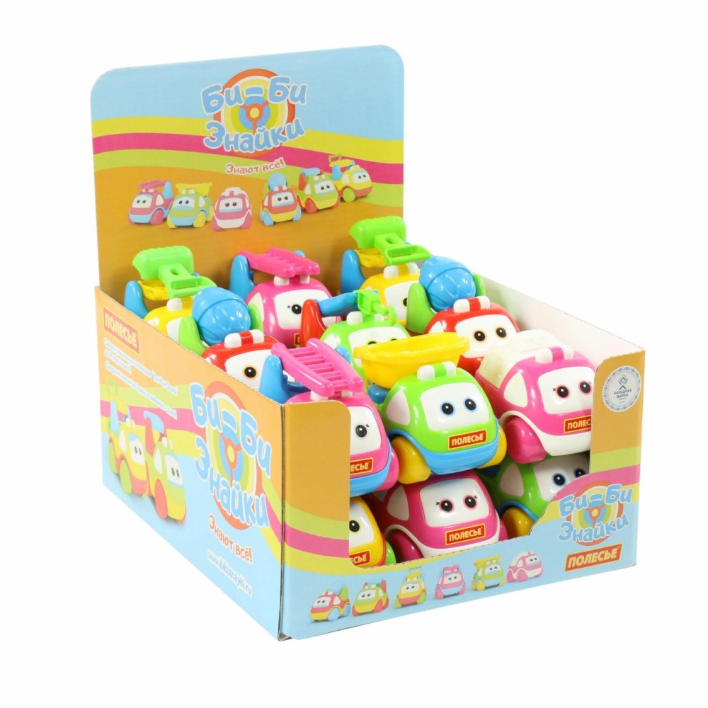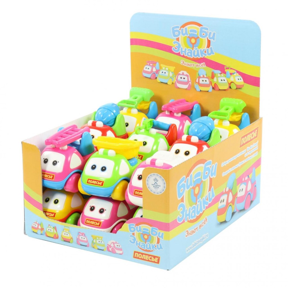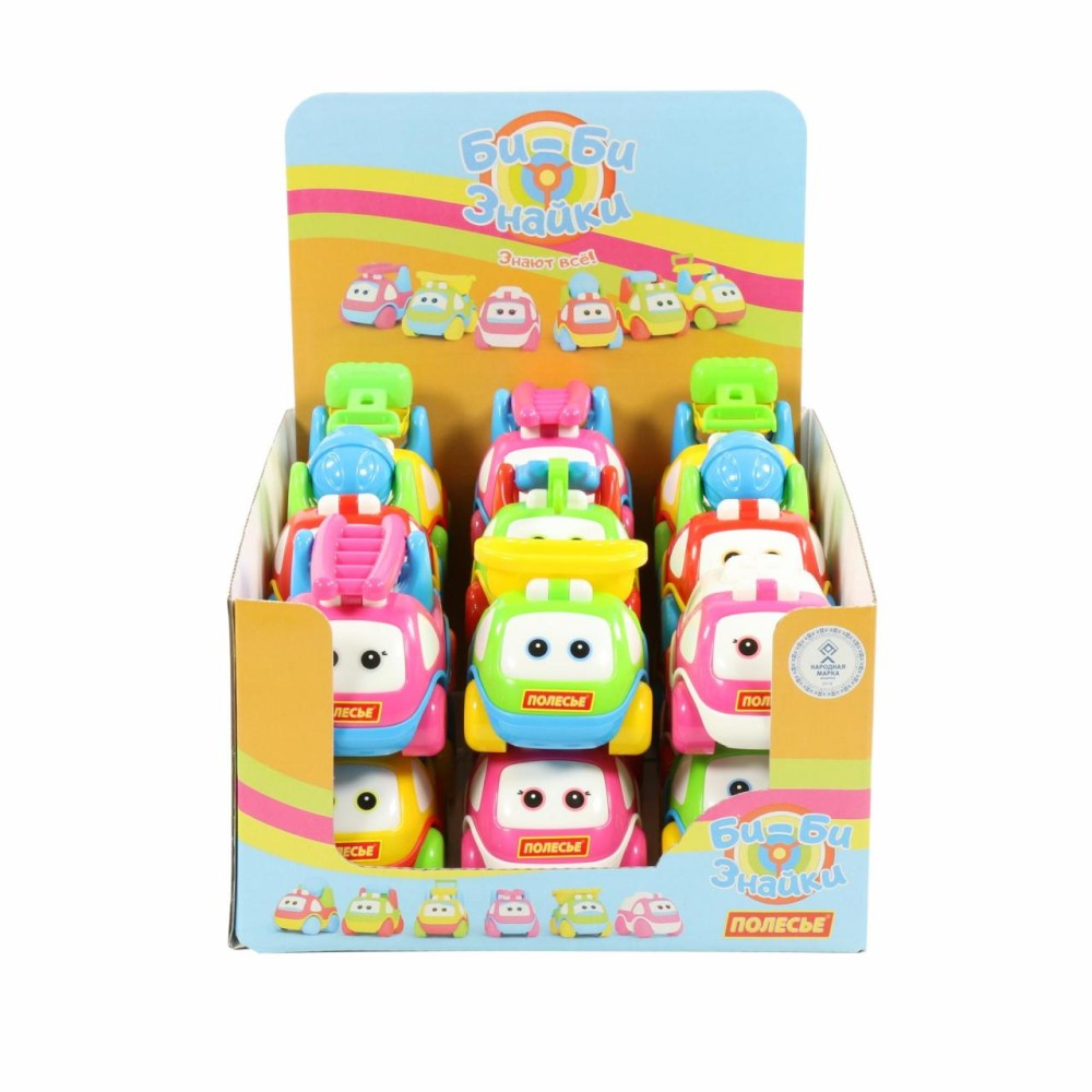 В дисплей от компании «Полесье» «Би-Би-Знайка» входят 18 автомобилей в пакетах.