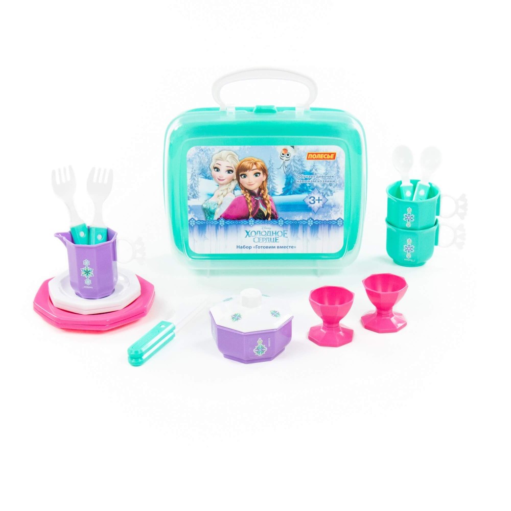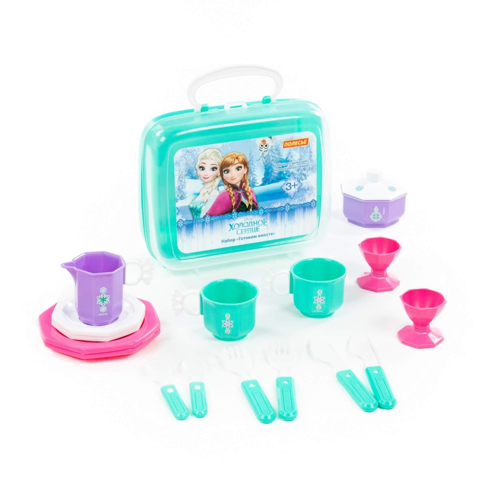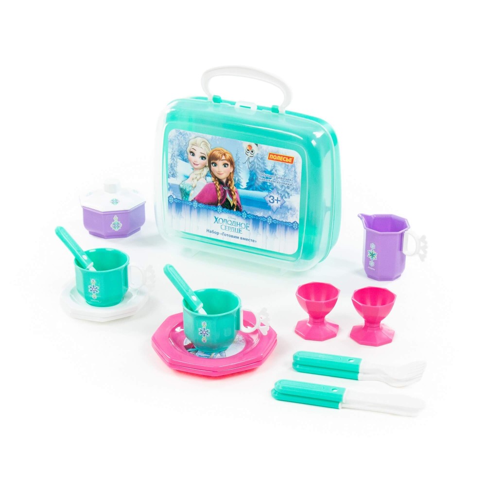 Компания «Полесье» предлагает стать маленьким шеф-поваром со стильным и функциональным набором Disney «Холодное сердце» — «Готовим вместе»! Комплект рассчитан на 2 порции и украшен наклейками с изображением героев красочного мультфильма. Набор знакомит ребёнка с кухонными принадлежностями, а девочка во время игры почувствует себя настоящей хозяйкой. В набор входят: