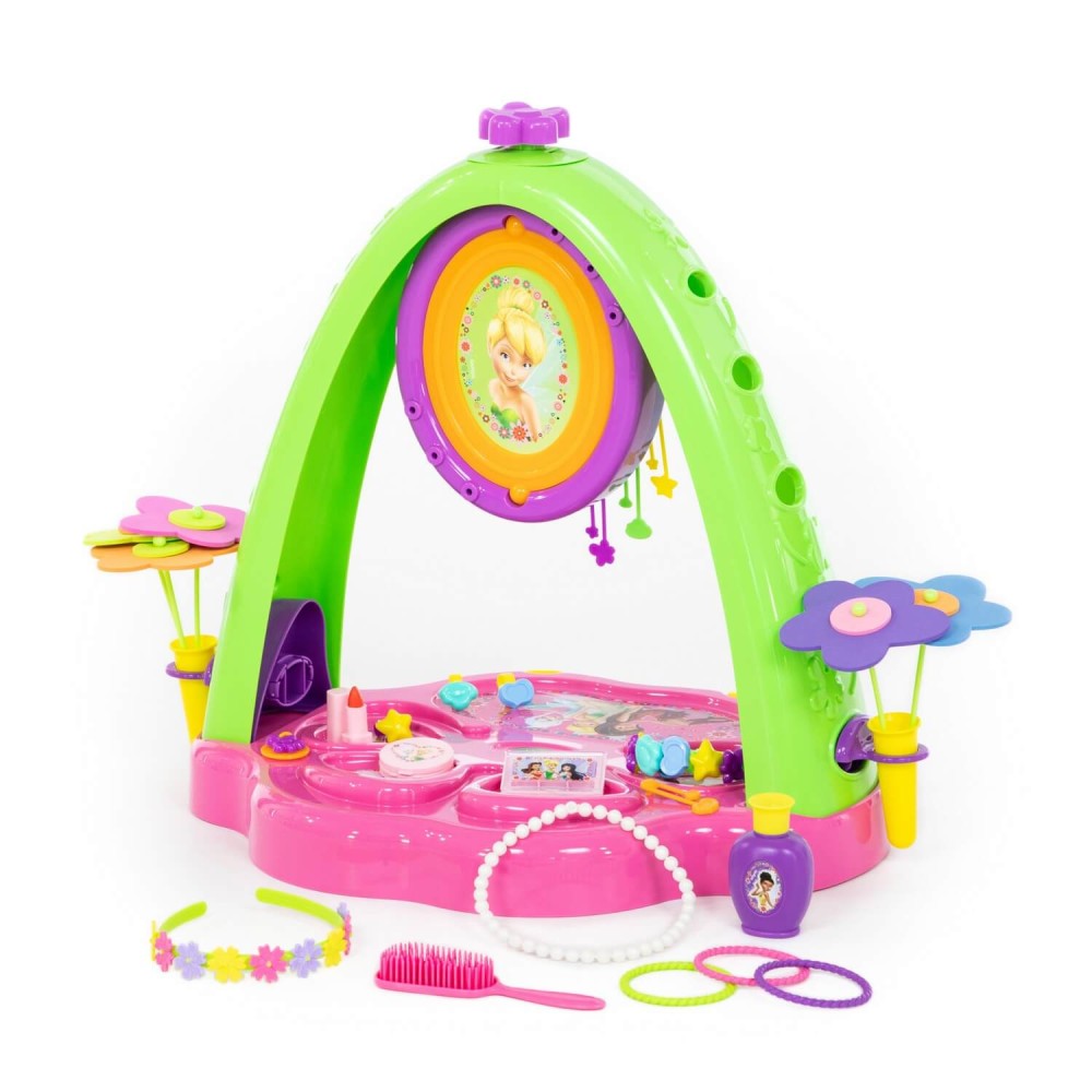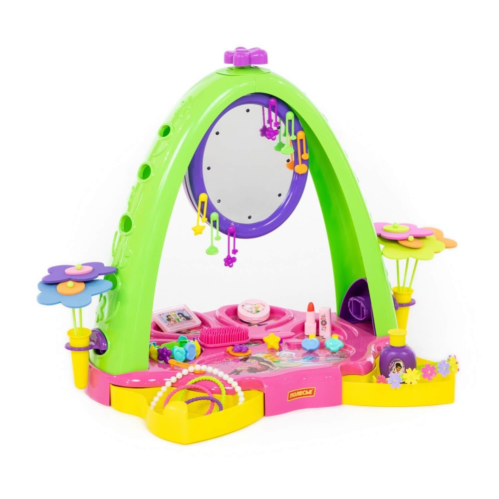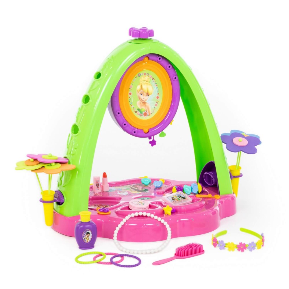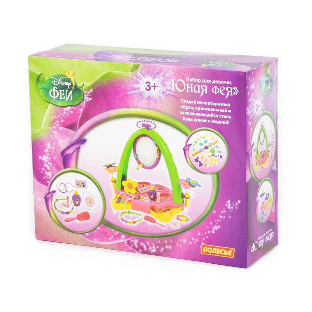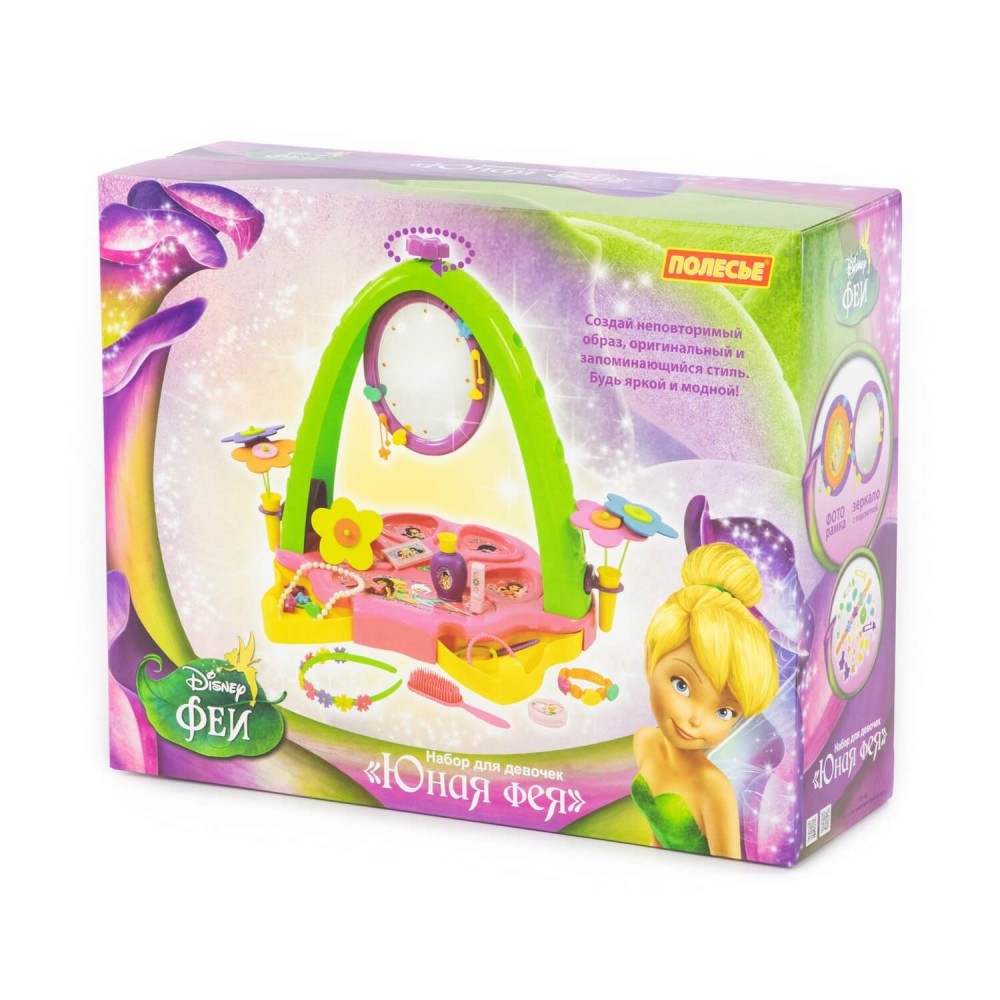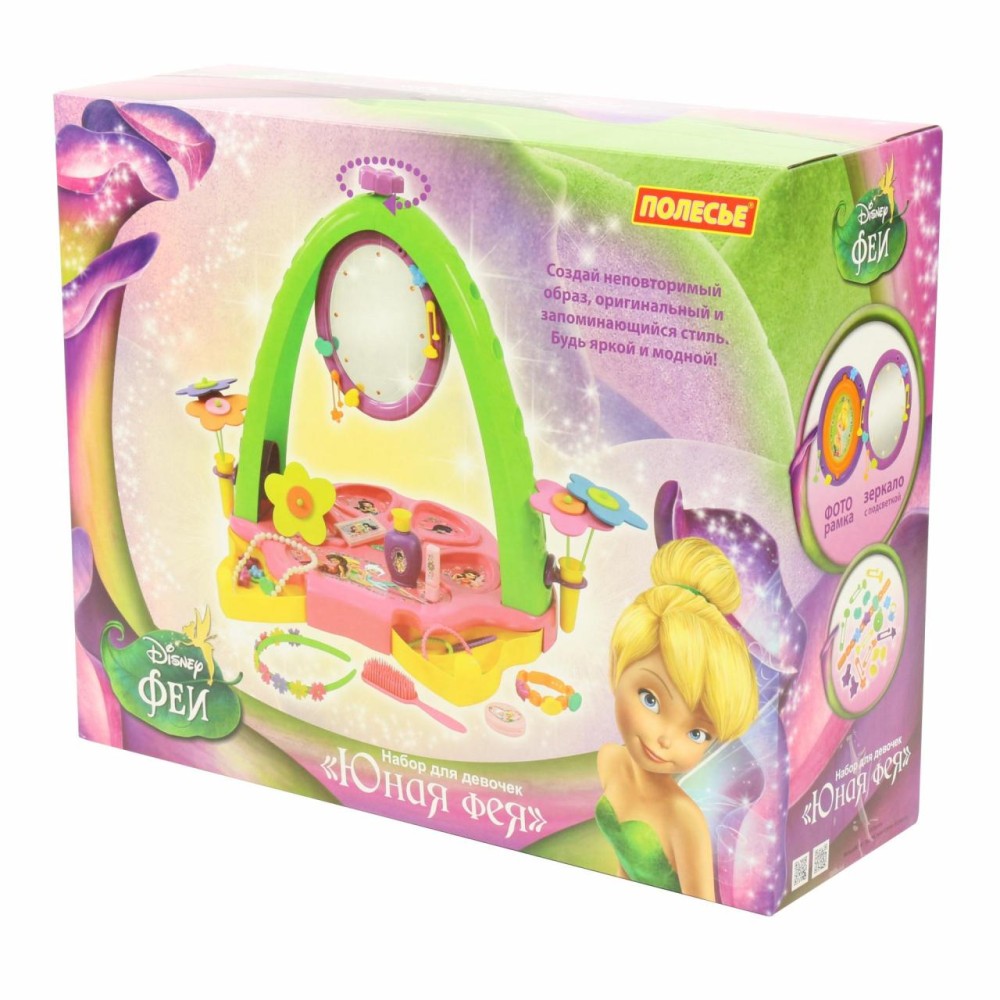 Окунись в волшебный мир фей вместе с новым набором от фабрики «Полесье»! Набор детских украшений и парикмахерских принадлежностей для маленьких красавиц от 3 лет станет отличным подарком для маленькой поклонницы анимационного фильма Disney «Феи». Комплекс оснащен зеркалом с подсветкой, двумя вазочками, двумя выдвижными полочками. С обратной стороны зеркала - фоторамка для любимой фотографии маленькой красавицы. Вазочки заполняются сборными цветочками (5 шт.). В набор украшений входят: браслет, клипсы, колечко и подвеска, которые малышка может собрать по своему вкусу и менять их цвет в зависимости от наряда. Деталями бижутерии можно украсить зеркальце, для этого в его рамке есть специальные отверстия. Порадует не только дочку, но и маму набор настоящих резиночек и заколок для волос. Набор упакован в красочную коробку с любимыми героями. Набор Disney "Юная фея" позволит девочке организовать свой салон красоты или парикмахерскую, придумывать новые образы и прически, развивая воображение и фантазию!