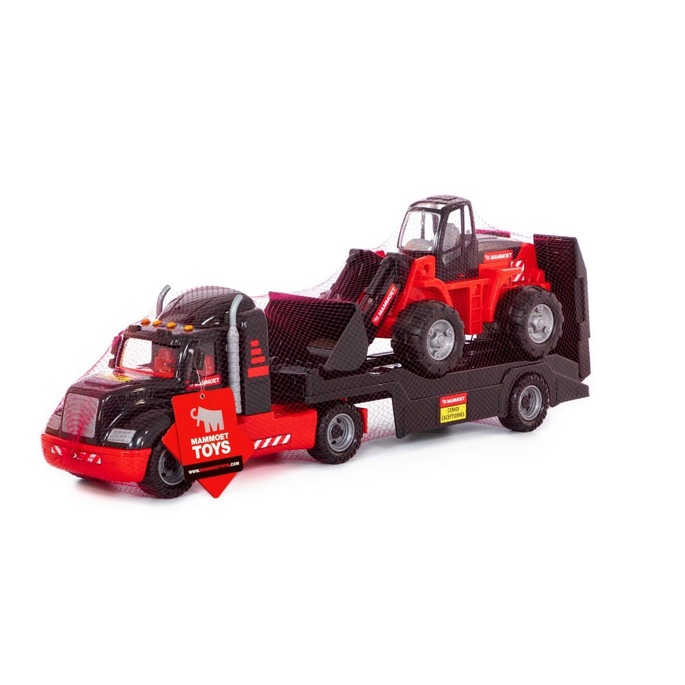 Шикарный подарочный набор, который состоит из большого автомобиля и большого трактора. Автомобиль-трейлер предназначен для перевозки различных автомобилей и техники длиной не более 43 см. Для удобства погрузки на трейлере установлен откидной трап. Полуприцеп при необходимости легко отцепить. Трактор-погрузчик, как и автомобиль, выполнен из надёжного долговечного материала, привлекает дизайном. Трактором можно играть в песочнице, на игровых площадках и дома. Набор выполнен в узнаваемых цветах компании МАММОЕТ, известной своей специализацией на тяжёлых подъёмных работах и транспортировке тяжёлых грузов по воде и по суше.