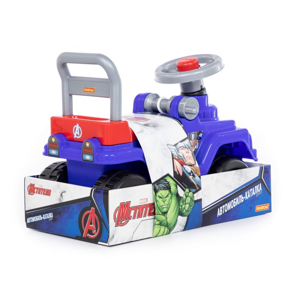 Автомобиль-каталка джип MARVEL «Мстители» создана по мотивам фильмов про любимых всеми супергероев. Каталка представлена в виде автомобиля, выполненного в узнаваемых цветах. Ребёнок может самостоятельно кататься на автомобиле, отталкиваясь ножками. Яркая каталка с удобной посадкой имеет багажник для небольших игрушек. Порадует ребёнка и звуковой сигнал на руле. Держась за спинку каталки, ребёнок может толкать её перед собой, совершенствуя навыки ходьбы. Катание развивает первоначальные движения и общую координацию малыша, способствует его физическому развитию. Автомобиль-каталка джип Marvel «Мстители» подойдёт для деток от 3 лет.