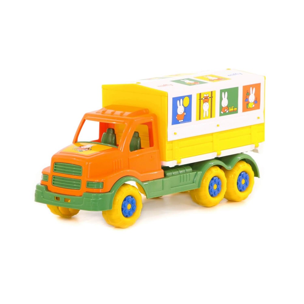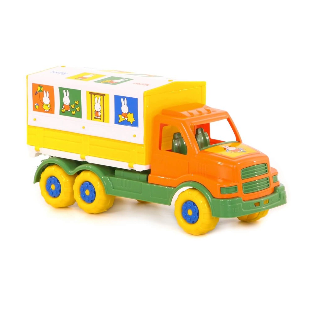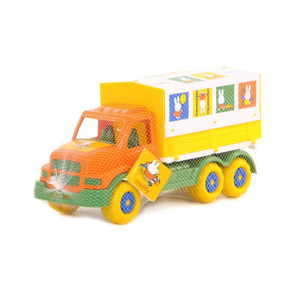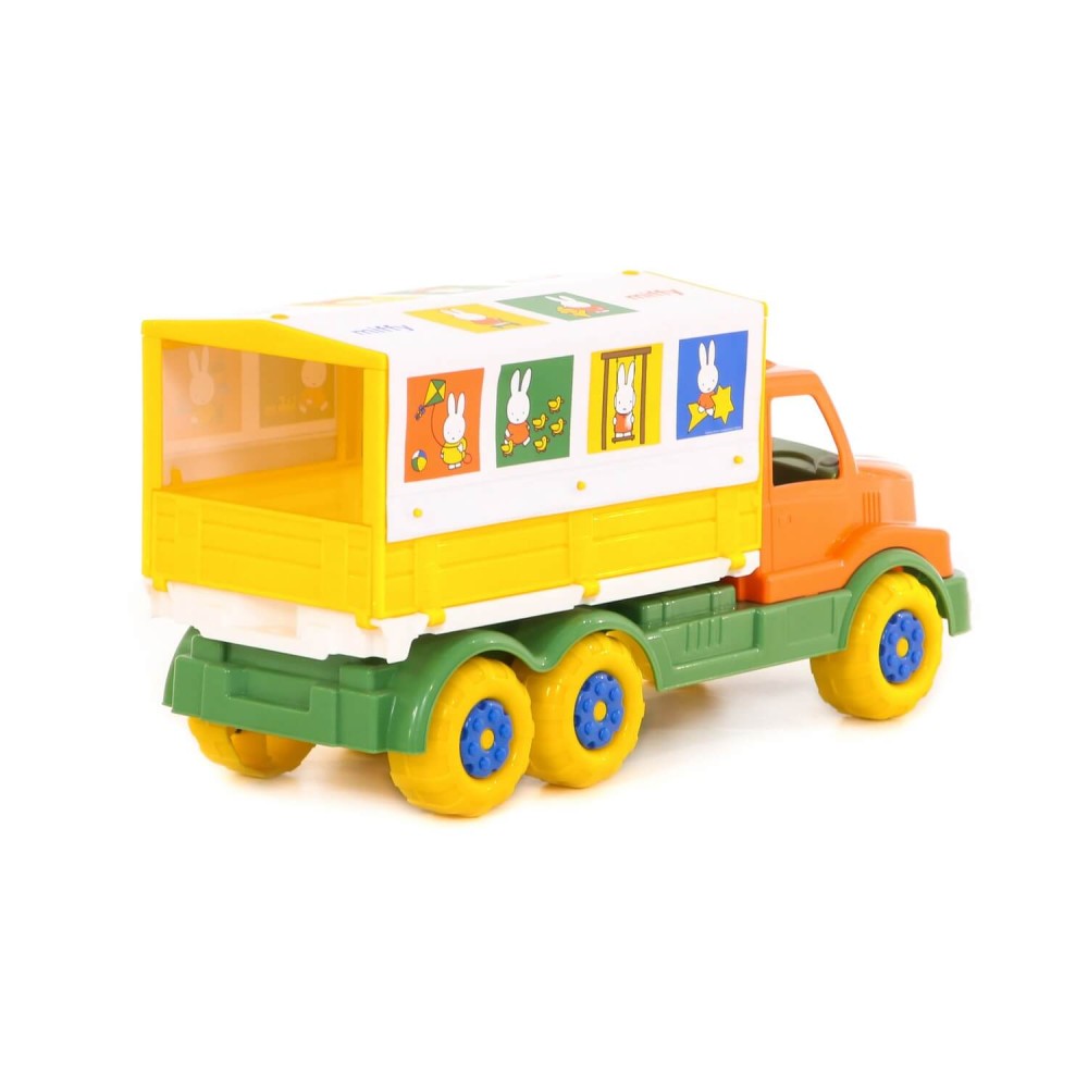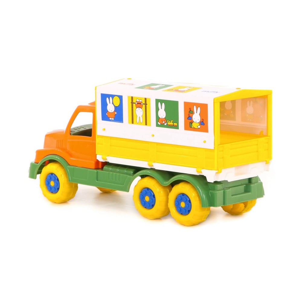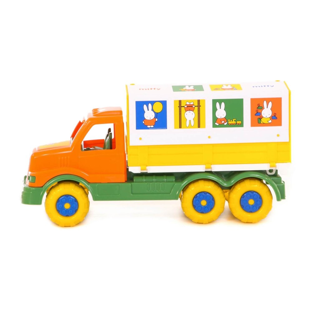 Фабрика по производству пластмассовых игрушек «Полесье» выпускает продукцию по лицензии «Миффи». Наклейки с изображением маленькой девочки-кролика украшают игрушки всей серии. Автомобиль с тентом — это грузовик, который имеет разборный кузов: борта откидываются, а тент снимается. Игрушка выполнена в узнаваемых цветах, она безопасна и способствует развитию малышей!