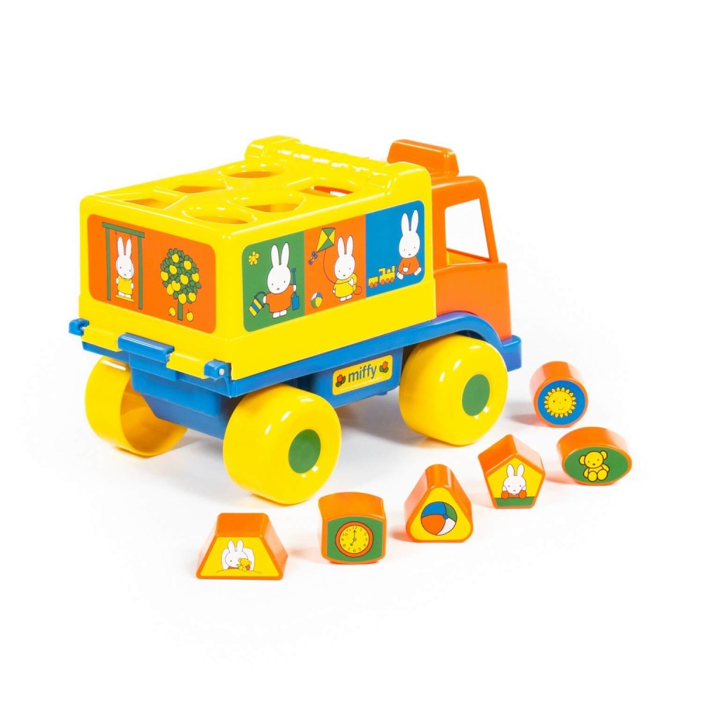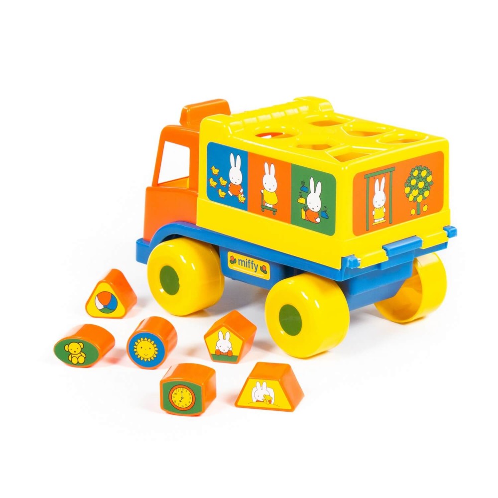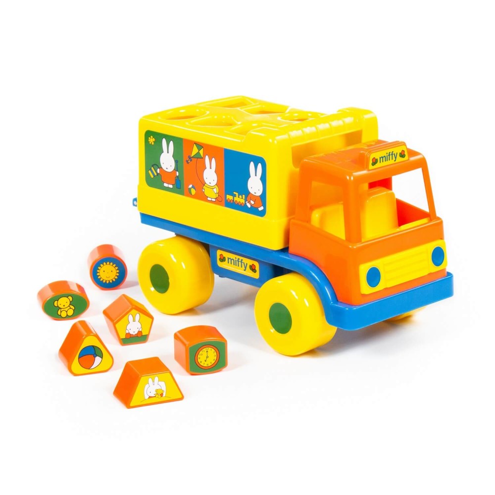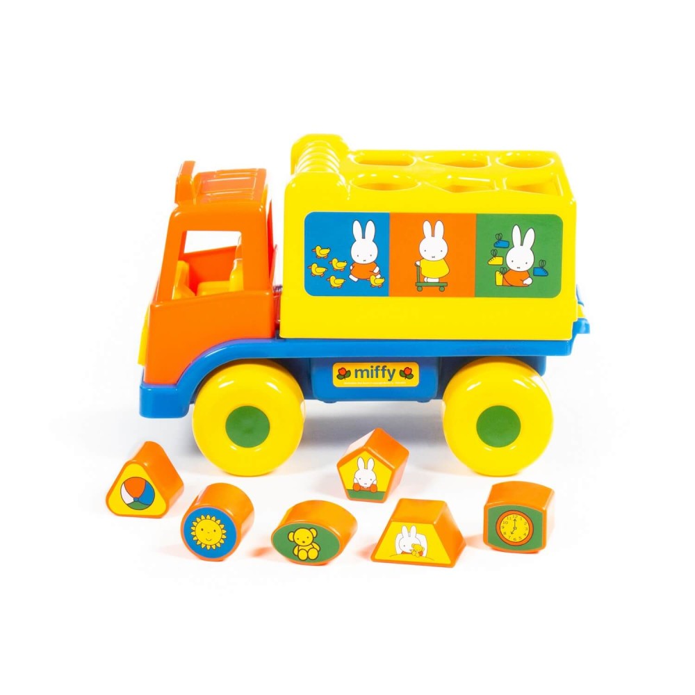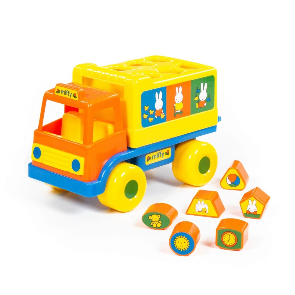 Фабрика по производству пластмассовых игрушек «Полесье» выпускает продукцию под брендом Миффи (Miffy). Маленькая девочка-кролик разнообразит игру и сделает её еще интереснее. Логический грузовичок "Миффи" с 6 кубиками №1 - это не просто грузовик, а развивающая игрушка для детей до 3-х лет. В кузове автомобиля логическая задачка - 6 отверстий-пазлов разных геометрических форм, для которых малышу нужно подобрать соответствующие фигуры. На фигурках имеются наклейки с картинками. Так же легко малыш достанет фигурки из кузова, потянув за отверстие возле кабины. Под крышкой кузова имеется углубление, ребёнок сможет перевозить не только фигурки из комплекта, но и другие мелкие игрушки и детали конструктора. Логический грузовичок "Миффи" надолго увлечет малыша, развивая при этом пространственное мышление, воображение, логику, мелкую моторику рук ребёнка.