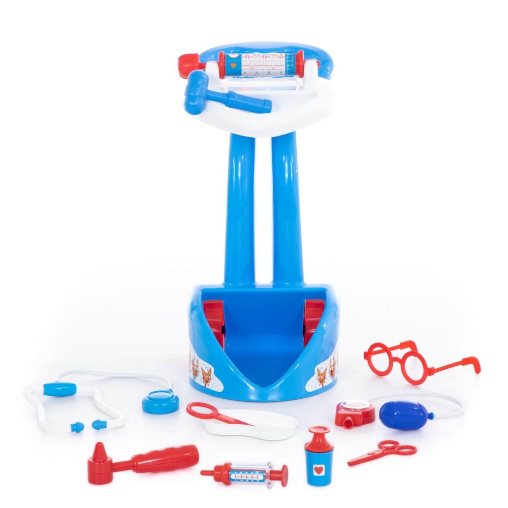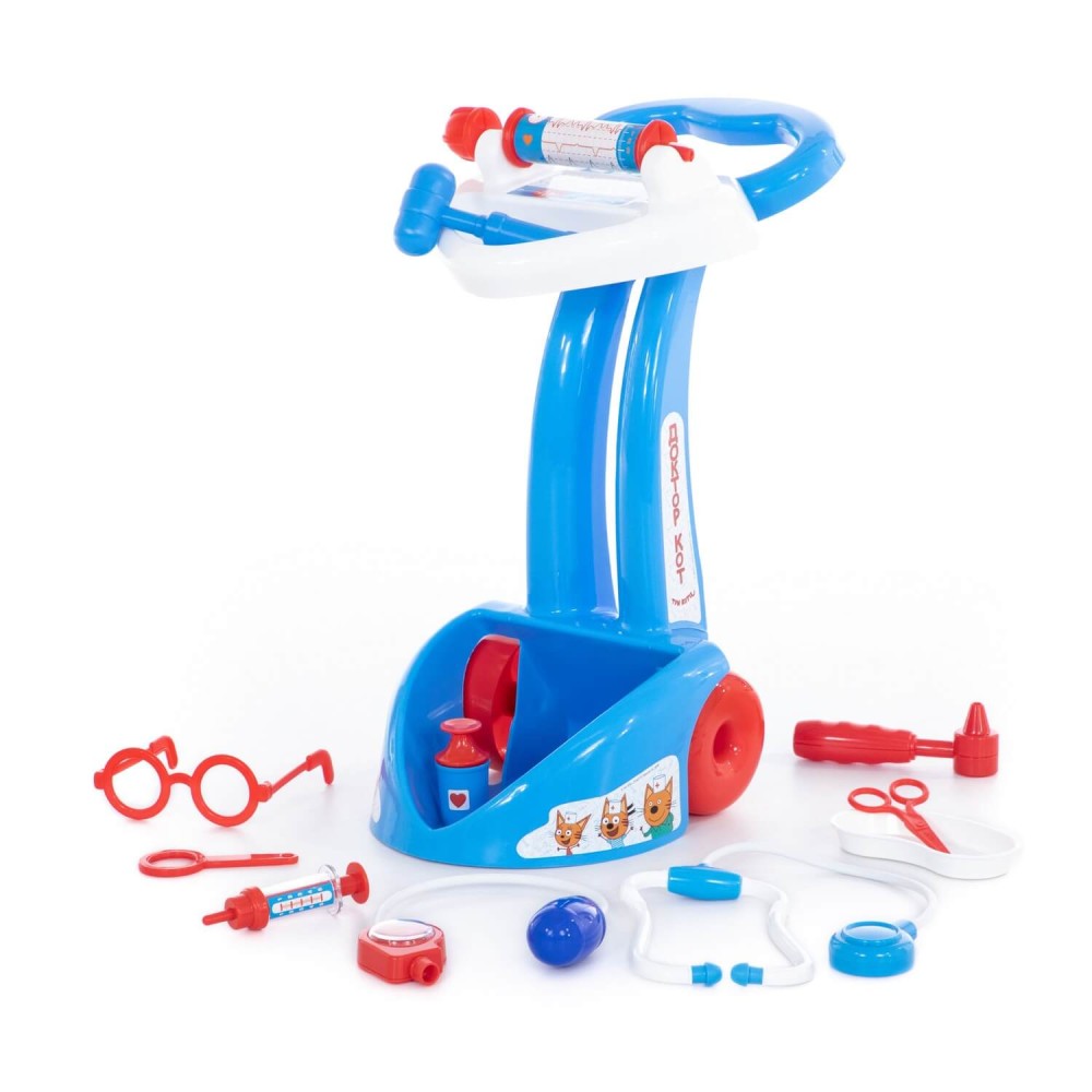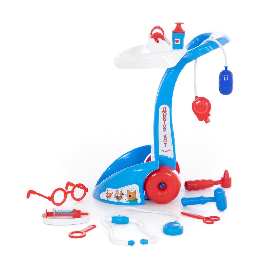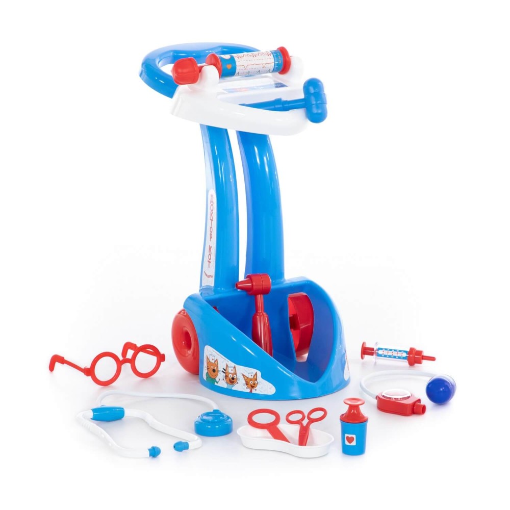 Игровой набор «Доктор Кот» от фабрики «Полесье» представлен в виде игровой панели на тележке. Это как «скорая помощь», что позволяет оперативно помочь пациенту. На тележке удобно хранить и перемещать медицинские инструменты. Набор знакомит с профессией врача и с основными принадлежностями доктора. В игровой набор входят: ножницы, очки, лупа, шприц, лоток для инструментов, стетоскоп (для прослушивания сердца и лёгких), тонометр (для измерения давления), отоскоп (инструмент лор-врача), кардиограф, молоточек и баночка с крышкой. Набор украшен тематическими наклейками с изображением забавных персонажей мультсериала «Три кота». Комплект упакован в красочную коробку.