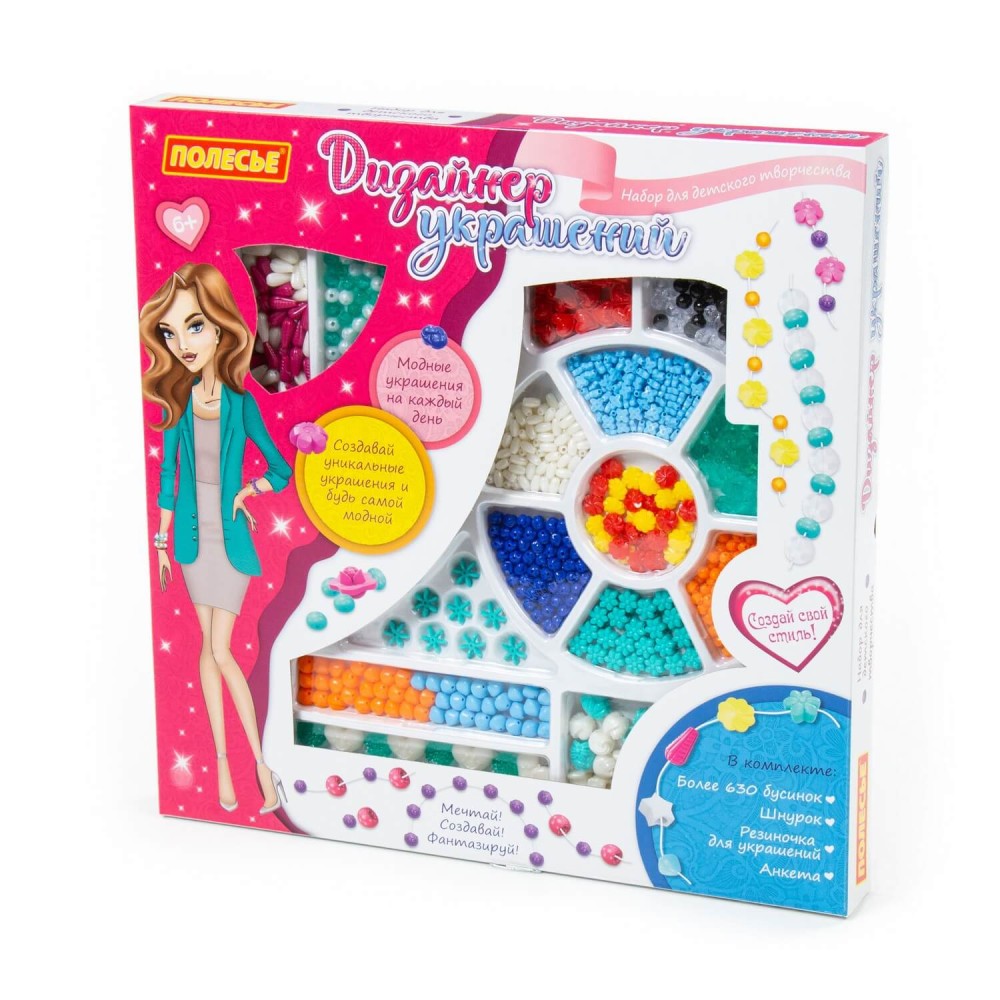 Набор для детского творчества "Дизайнер украшений" (640 элементов) (в коробке) от фабрики "Полесье" позволит ребёнку почувствовать себя настоящим дизайнером бижутерии, а также научит создавать удивительные аксессуары! В комплект входит более 600 бусинок, шнурок и резиночка для украшений. Все бусины имеют разную форму и цвет, выполнены из качественного пластика. Разнообразит игру и сделает её ещё интереснее анкета модницы, которая также входит в комплект. С таким набором ребёнок сможет фантазировать, творить, создавать своими руками и играть. Он способствует разностороннему развитию ребёнка.