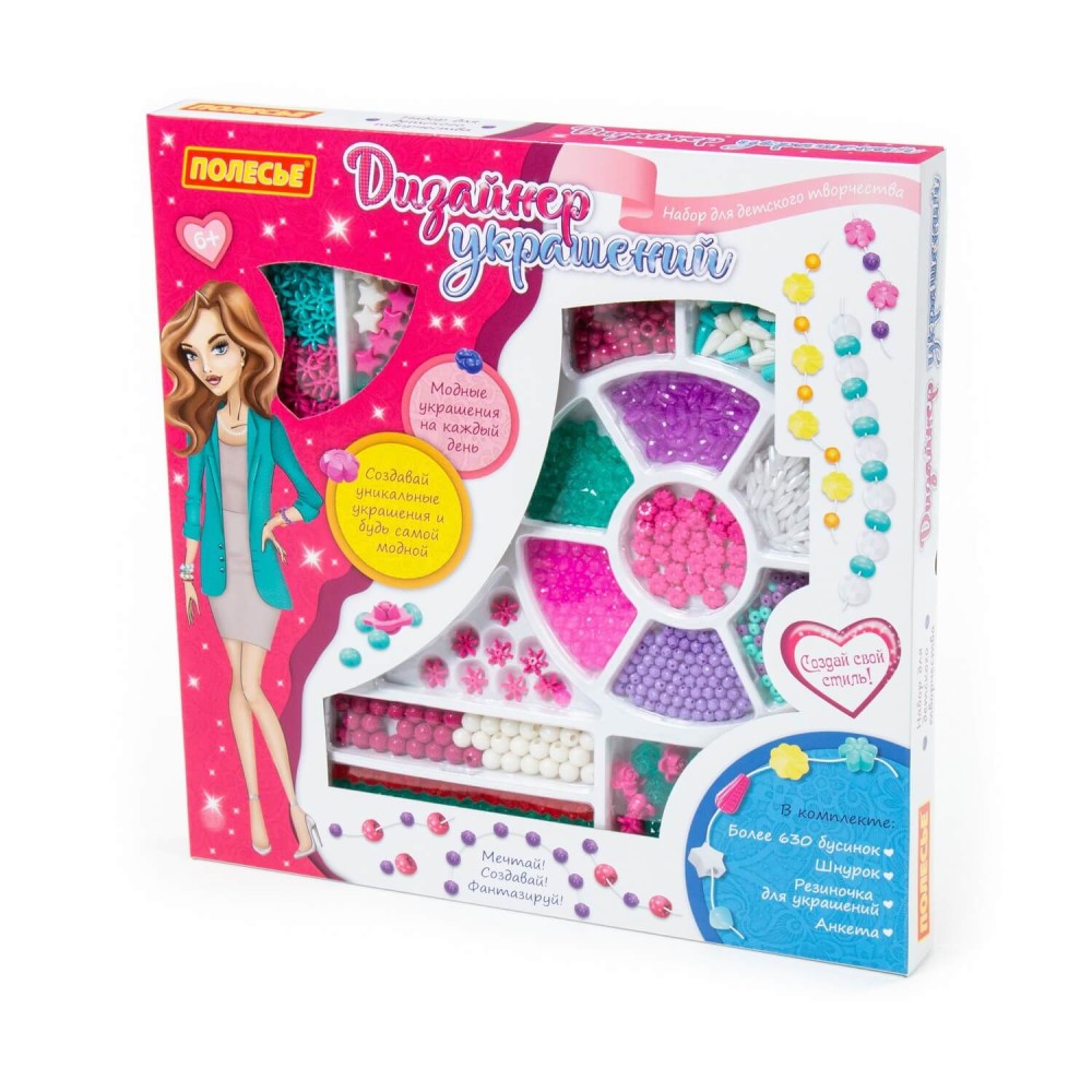 Набор для детского творчества "Дизайнер украшений" (777 элементов) (в коробке) от фабрики "Полесье" позволит ребёнку почувствовать себя настоящим дизайнером бижутерии, а также научит создавать удивительные аксессуары! В комплект входит более 700 бусинок, шнурок и резиночка для украшений. Все бусины имеют разную форму и цвет, выполнены из качественного пластика. Разнообразит игру и сделает её ещё интереснее анкета модницы, которая также входит в комплект. С таким набором ребёнок сможет фантазировать, творить, создавать своими руками и играть. Он способствует разностороннему развитию ребёнка.