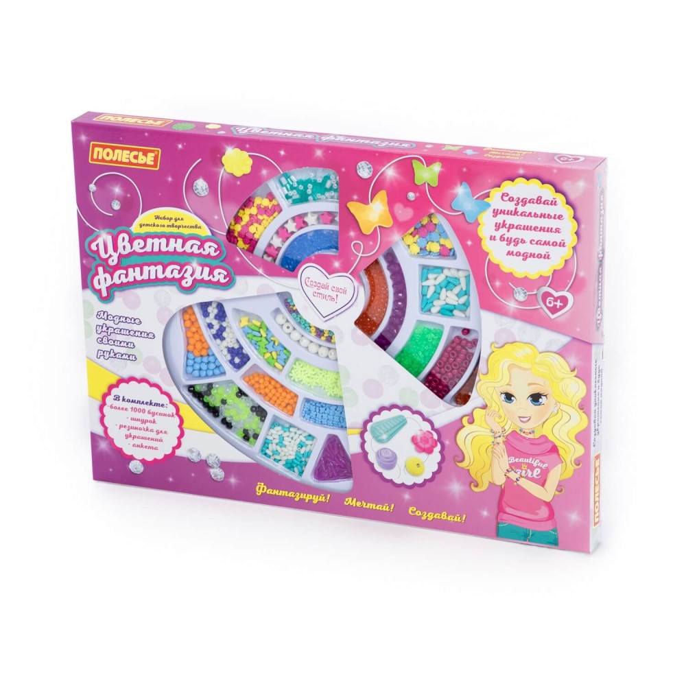 Набор для детского творчества "Цветная фантазия" (1118 элементов) (в коробке) от фабрики "Полесье" позволит ребёнку почувствовать себя настоящим дизайнером бижутерии, а также научит создавать удивительные аксессуары! В комплект входит более 1000 бусинок, шнурок и резиночка для украшений. Все бусины имеют разную форму и цвет, выполнены из качественного пластика. Разнообразит игру и сделает её ещё интереснее анкета модницы, которая также входит в комплект. С таким набором ребёнок сможет фантазировать, творить, создавать своими руками и играть. Он способствует разностороннему развитию ребёнка.