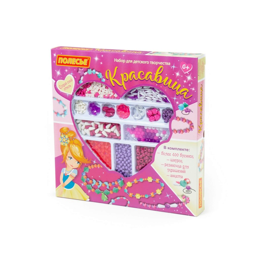 Наборы для детского творчества "Красавица" (535 элементов) (в коробке) от фабрики "Полесье" позволит ребёнку почувствовать себя настоящим дизайнером бижутерии, а также научит создавать удивительные аксессуары! В комплект входит более 500 бусинок, шнурок и резиночка для украшений. Все бусины имеют разную форму и цвет, выполнены из качественного пластика. Разнообразит игру и сделает её ещё интереснее анкета модницы, которая также входит в комплект. С таким набором ребёнок сможет фантазировать, творить, создавать своими руками и играть. Он способствует разностороннему развитию ребёнка.