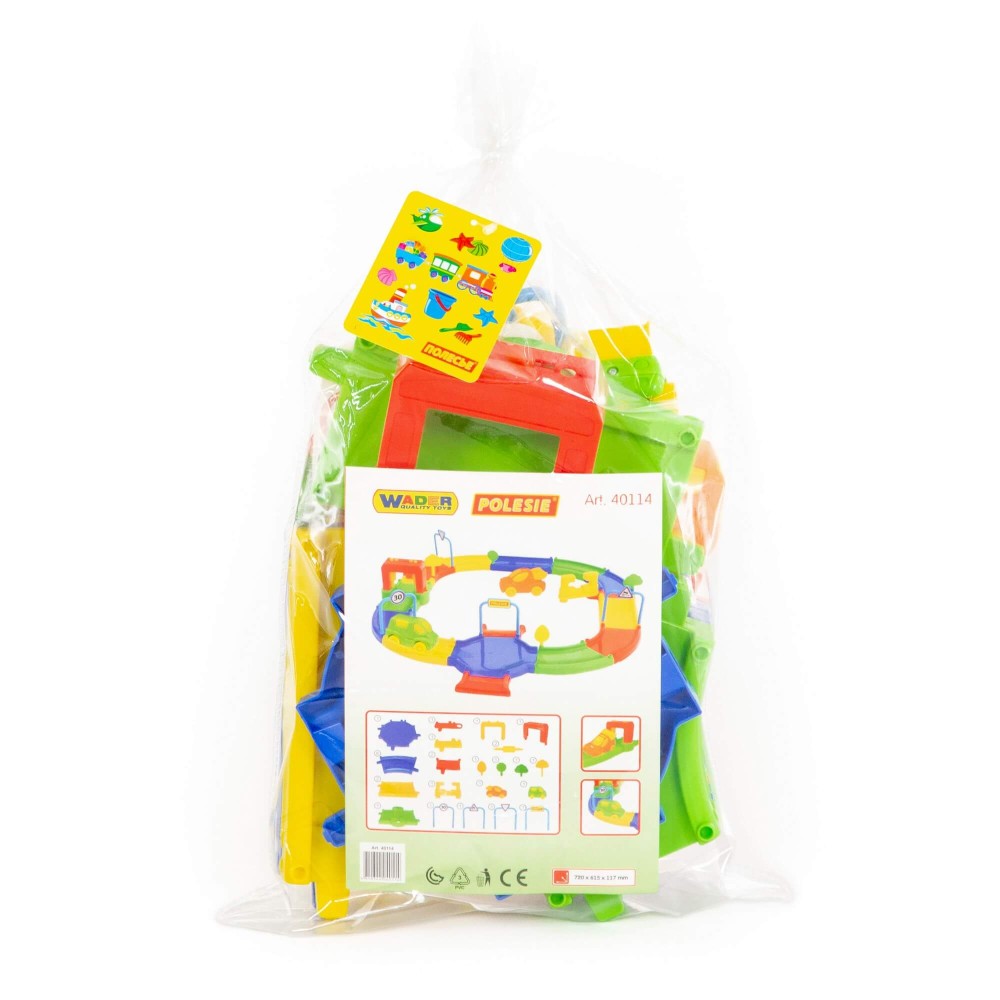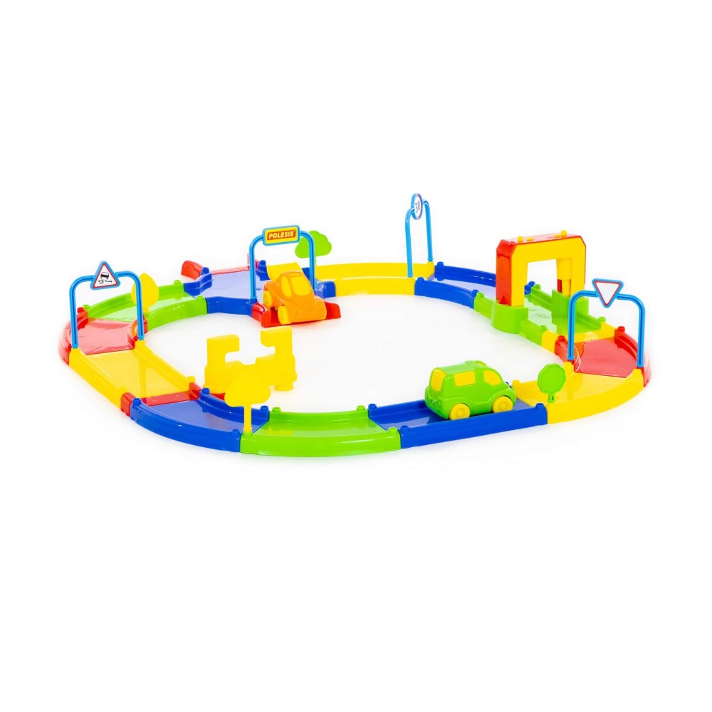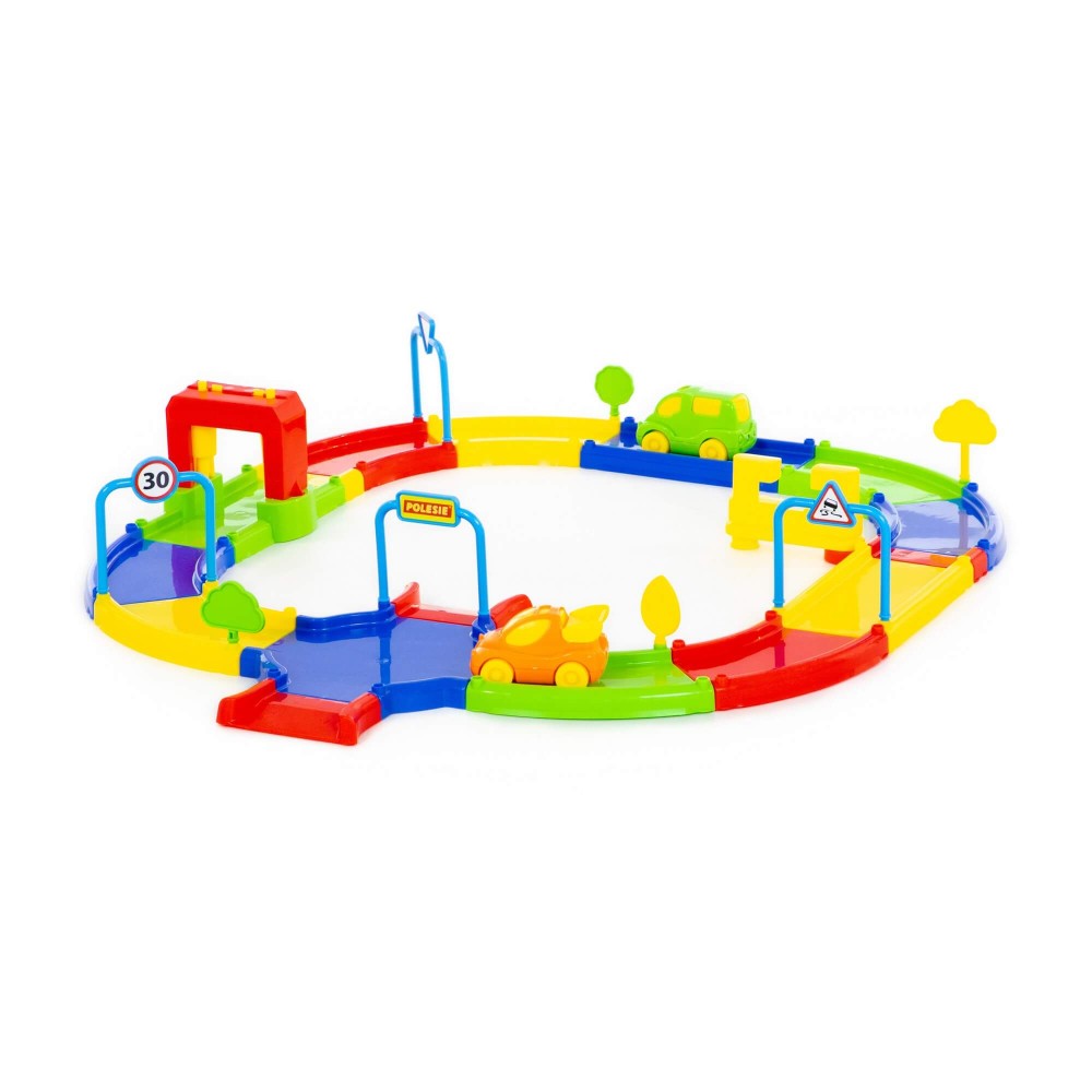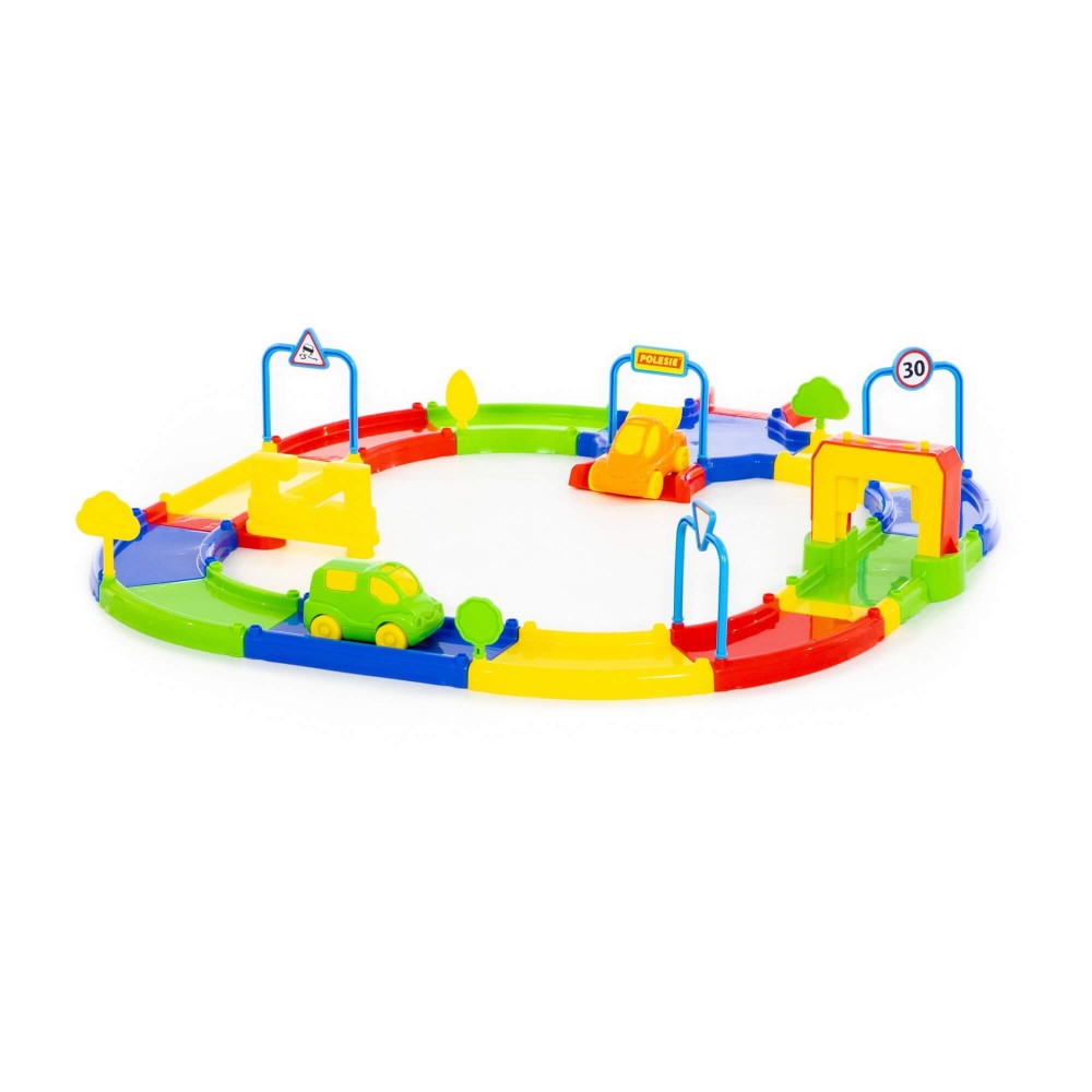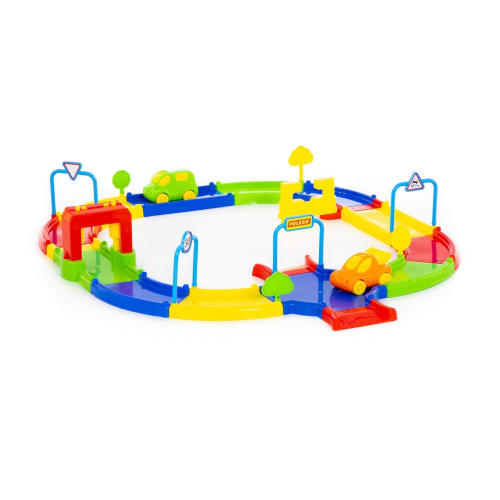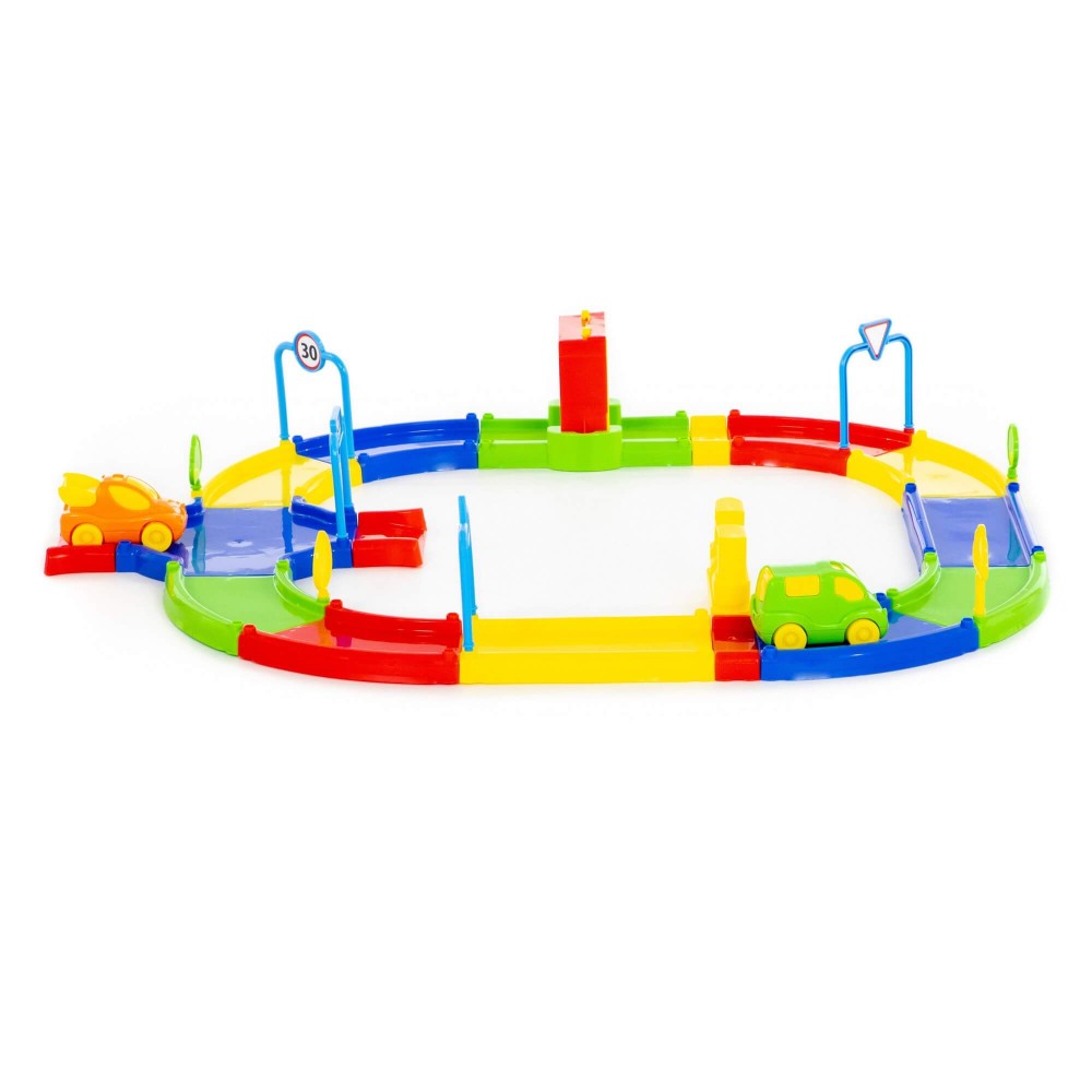 Игровой комплекс представлен в виде яркого сборного гоночного трека. Все элементы имеют округлую форму деталей и выполнены из качественных материалов, благодаря этому игрушка максимально безопасна. В комплекте с треком идут: 4 дорожных знака, 4 дерева, 2 автомобиля, а также наклейки. Гоночный трек собирается из 31 элемента, они позволяют дополнительно создать автомойку и автозаправку. Такой комплекс позволит придумывать различные сценарии игры, развивать фантазию и весело проводить время.