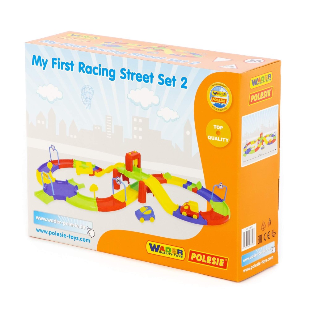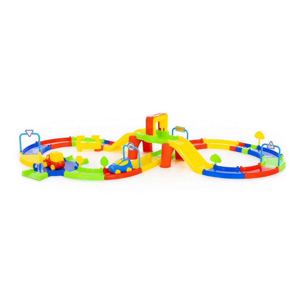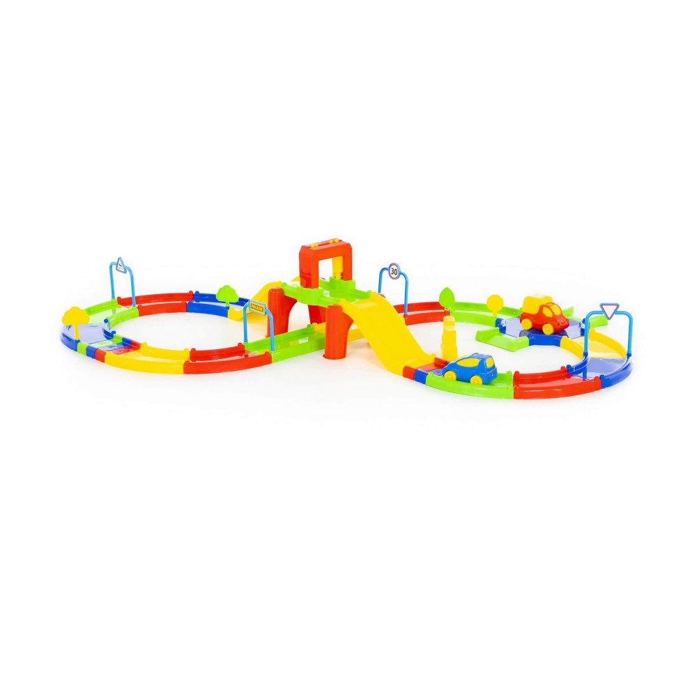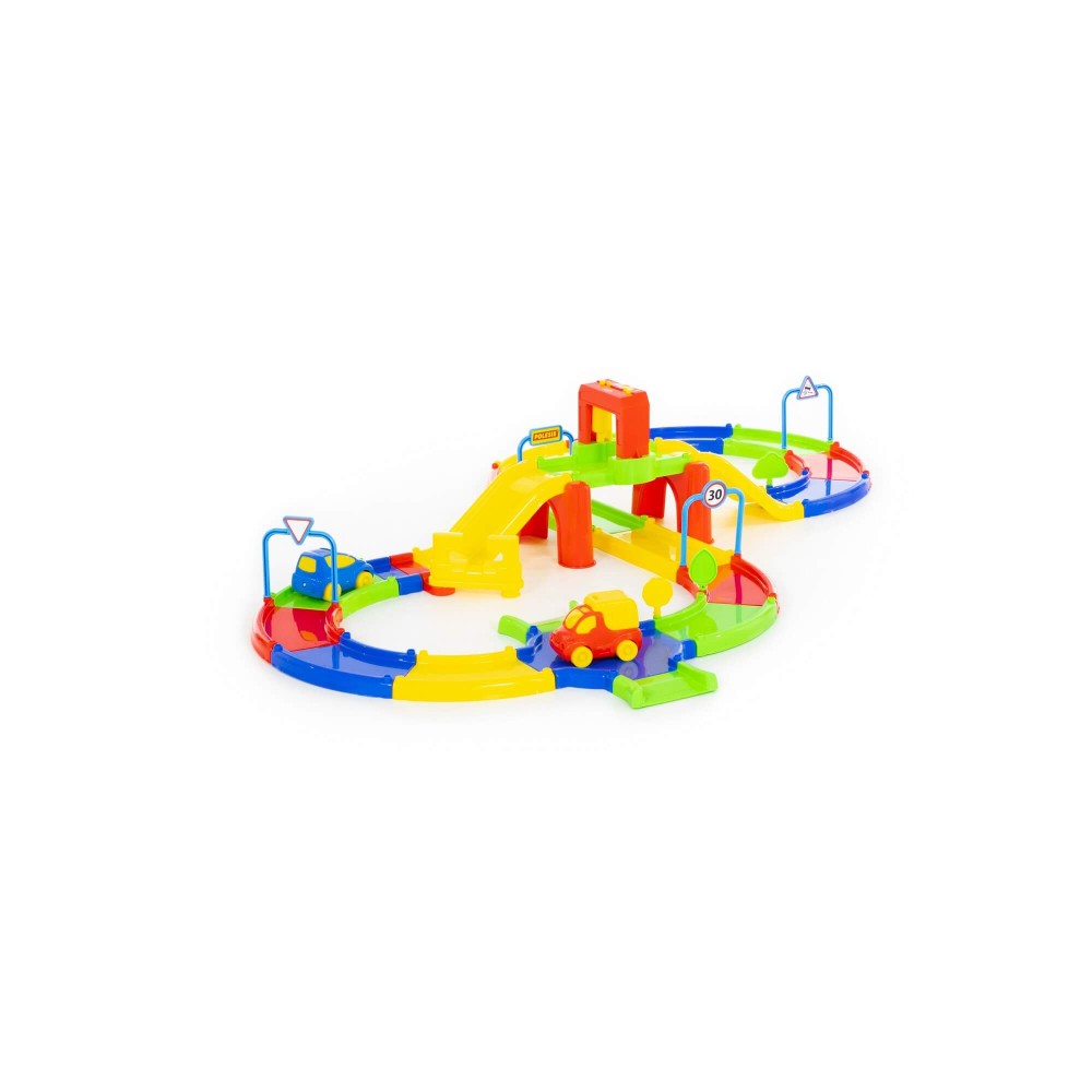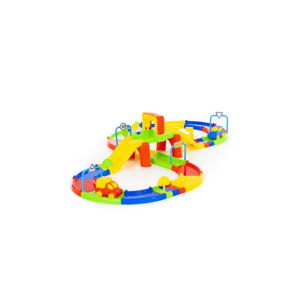 Игровой комплекс представлен в виде яркого сборного гоночного трека. Все элементы имеют округлую форму деталей и выполнены из качественных материалов, благодаря этому игрушка максимально безопасна. В комплекте с треком идут: 4 дорожных знака, 4 дерева, 2 автомобиля, а также наклейки. Гоночный трек собирается из 42 элементов, позволяющих дополнительно создать автомойку и автозаправку. Такой комплекс позволит придумывать различные сценарии игры, развивать фантазию и весело проводить время.