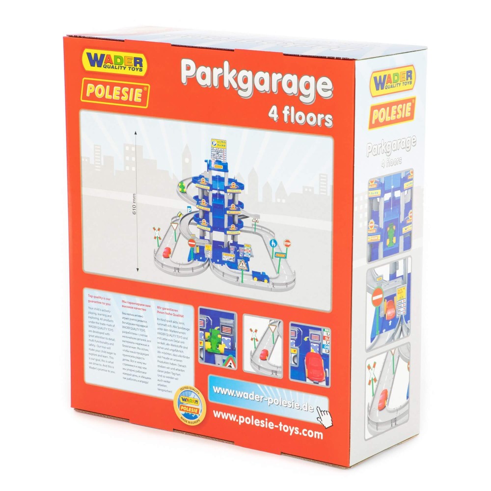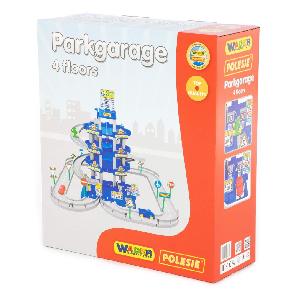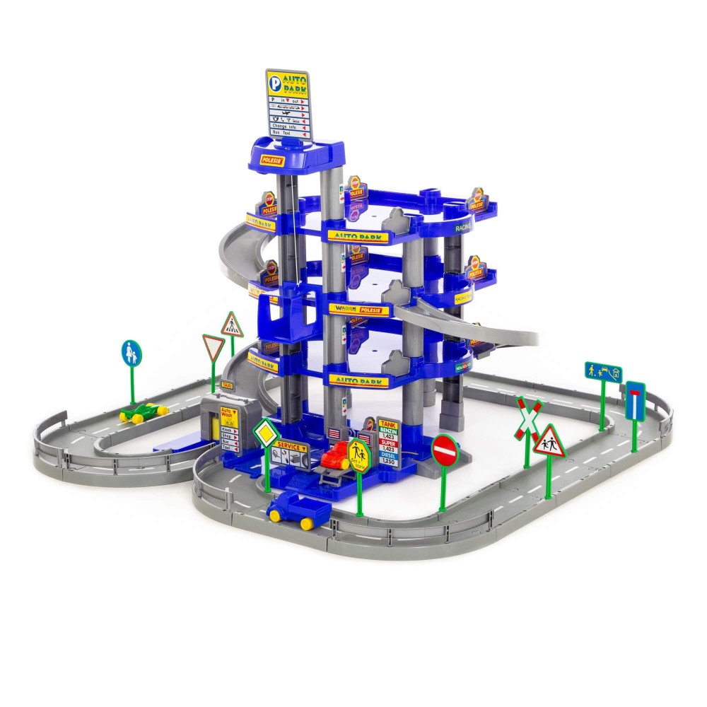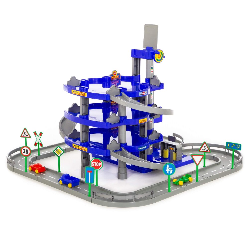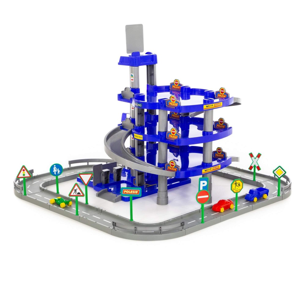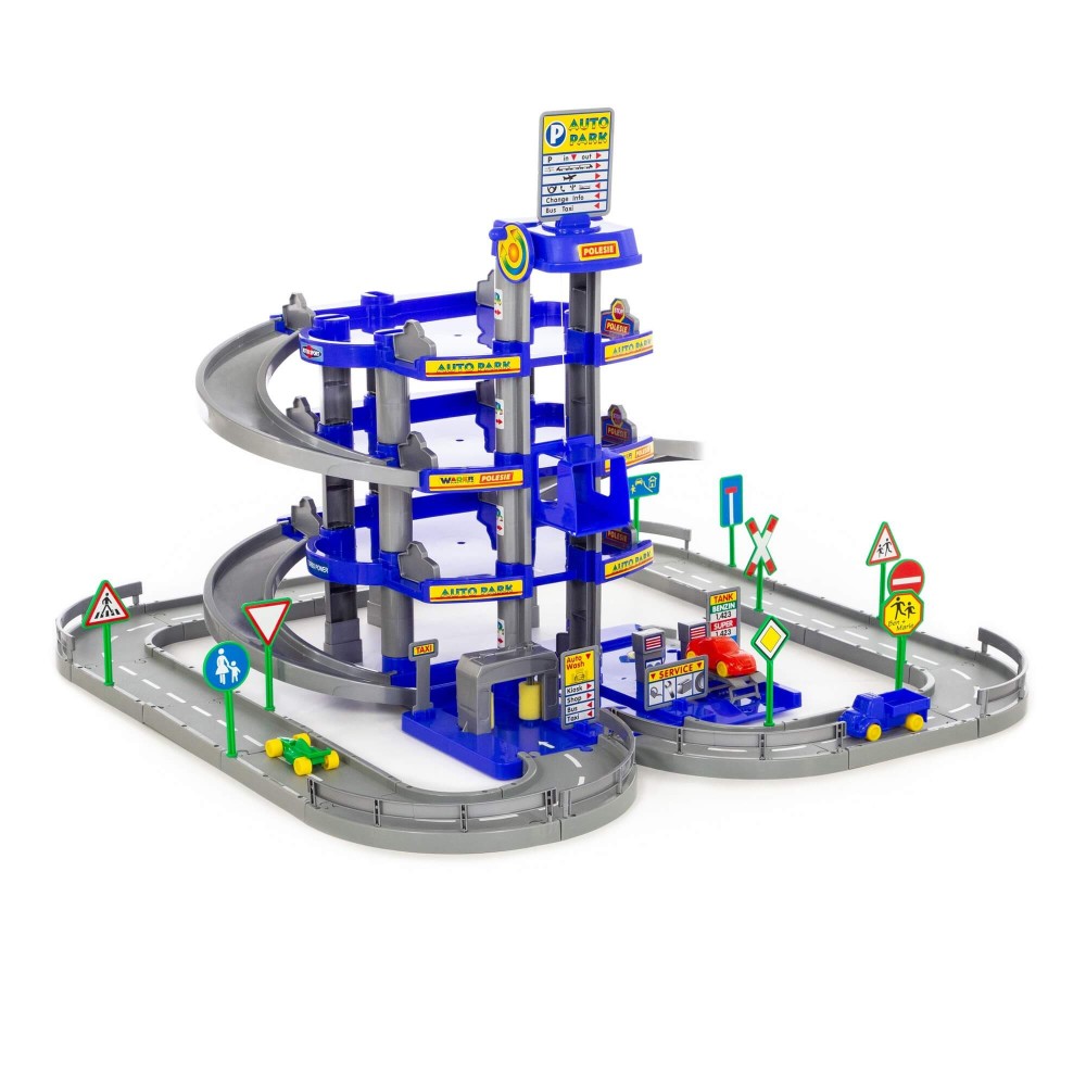 Красивый четырехуровневый паркинг с тремя мини-автомобилями, дорогой и дорожными знаками (10 шт.). На первом уровне паркинга расположены автомойка, автозаправка, автосервис с эстакадой. На остальные уровни автомобили поднимаются на лифте с ручным приводом, то есть для движения лифта ребенку нужно поворачивать рукоятку на верхнем уровне.