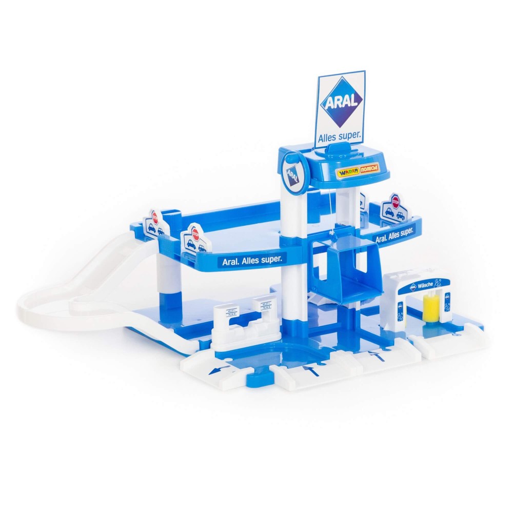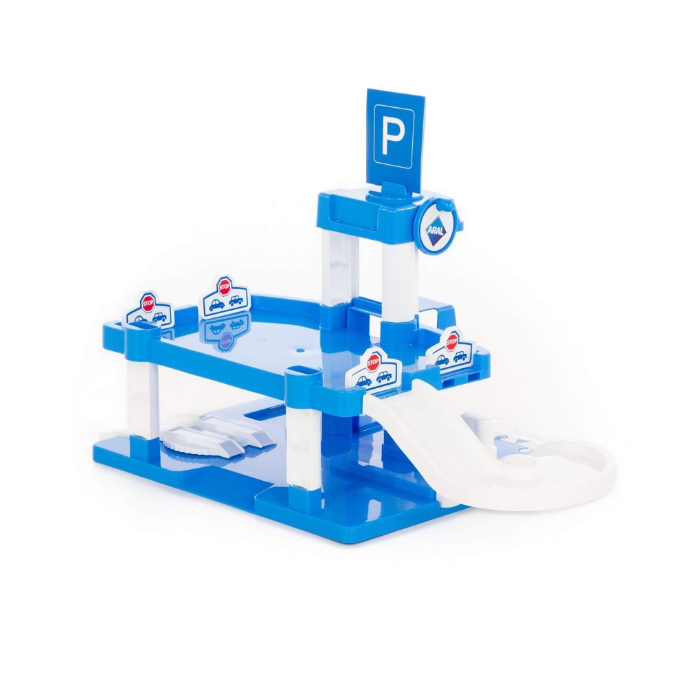 Компактный паркинг в два уровня. На первом уровне паркинга расположены автомойка, автозаправка, эстакада. Для подъема на второй уровень установлен лифт, который приводится в движение с помощью рукоятки на верхнем уровне. Автомобили в набор не входят.