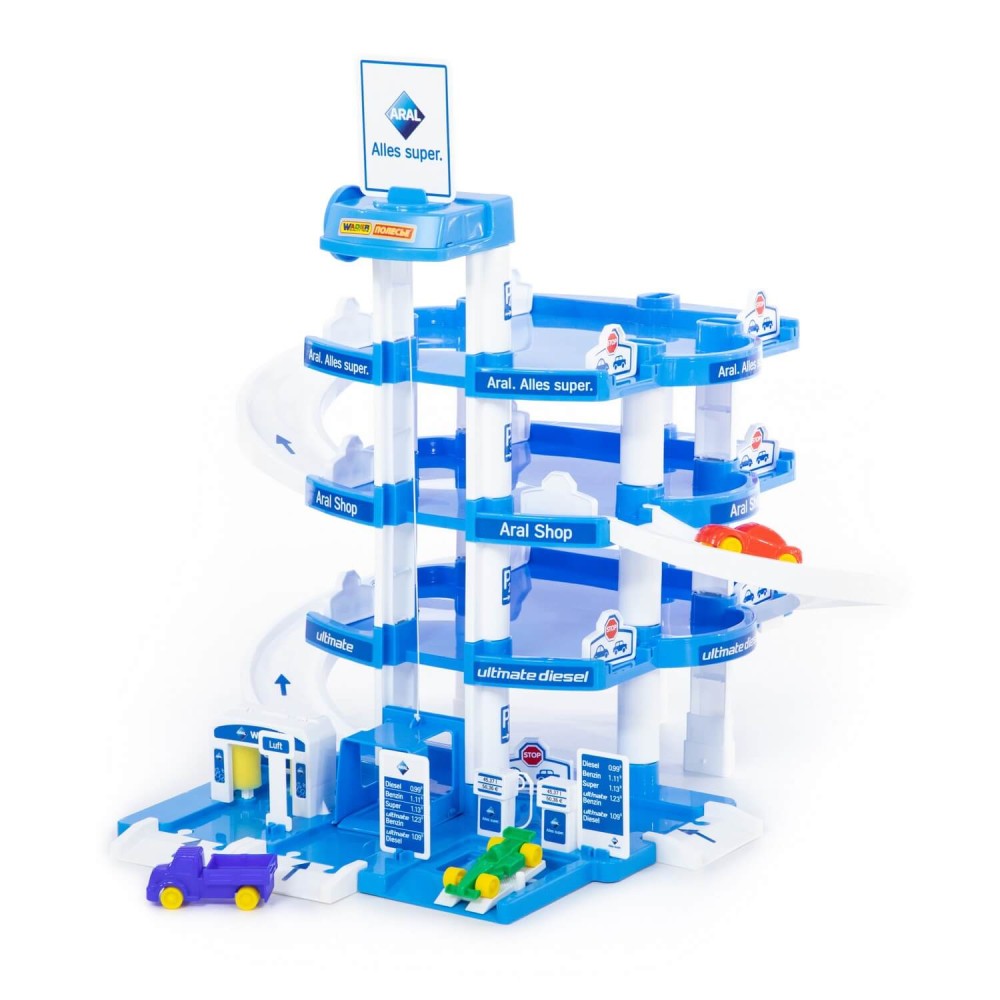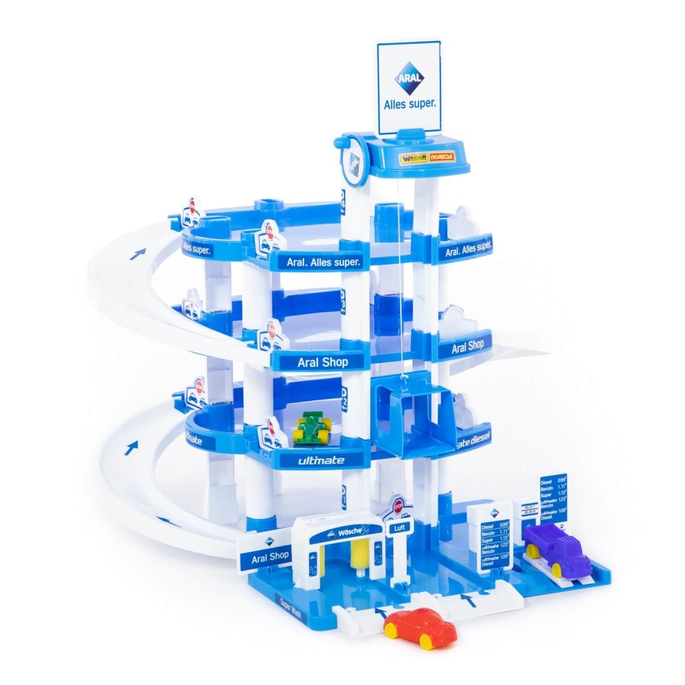 Четырехуровневый паркинг с тремя мини-автомобилями. На первом уровне паркинга расположены автомойка, автозаправка, автосервис с эстакадой. На остальные уровни автомобили поднимаются на лифте с ручным приводом, то есть для движения лифта ребенку нужно поворачивать рукоятку на верхнем уровне.
