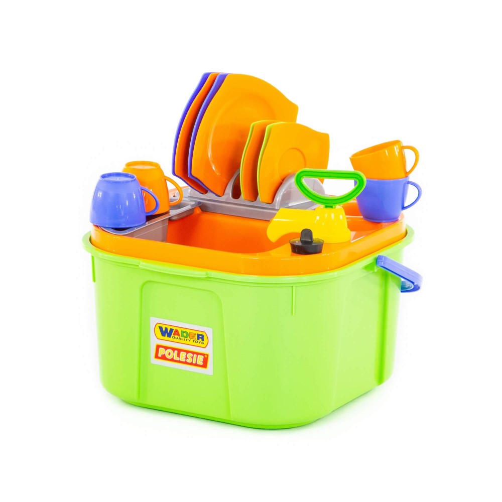 Мини-посудомойка представляет собой компактное мобильное приспособление - ведёрко с ручкой. Налив воду в ведёрко, процесс мойки посуды станет максимально реалистичен. С помощью насоса вода из ведёрка подаётся в мойку, которую можно закрыть пробкой. Ручка ведёрка поможет легко набирать и сливать воду. В набор входит посуда: