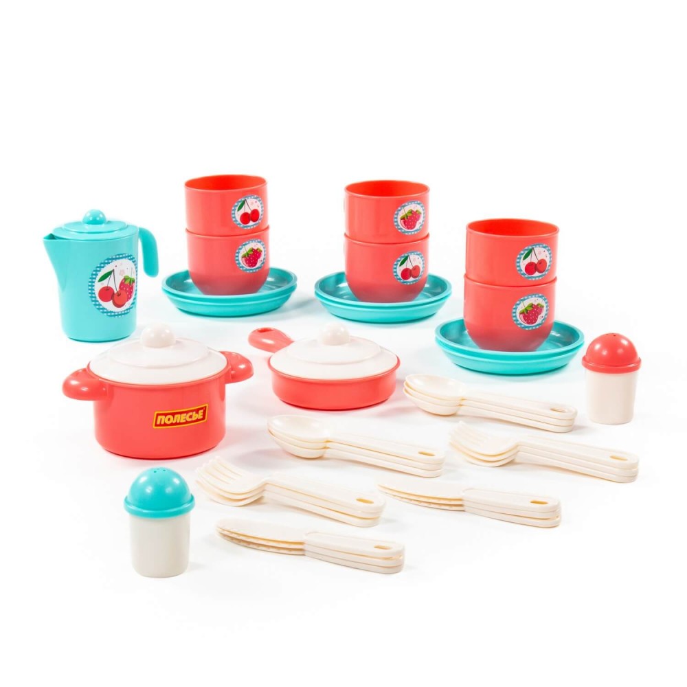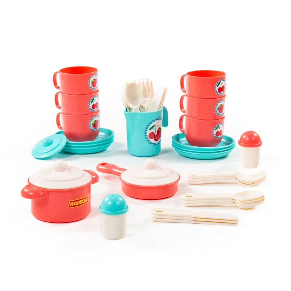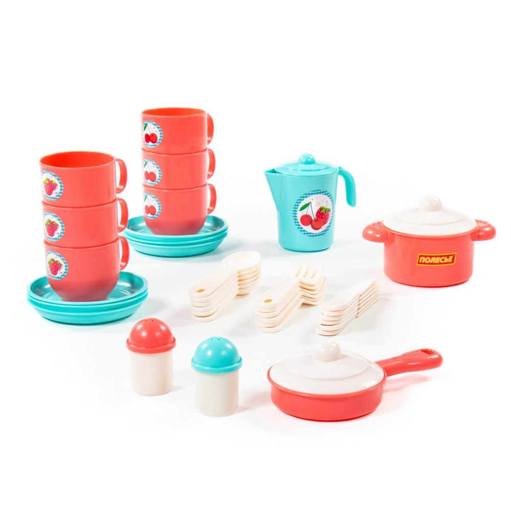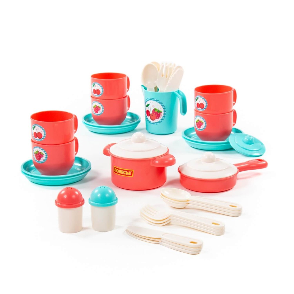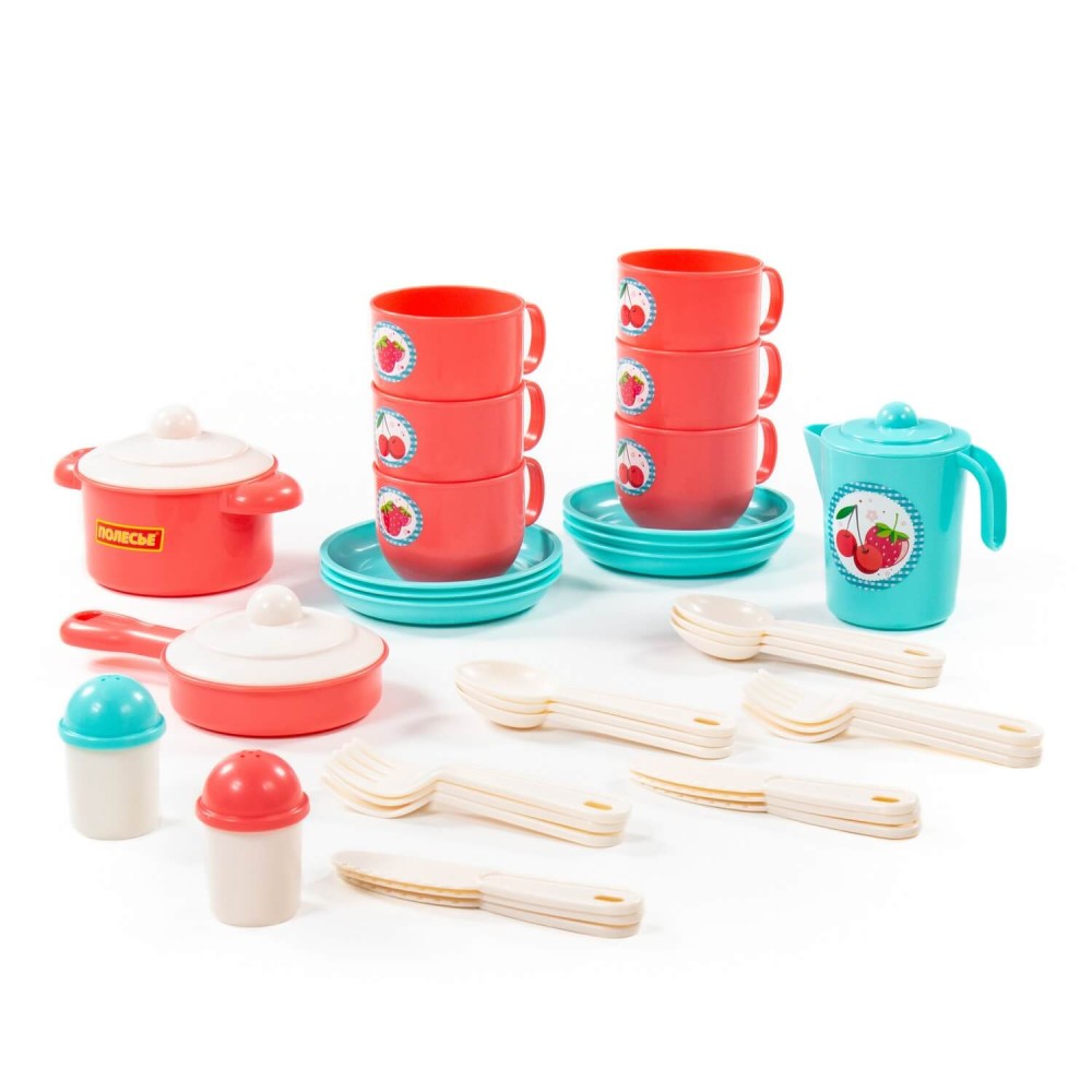 Яркий набор посуды для кукол от компании «Полесье» рекомендован детям от трёх лет и старше. В комплектации 38 предметов: ложки, вилки, ножи, блюдца, чашки, сковорода, кастрюлька, кувшин с крышечкой, баночки для соли и перца. Набор рассчитан на 6 персон. Посуда изготовлена из высококачественного пластика, безопасного для здоровья детей. Набор предназначен для игры как в помещении, так и на свежем воздухе. Набор развивает моторику рук, воображение, коммуникативные навыки.