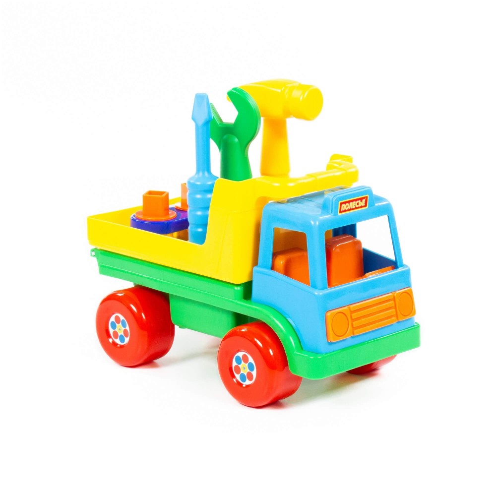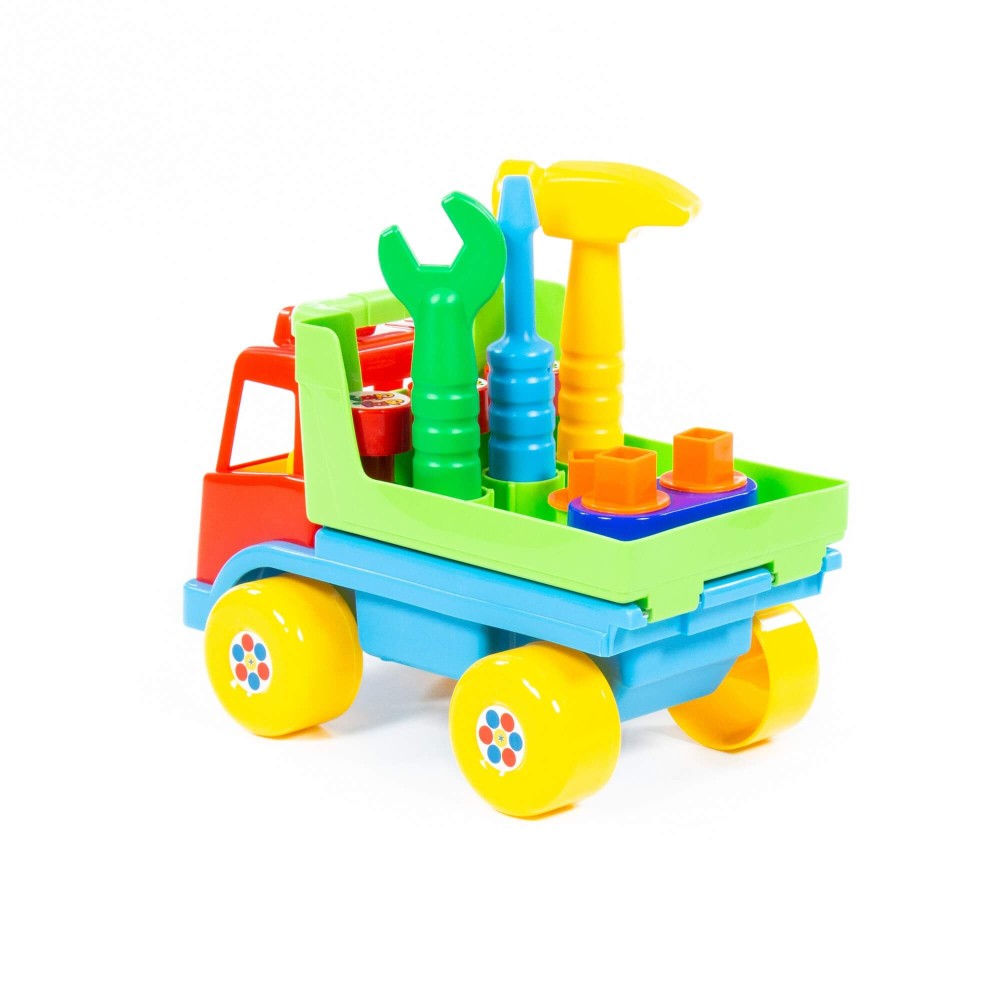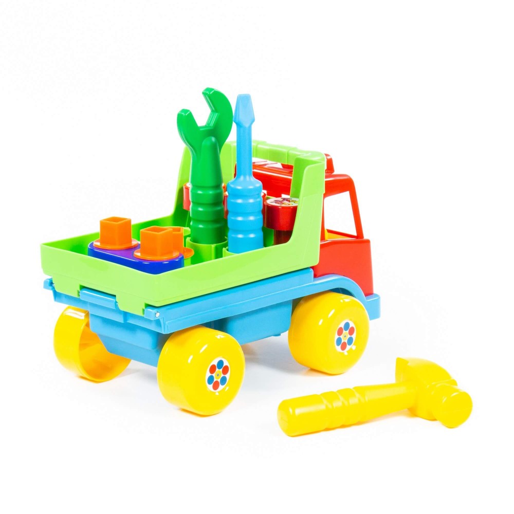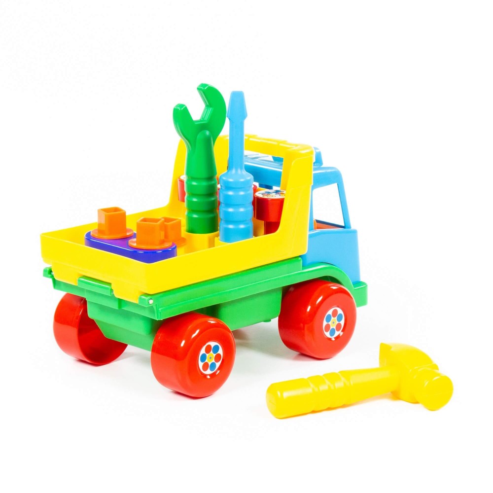 Автомобиль "Техпомощь" является развивающей игрушкой для детей до 3-х лет. Крышка кузова автомобиля откидывается за ручку над кабиной и в таком положении тоже является рабочей поверхностью. С помощью молотка, отвертки и гаечного ключа можно забивать гвозди (3 шт.), вкручивать болты (3 шт.). Для этого в крышке кузова имеются специальные отверстия. В сам кузов можно сложить свободные болты, гвозди, другие мелкие детали. Игрушка знакомит с работой и назначением основных слесарных инструментов, развивает моторику рук, логику, память, воображение.