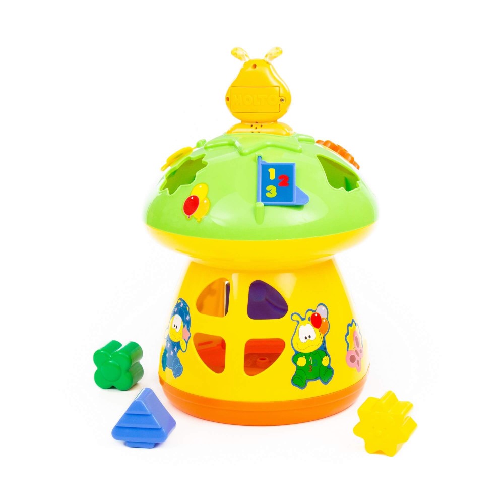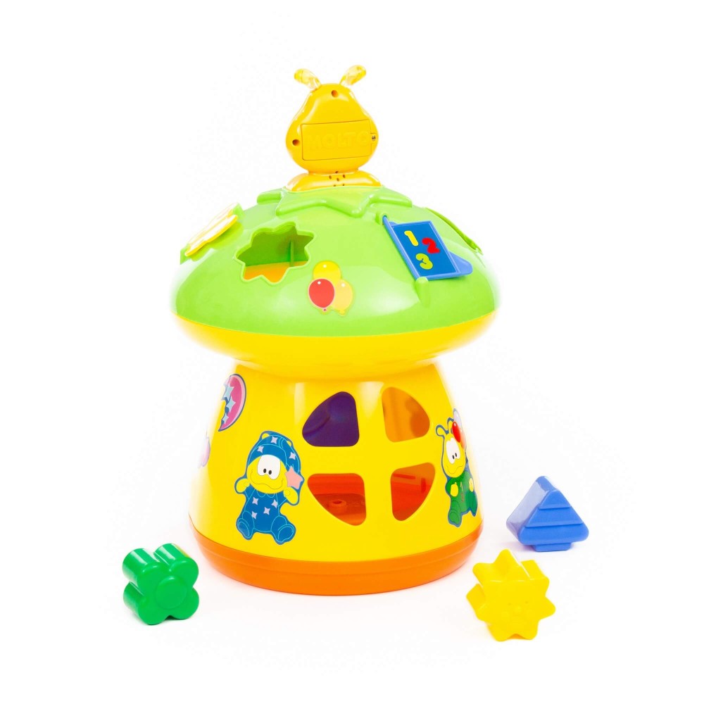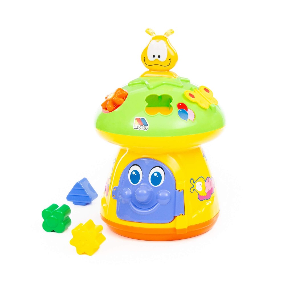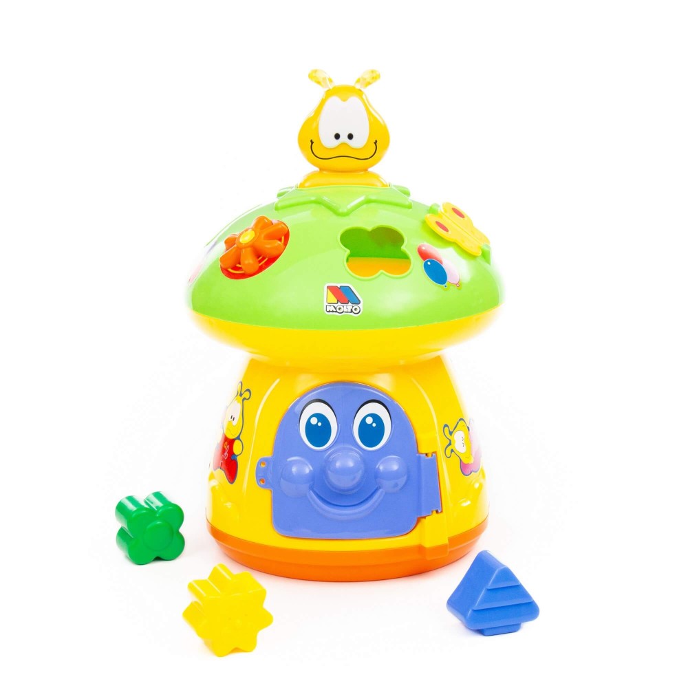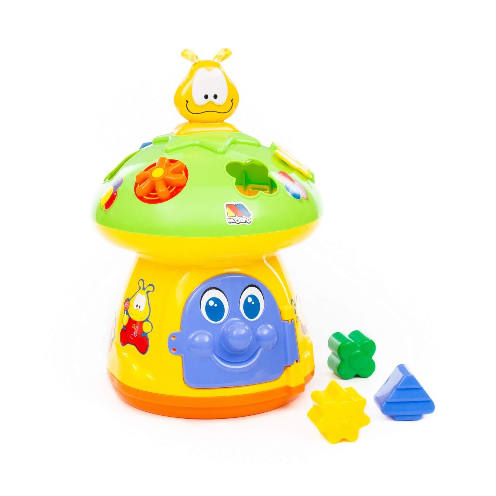 Включая в себя различные предметы, которые можно двигать, тянуть, крутить, нажимать, пазл "Гриб" знакомит ребенка с цветами, формами, звуками, развивает мелкую моторику рук, воображение, логику, умение совершать пространственные перемещения. Игрушка сделана в виде гриба-домика, с открывающейся дверцей. На шляпке - книжка-бабочка с разноцветными страничками-крылышками. Три отверстия по типу "пазла", заставляют малыша задуматься, чтобы каждый предмет занял свое место. На верхушке гриба - смешной червячок, который издает звуки.