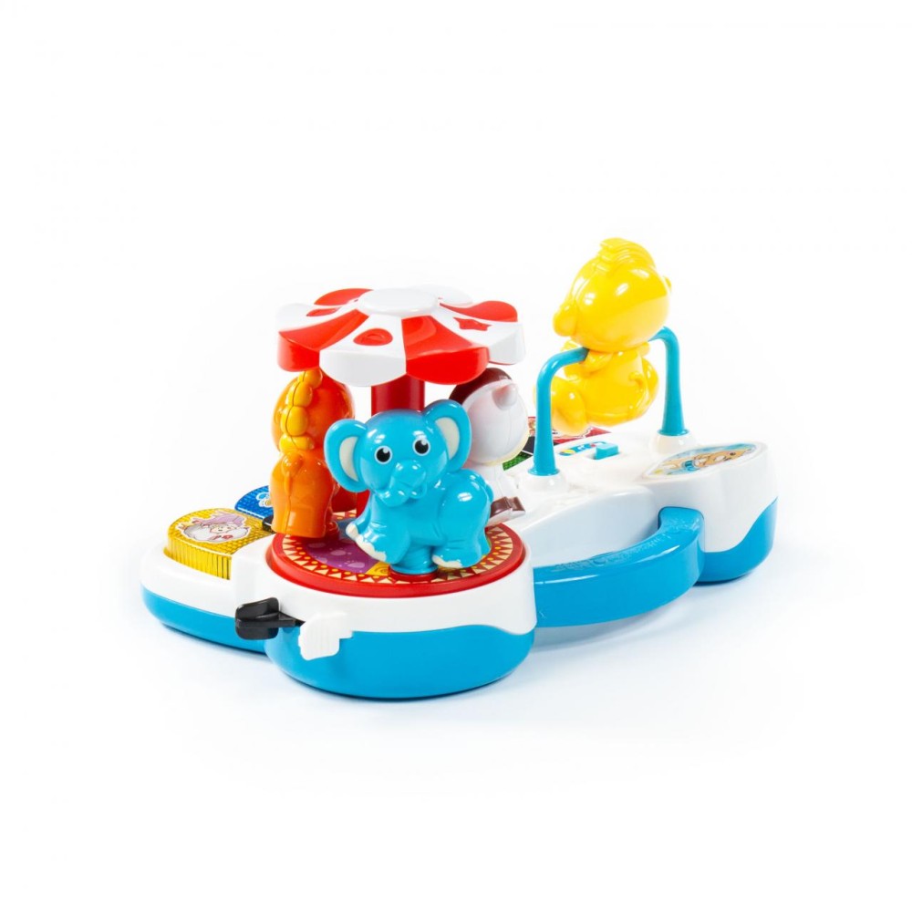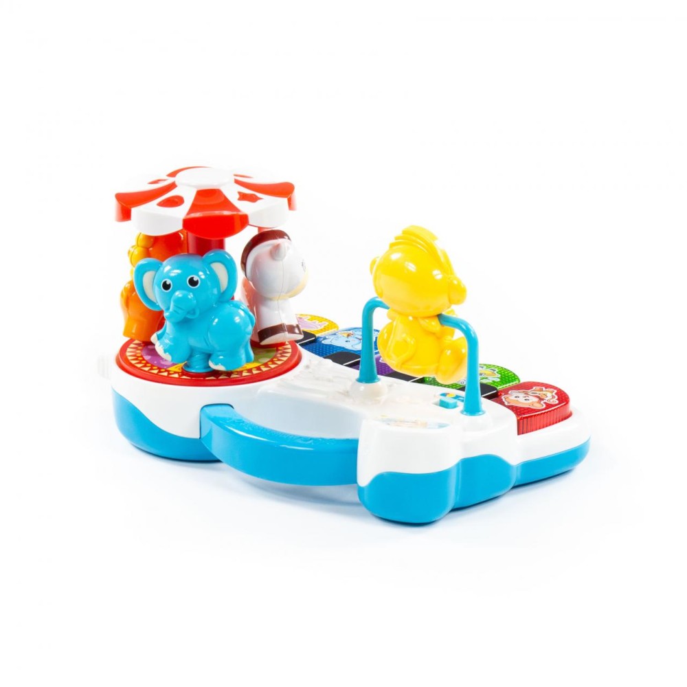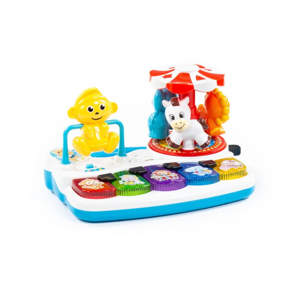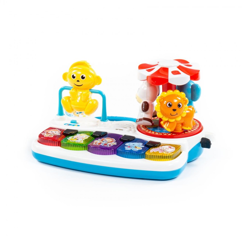 С игрушкой «Весёлое пианино» легко научиться распознавать звуки, которые издают звери! Когда малыш нажимает на разноцветные клавиши – светится подсветка и можно услышать: бег лошадки, рык льва, песню обезьянки… Сбоку игровой панели есть дополнительная кнопка. Если включить эту функцию - закружится карусель со львёнком, слонёнком и лошадкой. При нажатии клавиши, на которой изображена обезьянка, начинает звучать весёлая песенка, а фигурка обезьянки переворачивается. Игрушка способствуют развитию мелкой моторики рук у ребёнка, малыш изучает цвета и звуки.