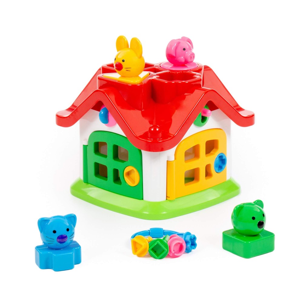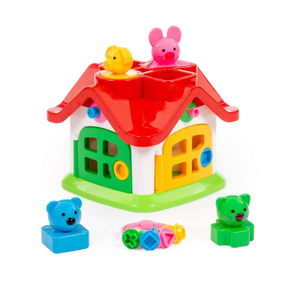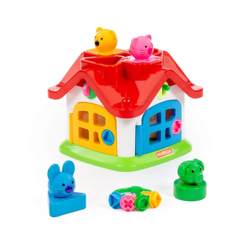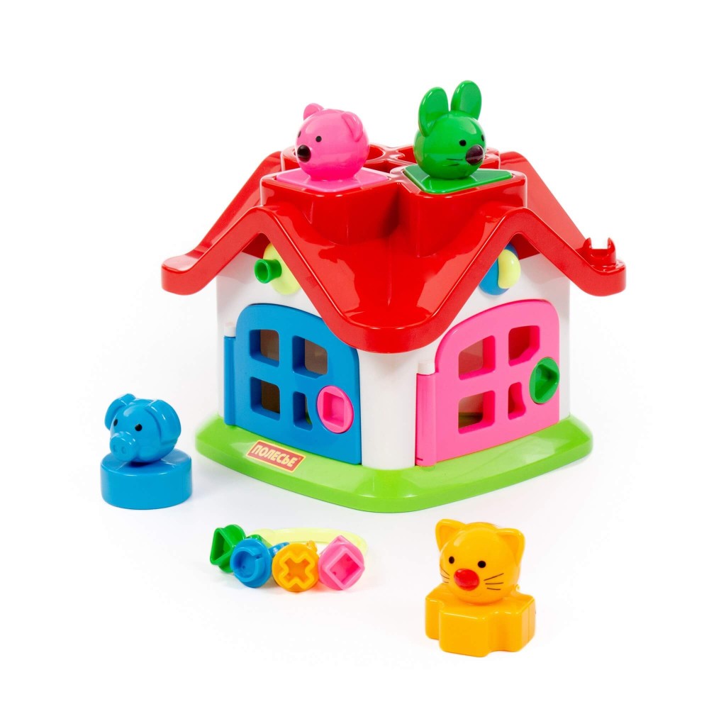 Яркий цветной теремок с 4 дверками на замочках и зверушками знакомит ребёнка с цветами, формами, звуками, развивает мелкую моторику рук, воображение, логику, умение совершать пространственные перемещения. Внутри теремок разбит на 4 комнаты. За каждой дверкой есть жилец: мишка, зайчик, кошка, поросёнок. В теремок они попадают через отверстия в крыше: сажаем их в дырочку, нажимаем на кнопочку (для каждого своя) и зверёк проскакивает в комнату. По желанию в теремок можно войти и через дверку. Высота зверюшек 6 см. У каждого зверя основание определённой формы: у зайца в основе - треугольник, у поросёнка - кружок, у котёнка - крест, у мишки - квадрат.
