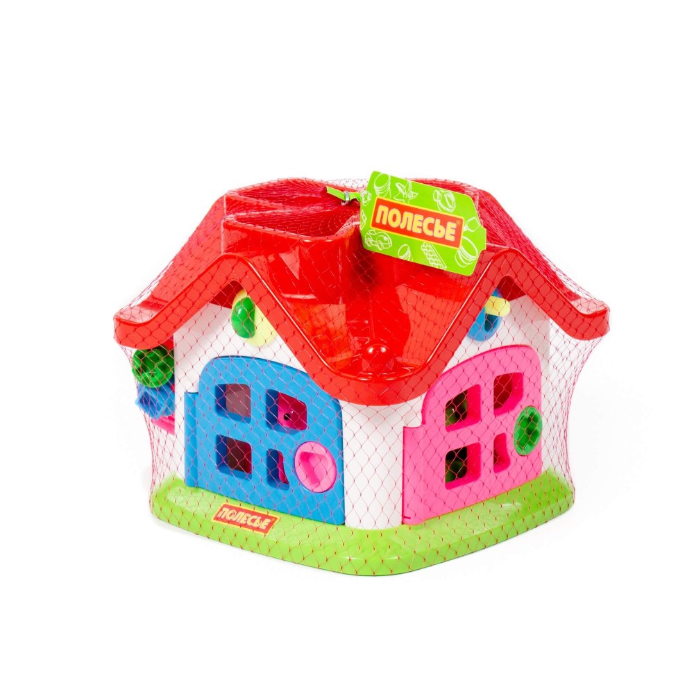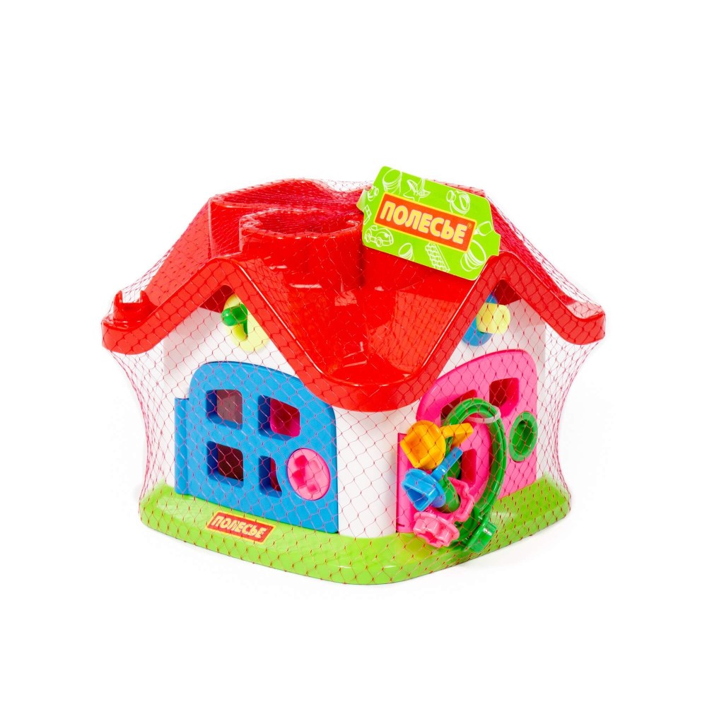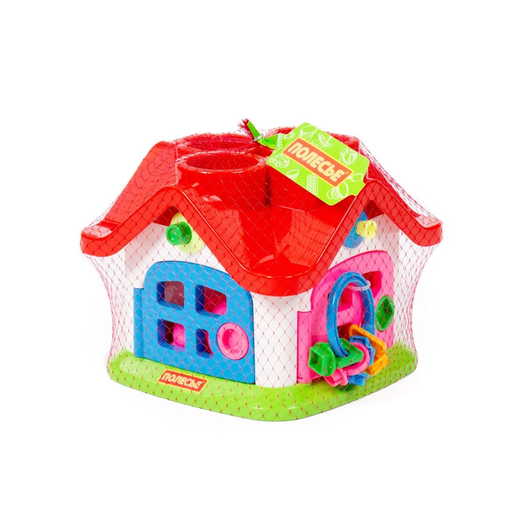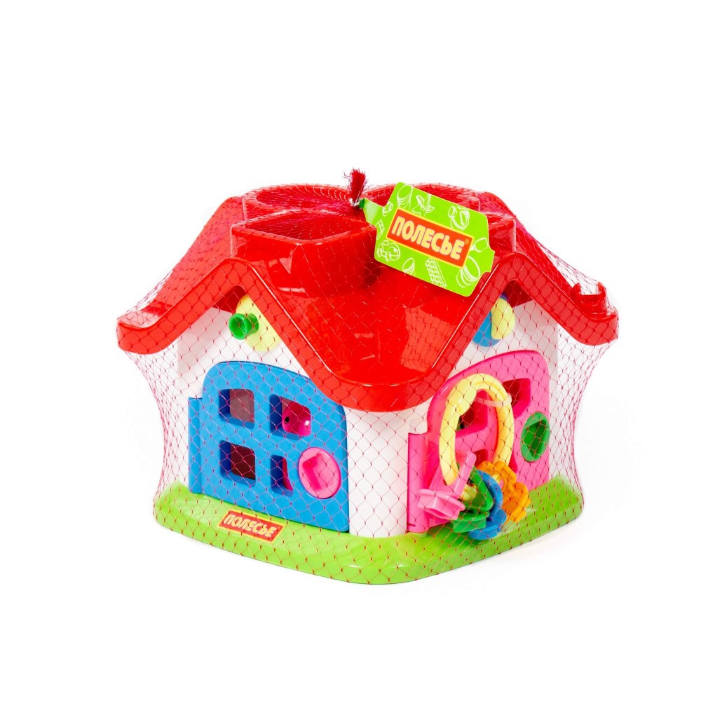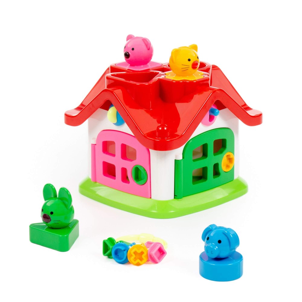 Яркий цветной теремок с 4 дверками на замочках и зверушками знакомит ребёнка с цветами, формами, звуками, развивает мелкую моторику рук, воображение, логику, умение совершать пространственные перемещения. Внутри теремок разбит на 4 комнаты. За каждой дверкой есть жилец: мишка, зайчик, кошка, поросёнок. В теремок они попадают через отверстия в крыше: сажаем их в дырочку, нажимаем на кнопочку (для каждого своя) и зверёк проскакивает в комнату. По желанию в теремок можно войти и через дверку. Высота зверюшек 6 см. У каждого зверя основание определённой формы: у зайца в основе - треугольник, у поросёнка - кружок, у котёнка - крест, у мишки - квадрат.