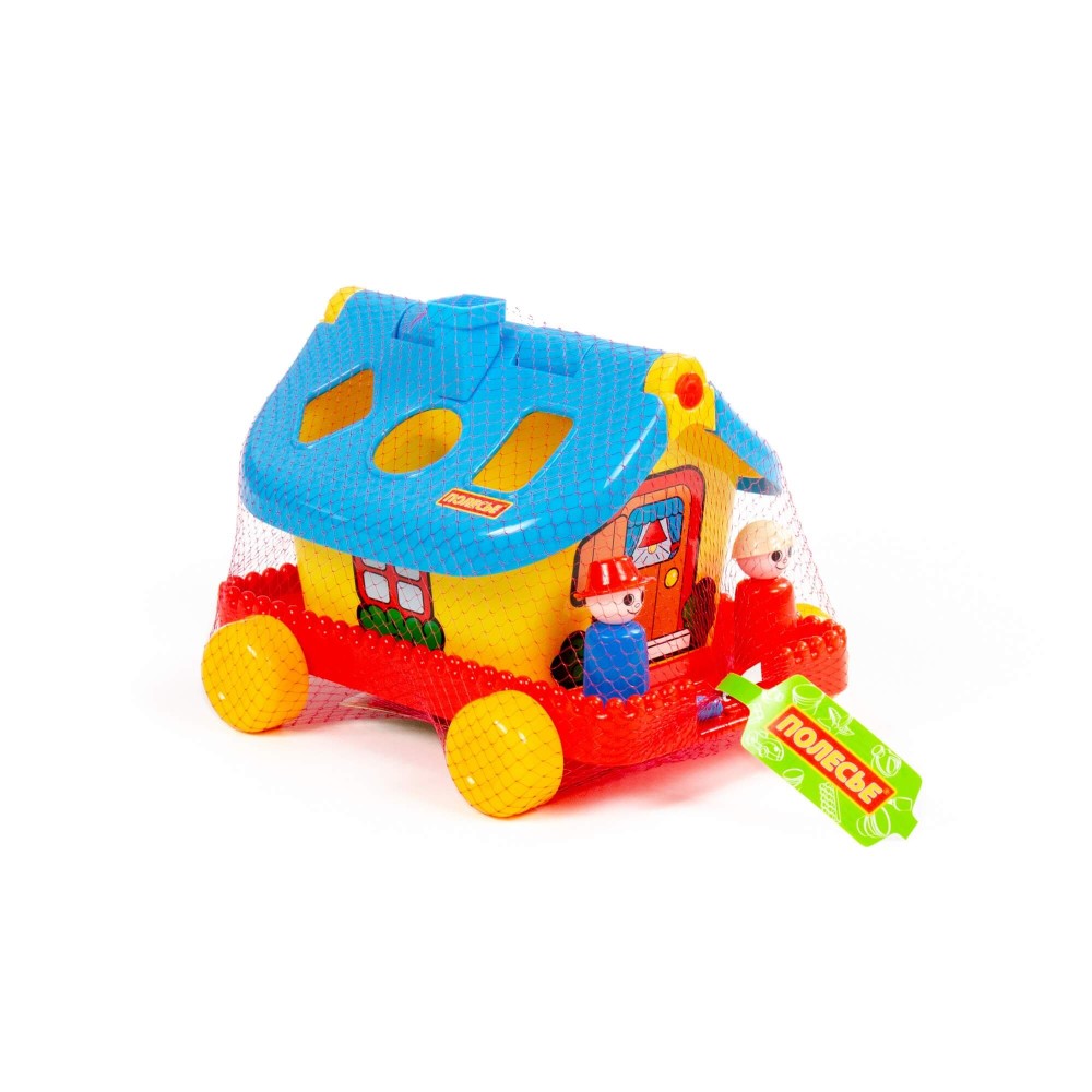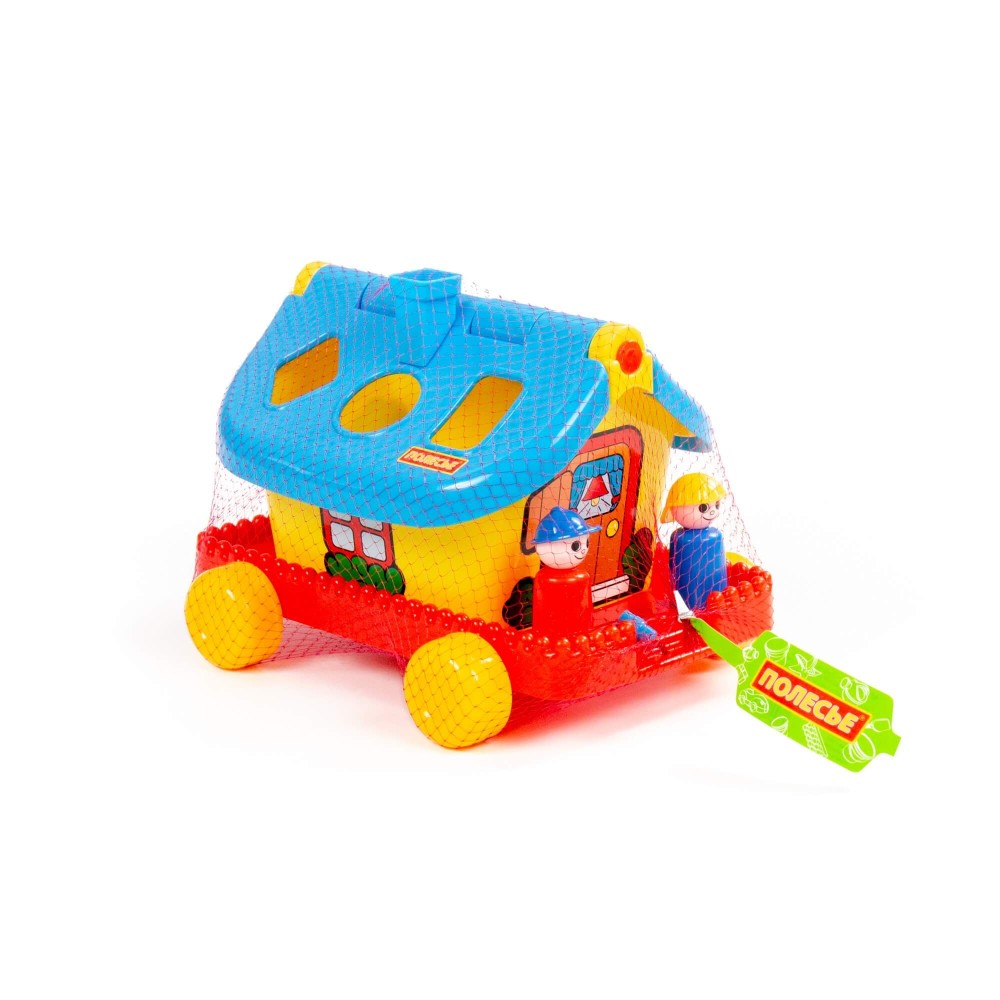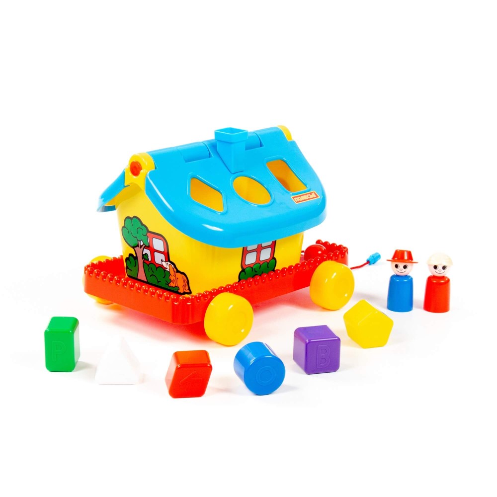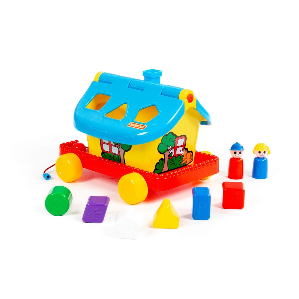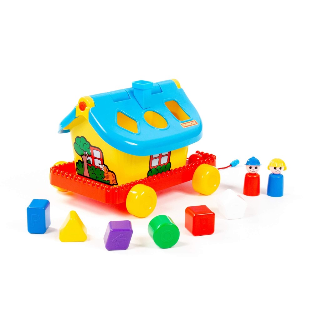 Развивающий домик для детей до 3-х лет. На крыше домика логическая задача: ребёнку нужно сопоставить фигурки (6 шт.) с отверстиями-пазлами. Домик украшен наклейками. Крыша удобно открывается, что позволяет извлечь фигурки из домика. На разноцветных фигурках выдавлены буквы, что благоприятно влияет на развитие мелкой моторики рук у малышей. Также в комплект входят 2 фигурки человечков, которые устанавливаются в специальные углубления и позволяют малышу разыгрывать различные сюжеты. Домик можно катать благодаря колёсам и шнурку.