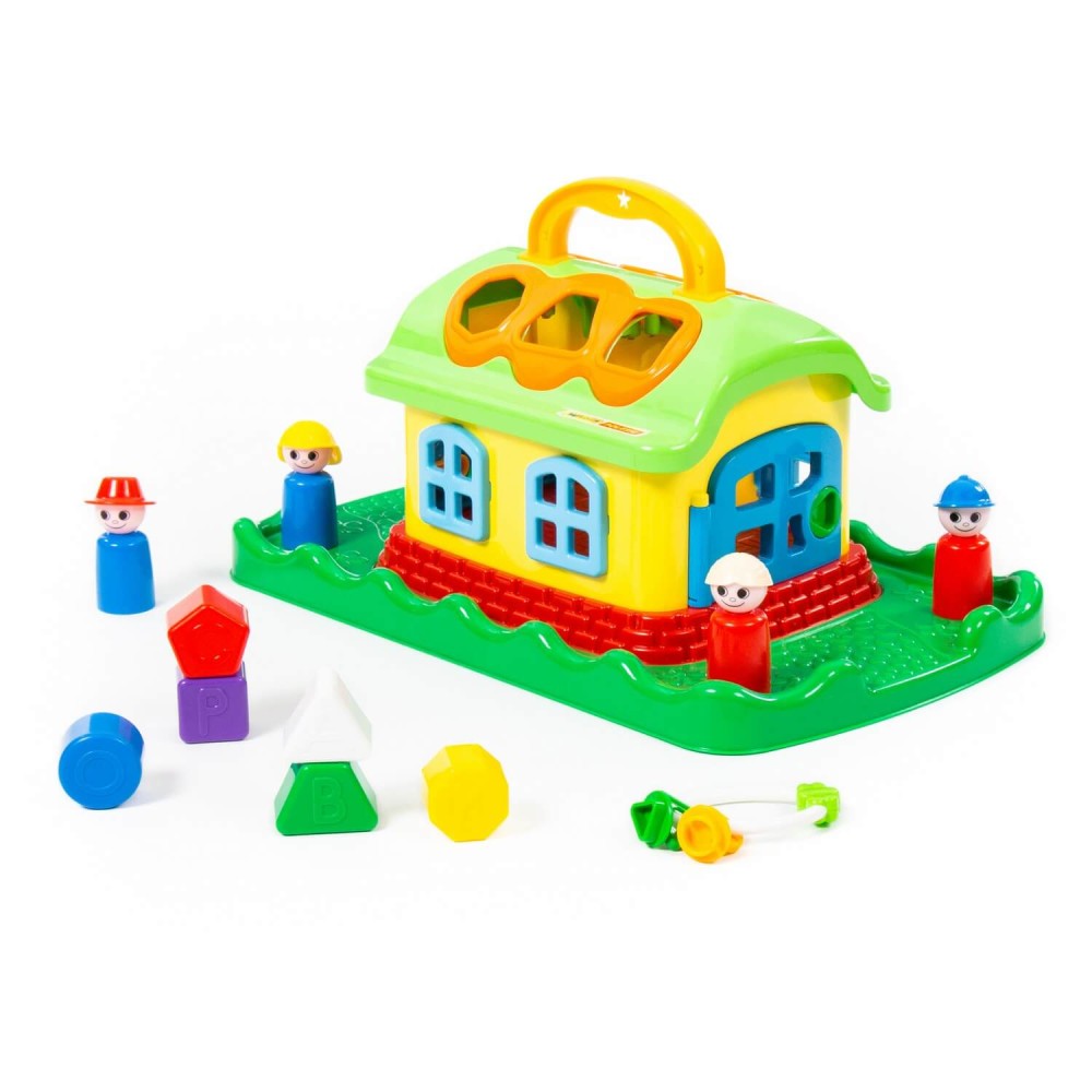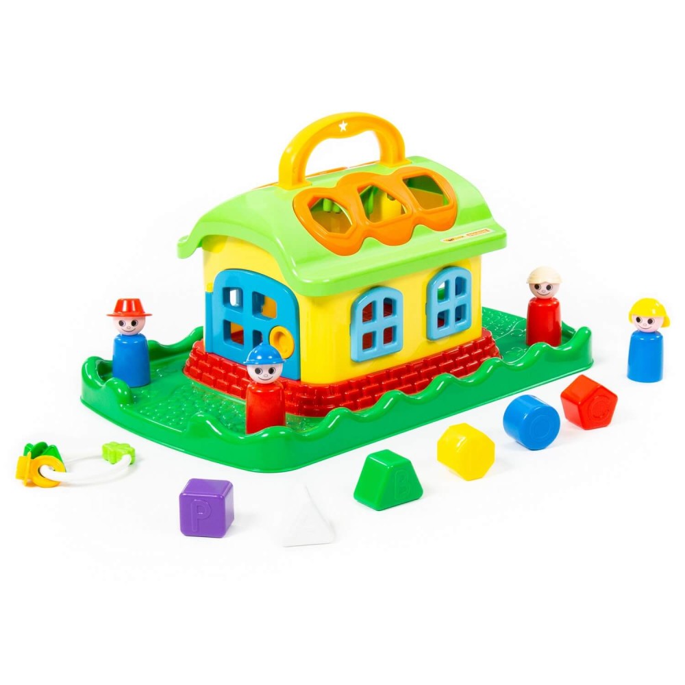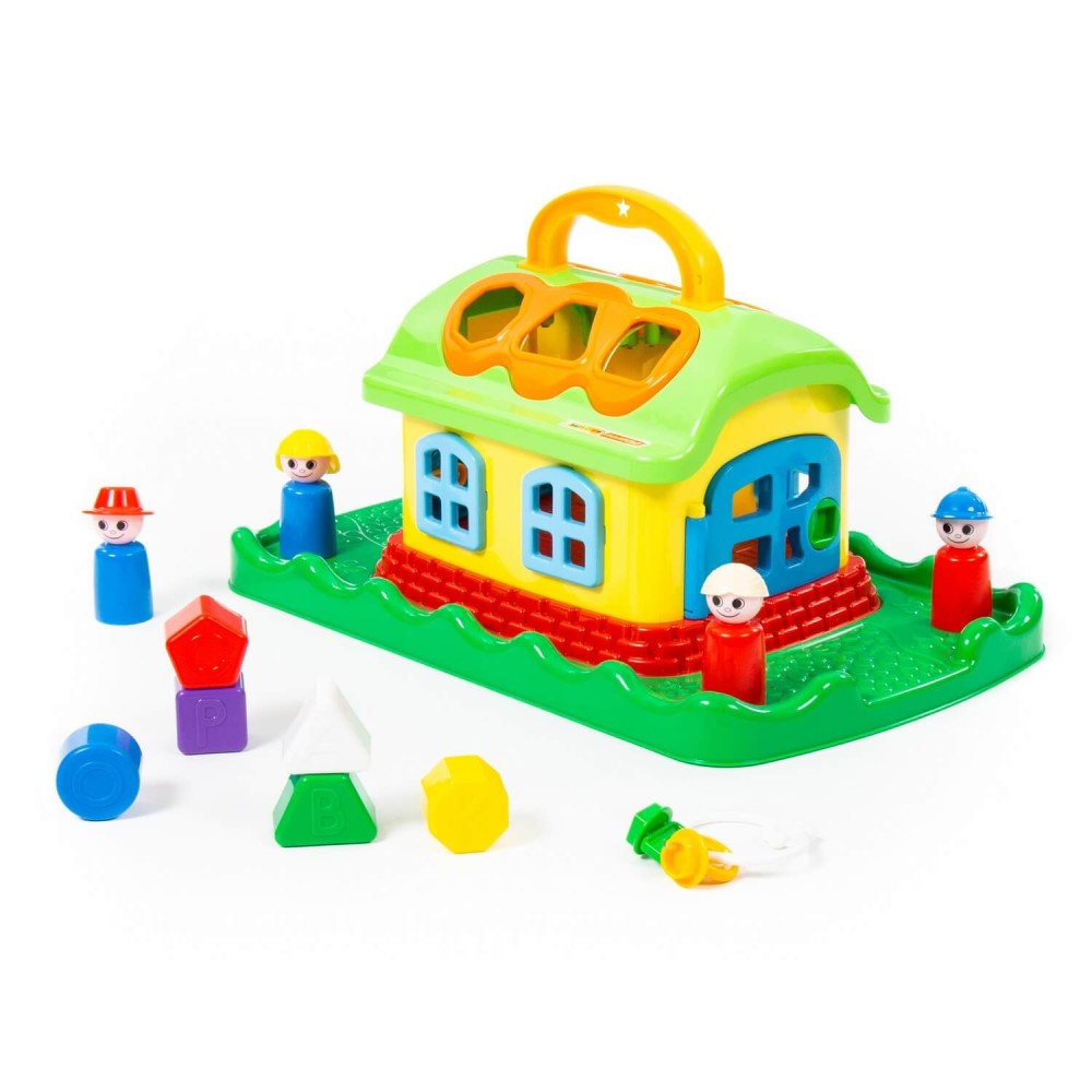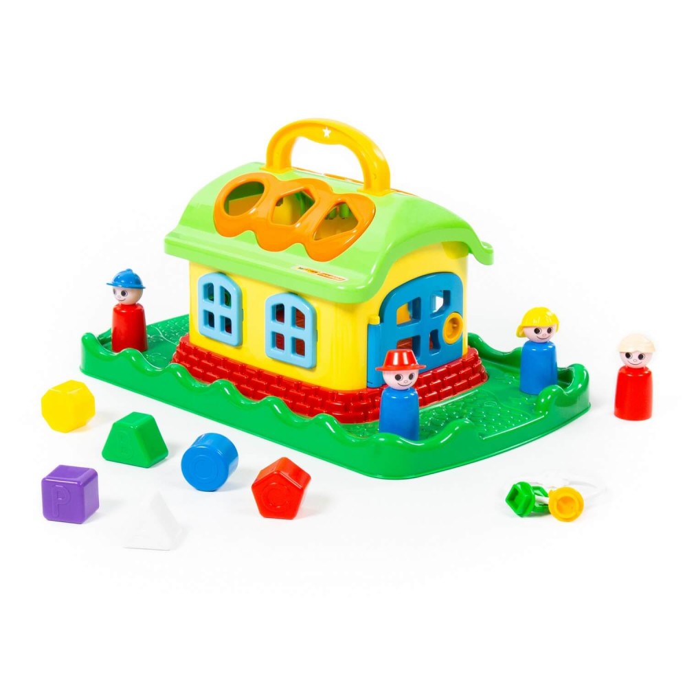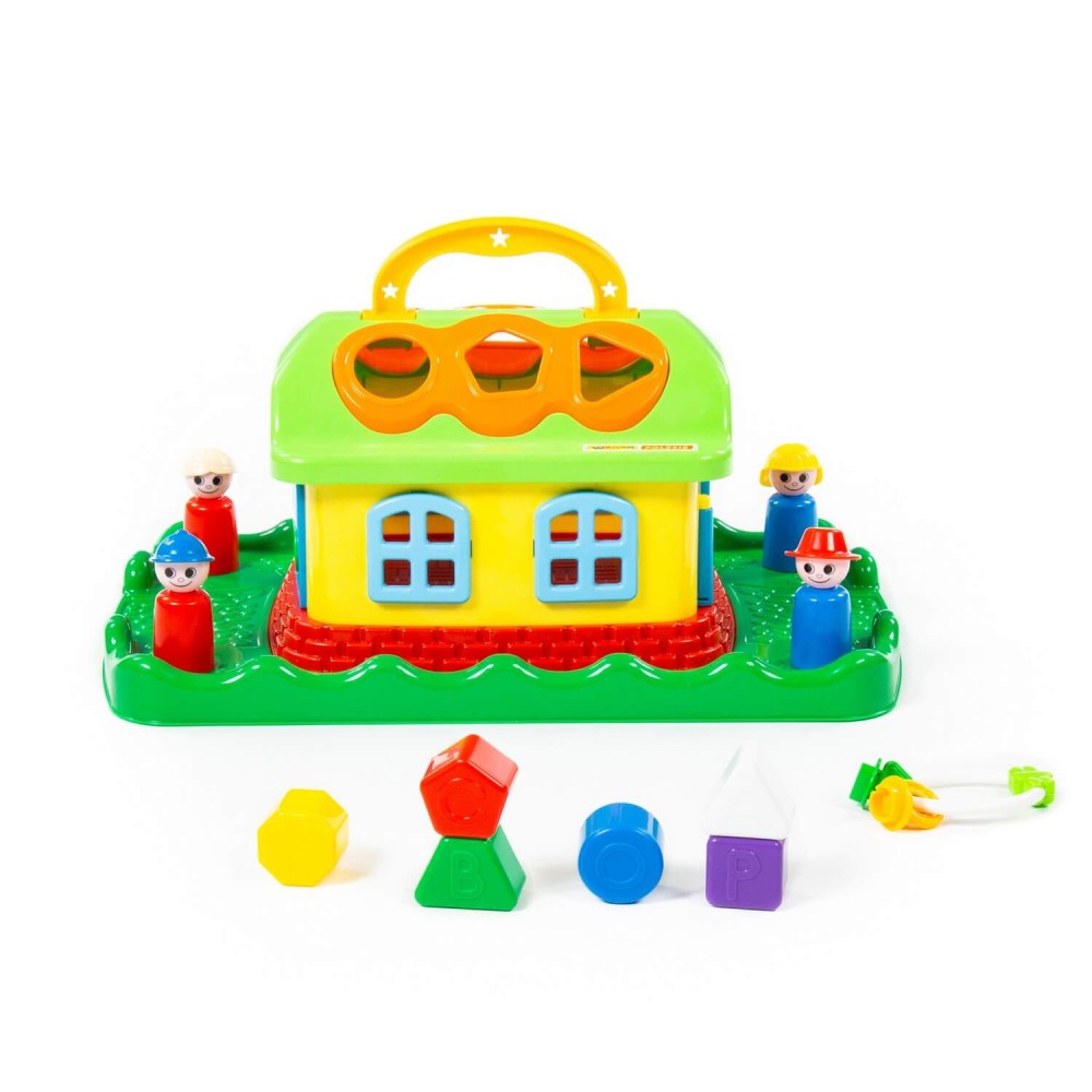 Домик из серии развивающих игрушек для детей до 3-х лет. Помогает ребёнку быстрее познавать окружающий мир. На крыше домика 6 отверстий-пазлов разных геометрических форм, для каждого малышу нужно подобрать соответствующие фигуры. На фигурках имеются буквы, что благотворно влияет на развитие мелкой моторики рук. Также малышу нужно решить дополнительную задачку: открыть дверцы домика, подобрав правильные ключи. В комплект игрушки входят также 4 фигурки человечков, что позволяет придумывать различные сценарии игры. Игрушка имеет удобную ручку для перемещения.