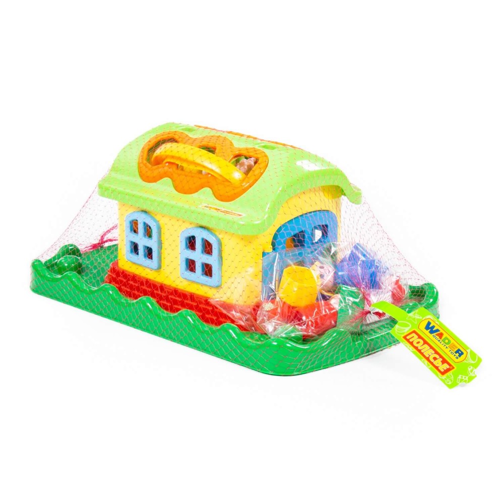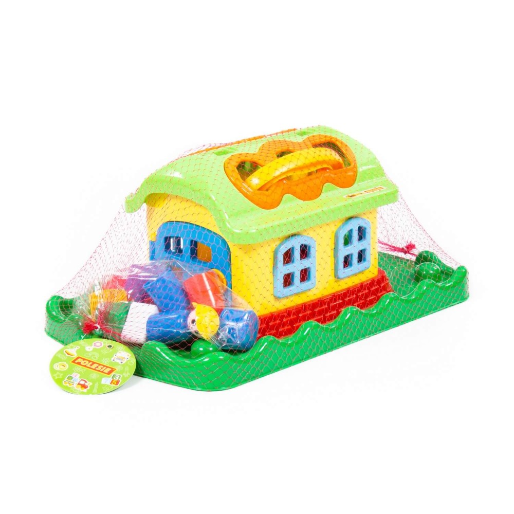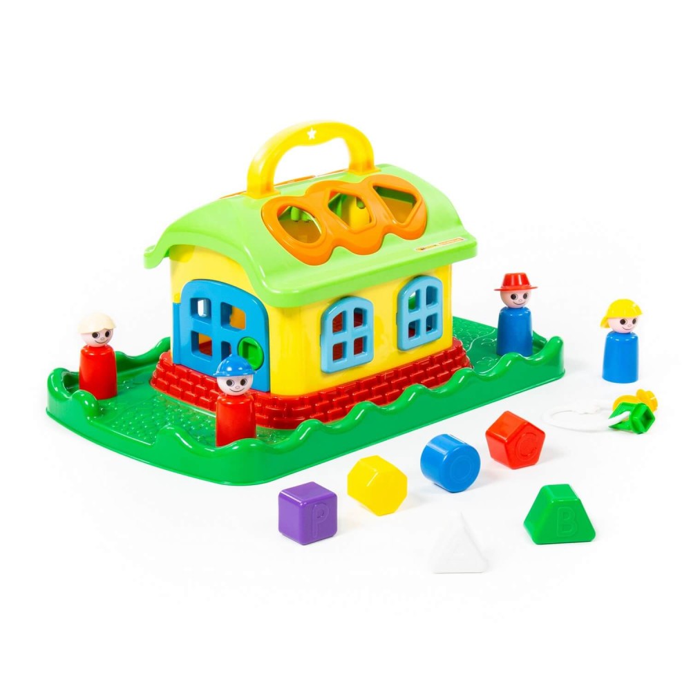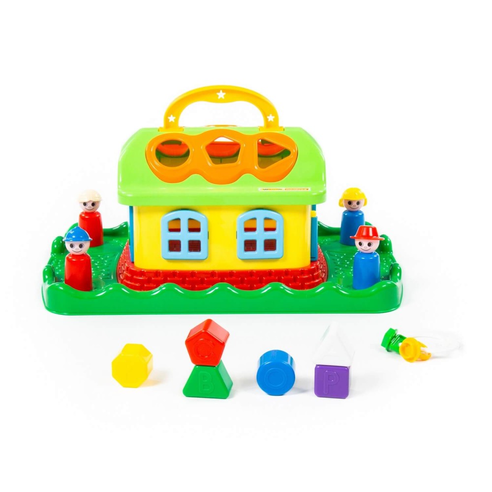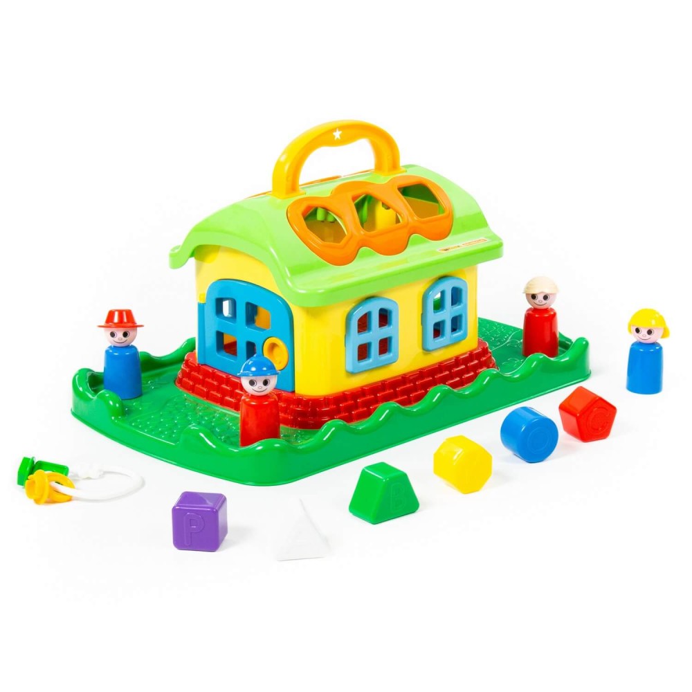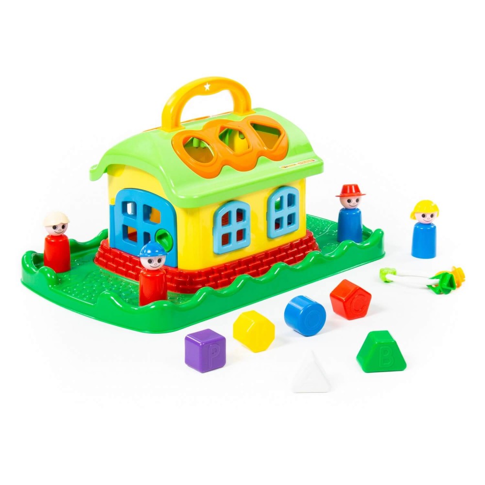 Домик из серии развивающих игрушек для детей до 3-х лет. Помогает ребёнку быстрее познавать окружающий мир. На крыше домика 6 отверстий-пазлов разных геометрических форм, для каждого малышу нужно подобрать соответствующие фигуры. На фигурках имеются буквы, что благотворно влияет на развитие мелкой моторики рук. Также малышу нужно решить дополнительную задачку: открыть дверцы домика, подобрав правильные ключи. В комплект игрушки входят также 4 фигурки человечков, что позволяет придумывать различные сценарии игры. Игрушка имеет удобную ручку для перемещения.
