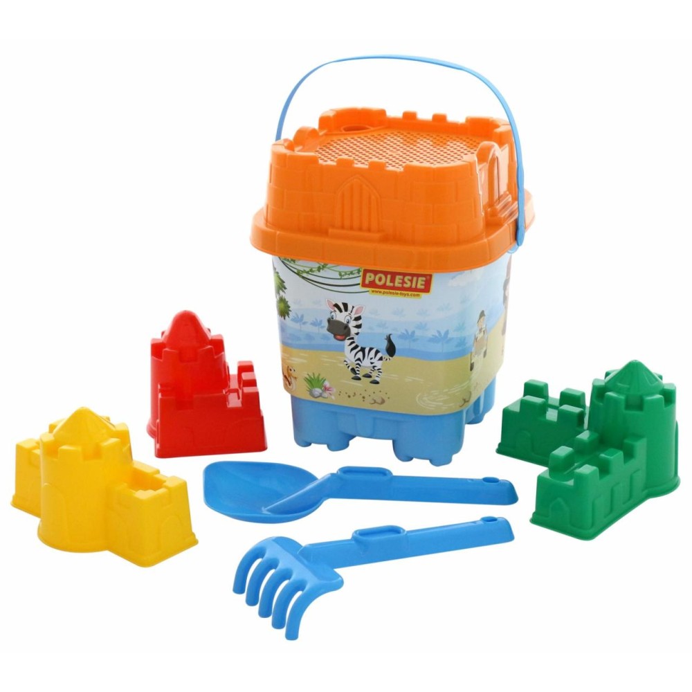 Ведро-замок большое с наклейкой, ситечко-замок большое, лопатка №32, грабельки №32, формочки (замок стена с одной башней + замок угловой + замок квадратный).