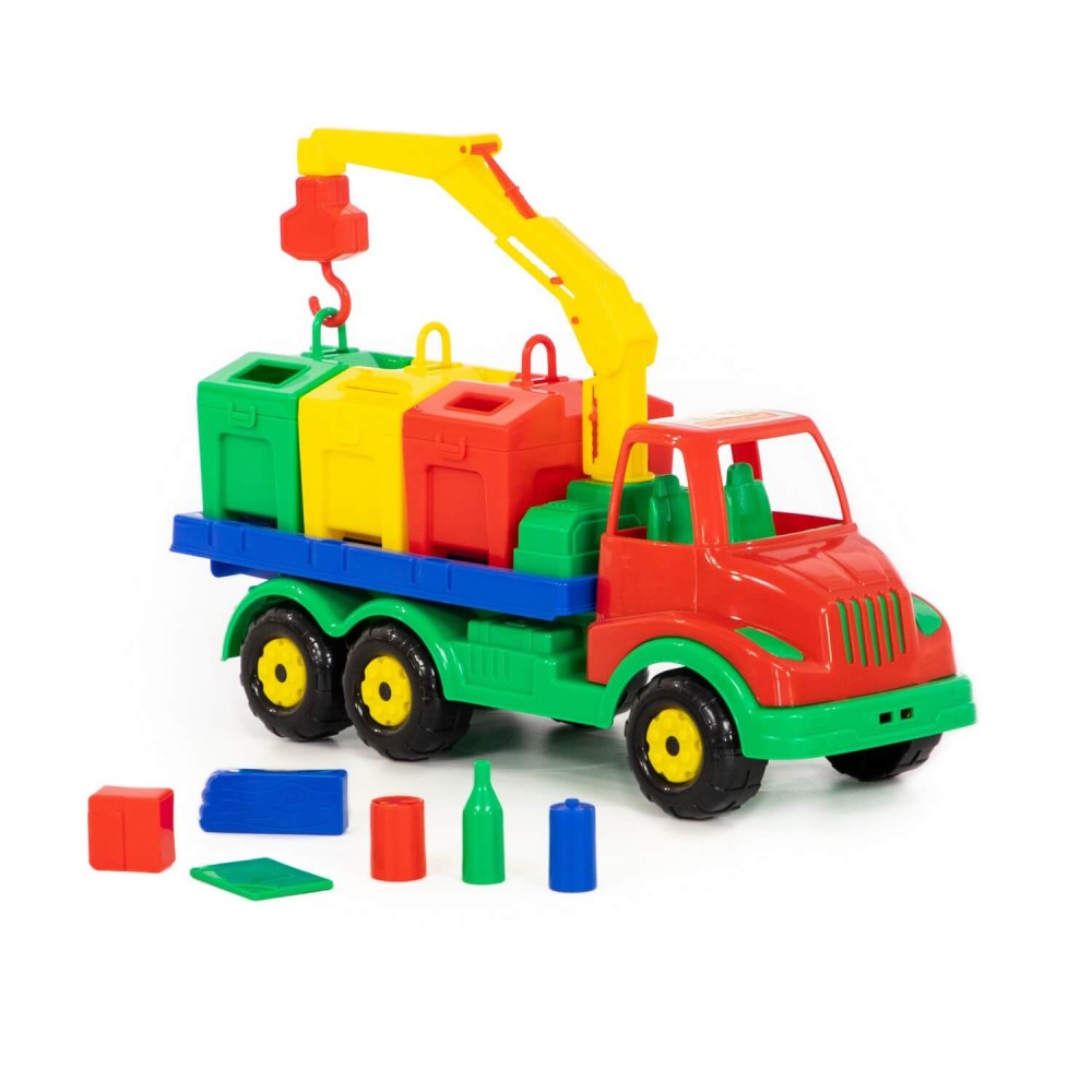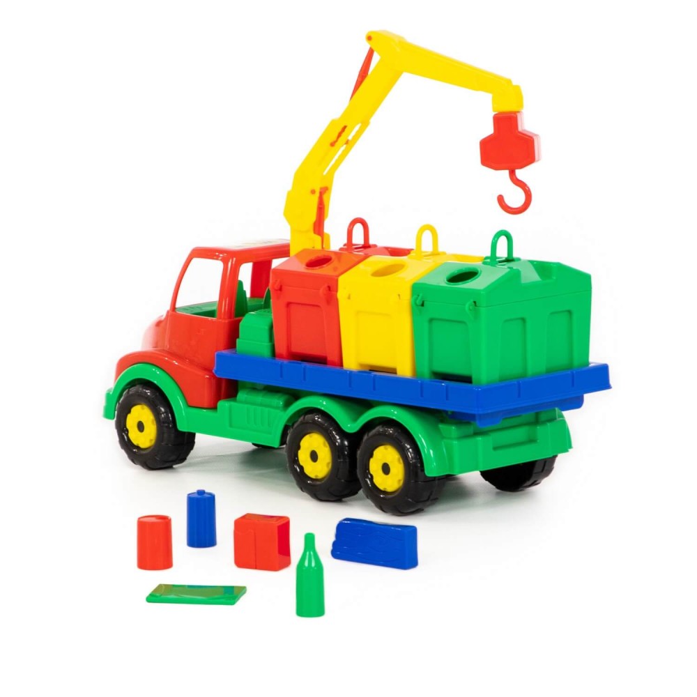 "Муромец", автомобиль-контейнеровоз от фабрики "Полесье" – это яркая игрушка, предназначенная для перевозки цветных контейнеров. Ребенок в игровой форме начинает изучать цвета, а так же развивает моторику рук. Автомобиль станет отличным дополнением автопарка малыша. На машине установлен поворотный манипулятор с крюком. При помощи этого манипулятора ребенок сможет загружать и снимать контейнеры с платформы автомобиля. Все контейнеры оборудованы открывающейся крышкой. В них ребенок сможет перевозить различные мелкие грузы. Также автомобиль-контейнеровоз можно использовать как эвакуатор. На игрушке установлена откидывающаяся платформа.