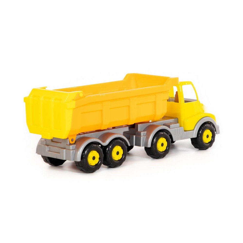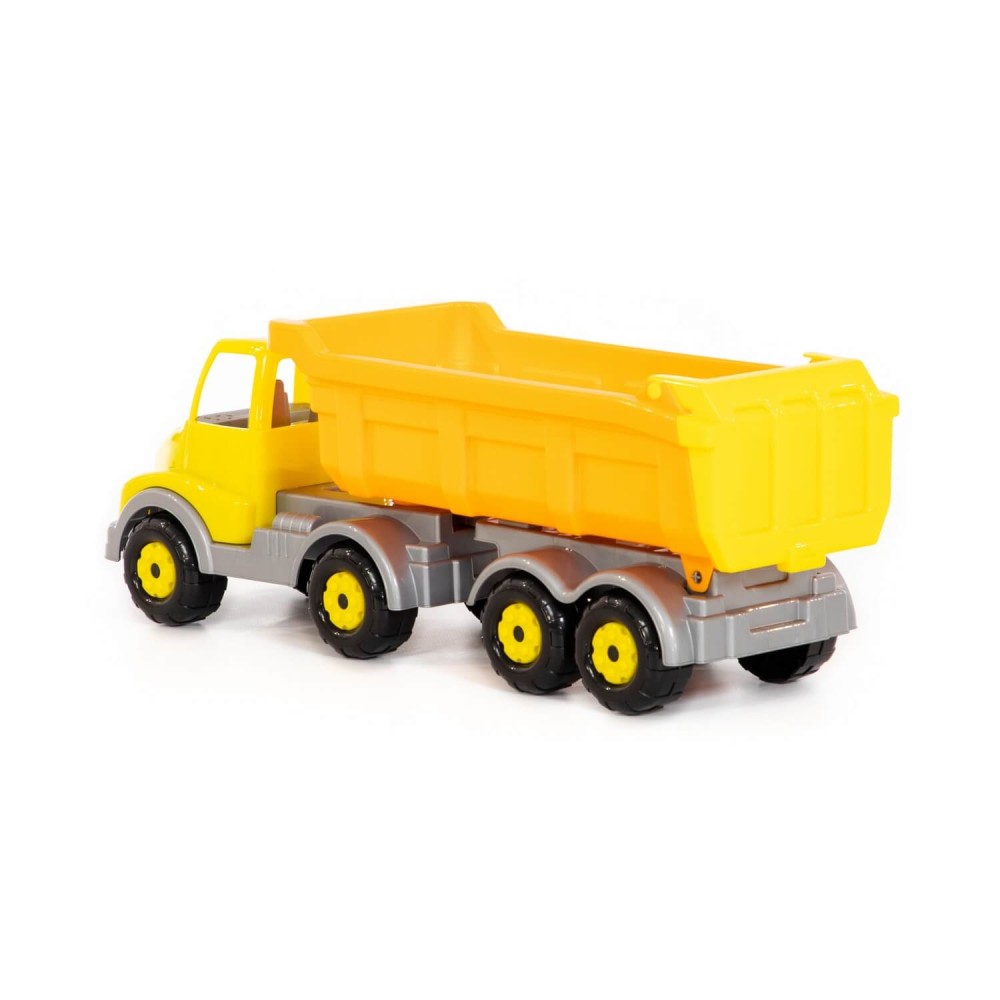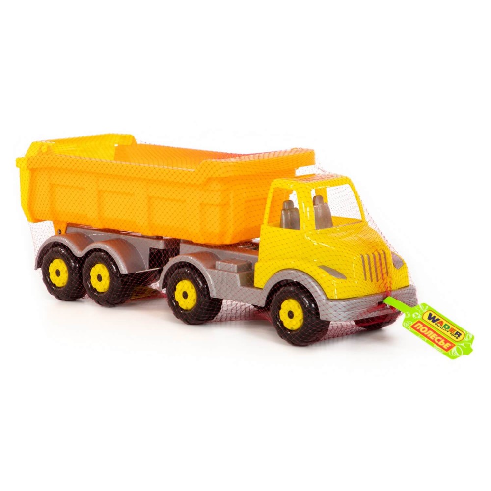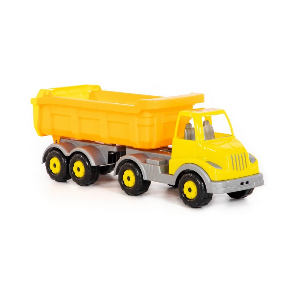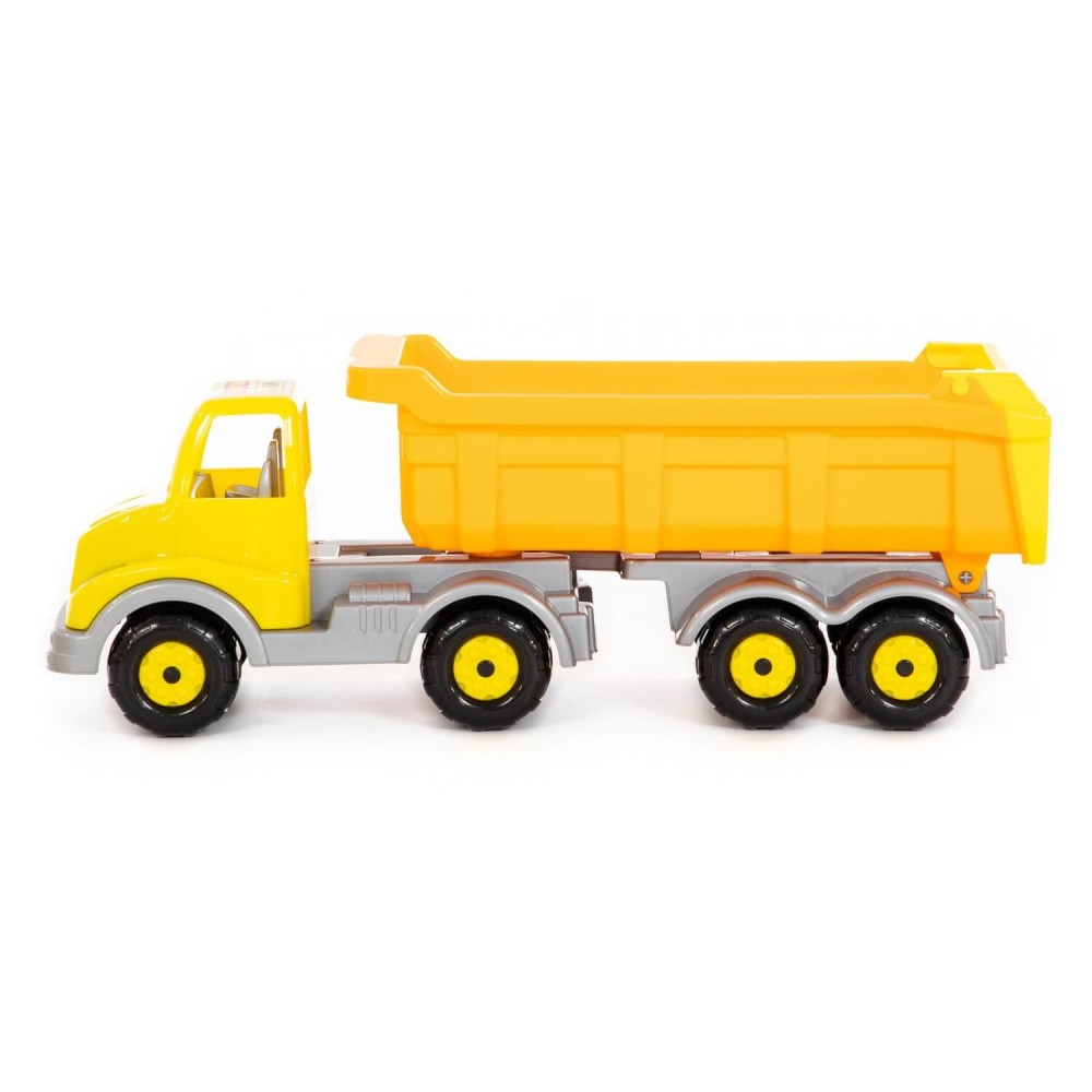 Автомобиль-самосвал с полуприцепом "Муромец" имеет оптимальный размер для игры как дома, так и на свежем воздухе. В кузове карьерного типа удобно возить песок. Кроме того, откидная система кузова позволяет без труда загружать и разгружать автомобиль. На автомобиле установлено 4 пары колёс, они способствуют лучшей проходимости игрушки. На переднем бампере предусмотрено отверстие для верёвочки, прицепив которую, можно будет катать машинку за собой.