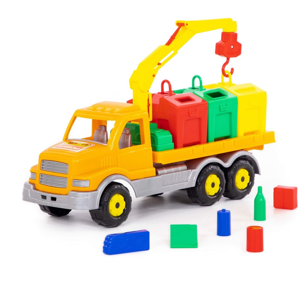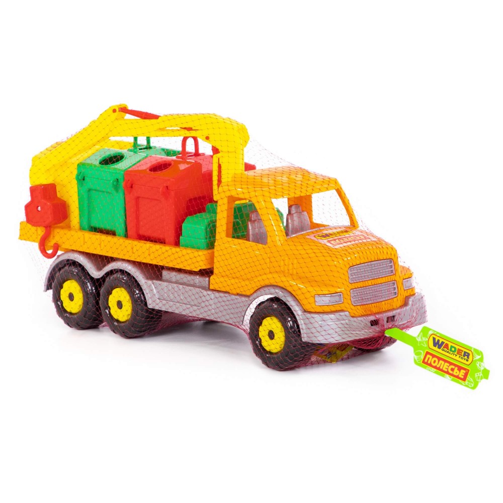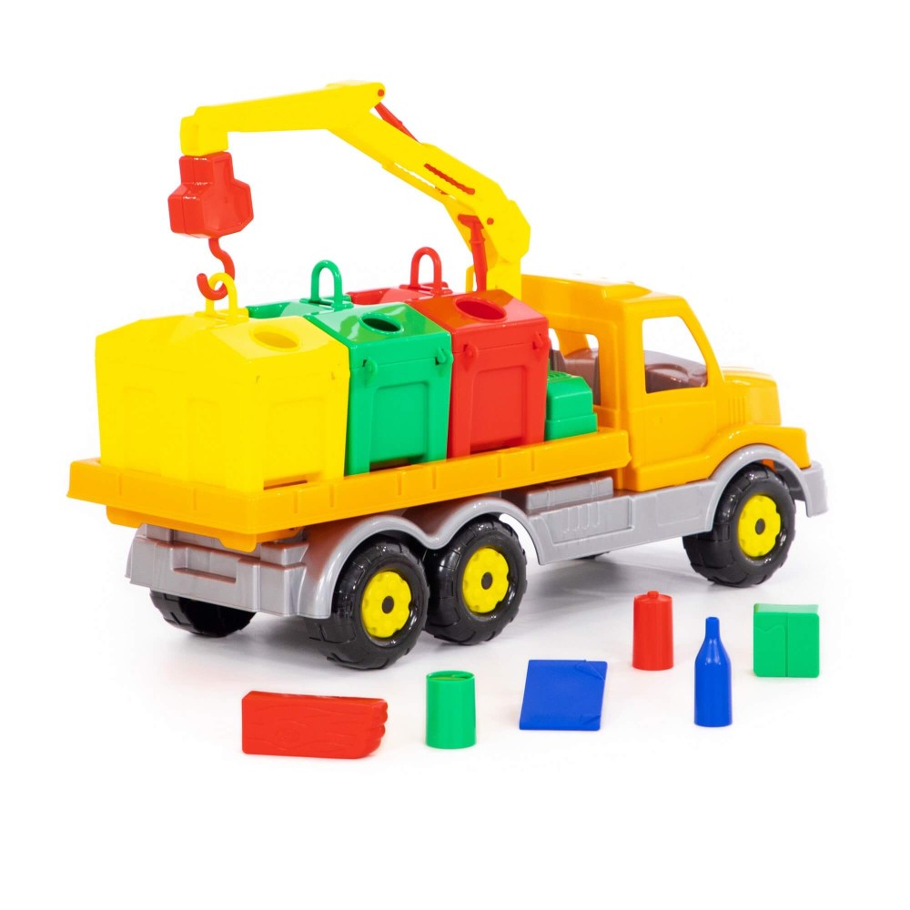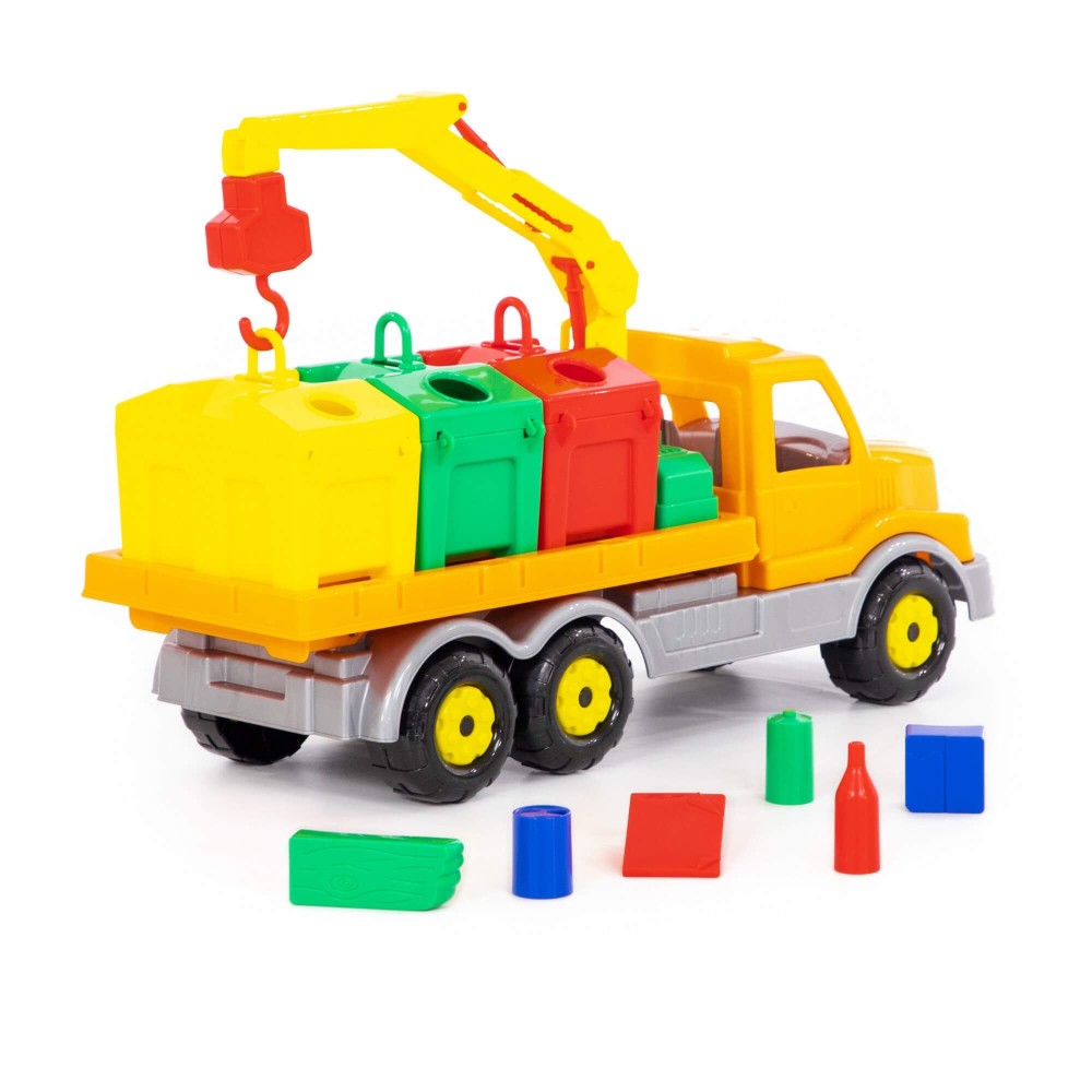 Яркая игрушка, предназначенная для перевозки цветных контейнеров. Ребенок в игровой форме начинает изучать цвета, а так же развивает моторику рук. Автомобиль станет отличным дополнением автопарка Вашего ребенка. На машине установлен поворотный манипулятор с крюком. При помощи этого манипулятора ребенок сможет загружать и снимать контейнеры с платформы автомобиля. Все контейнеры оборудованы отрывающейся крышкой. В них ребенок сможет перевозить различные мелкие грузы. Также автомобиль-контейнеровоз можно использовать как эвакуатор. На игрушке установлена откидывающаяся платформа.