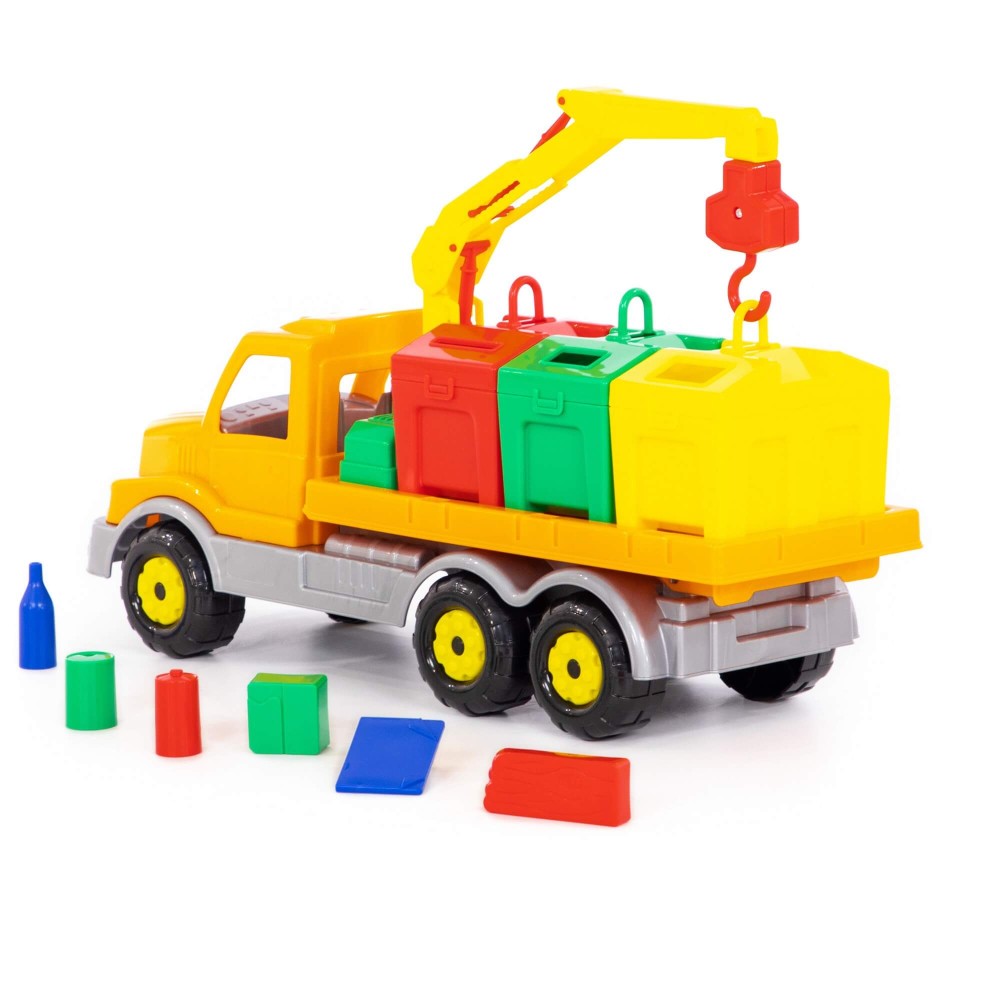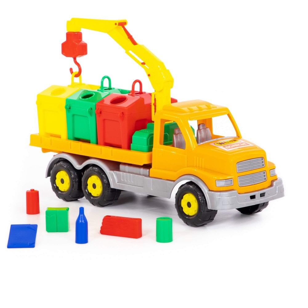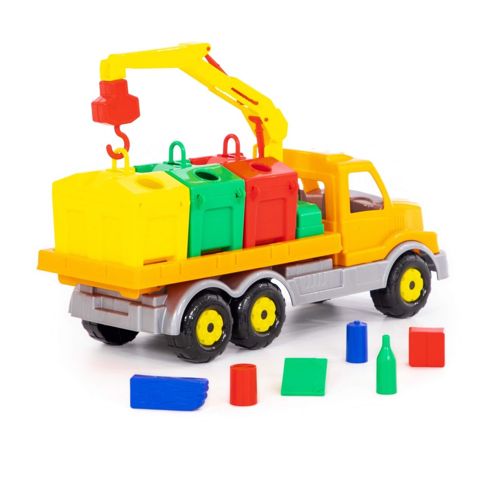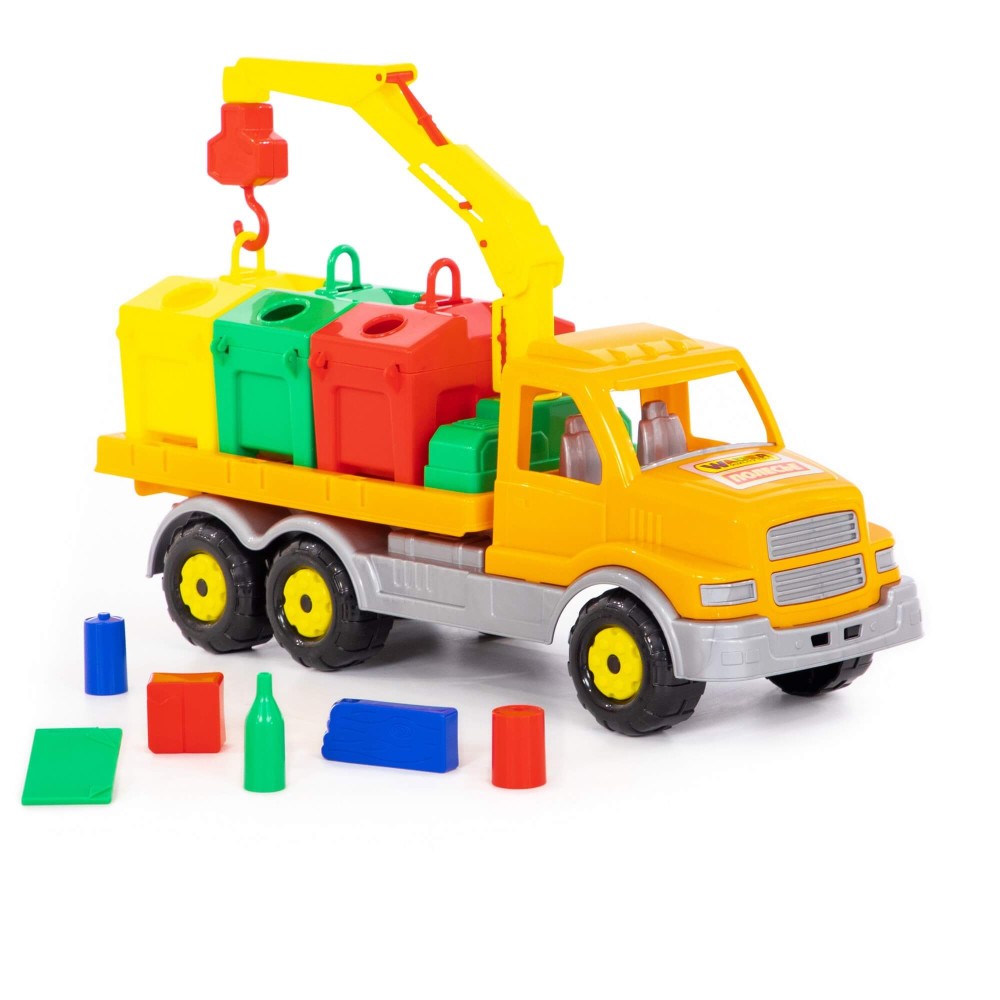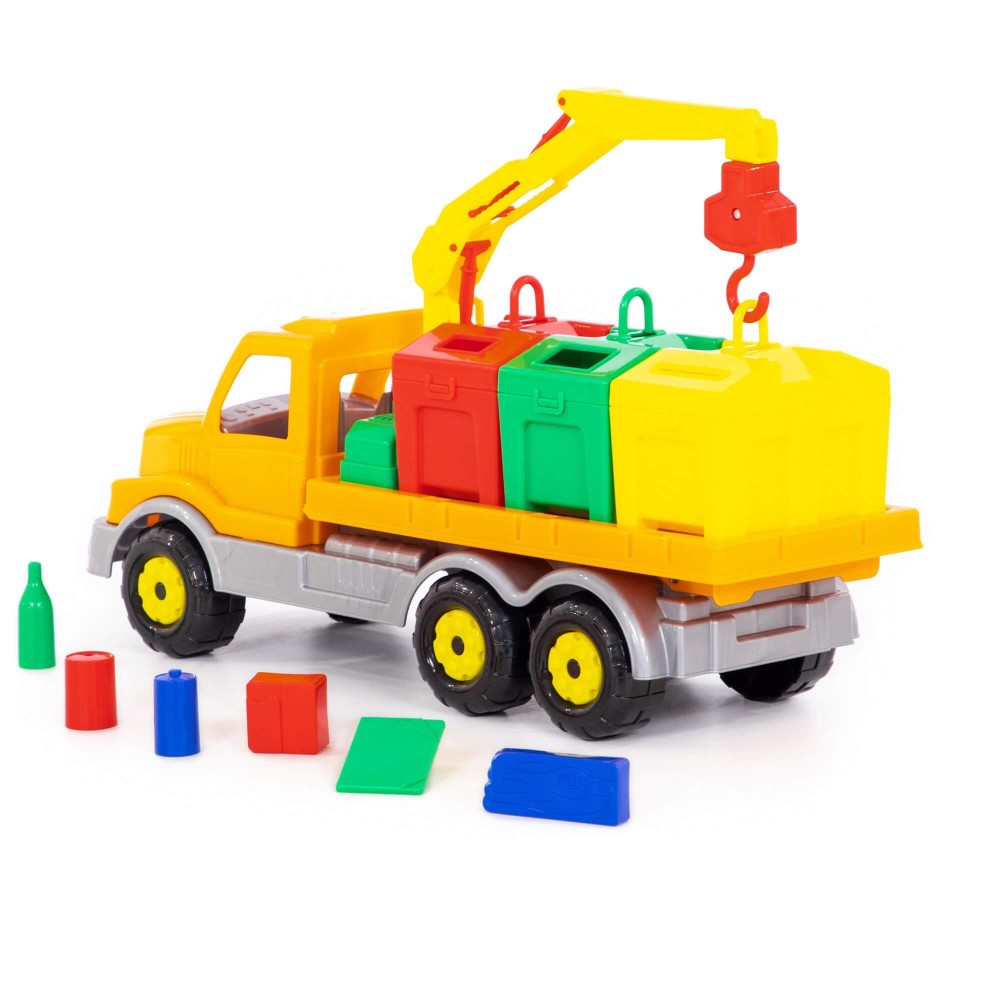 Яркая игрушка, предназначенная для перевозки цветных контейнеров. Ребенок в игровой форме начинает изучать цвета, а так же развивает моторику рук. Автомобиль станет отличным дополнением автопарка Вашего ребенка. На машине установлен поворотный манипулятор с крюком. При помощи этого манипулятора ребенок сможет загружать и снимать контейнеры с платформы автомобиля. Все контейнеры оборудованы отрывающейся крышкой. В них ребенок сможет перевозить различные мелкие грузы. Также автомобиль-контейнеровоз можно использовать как эвакуатор. На игрушке установлена откидывающаяся платформа.