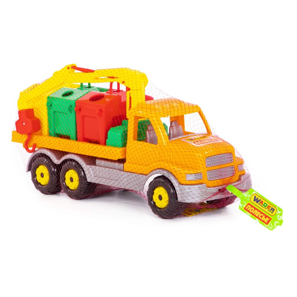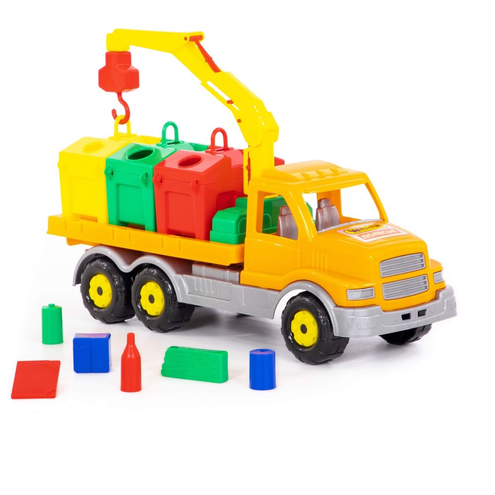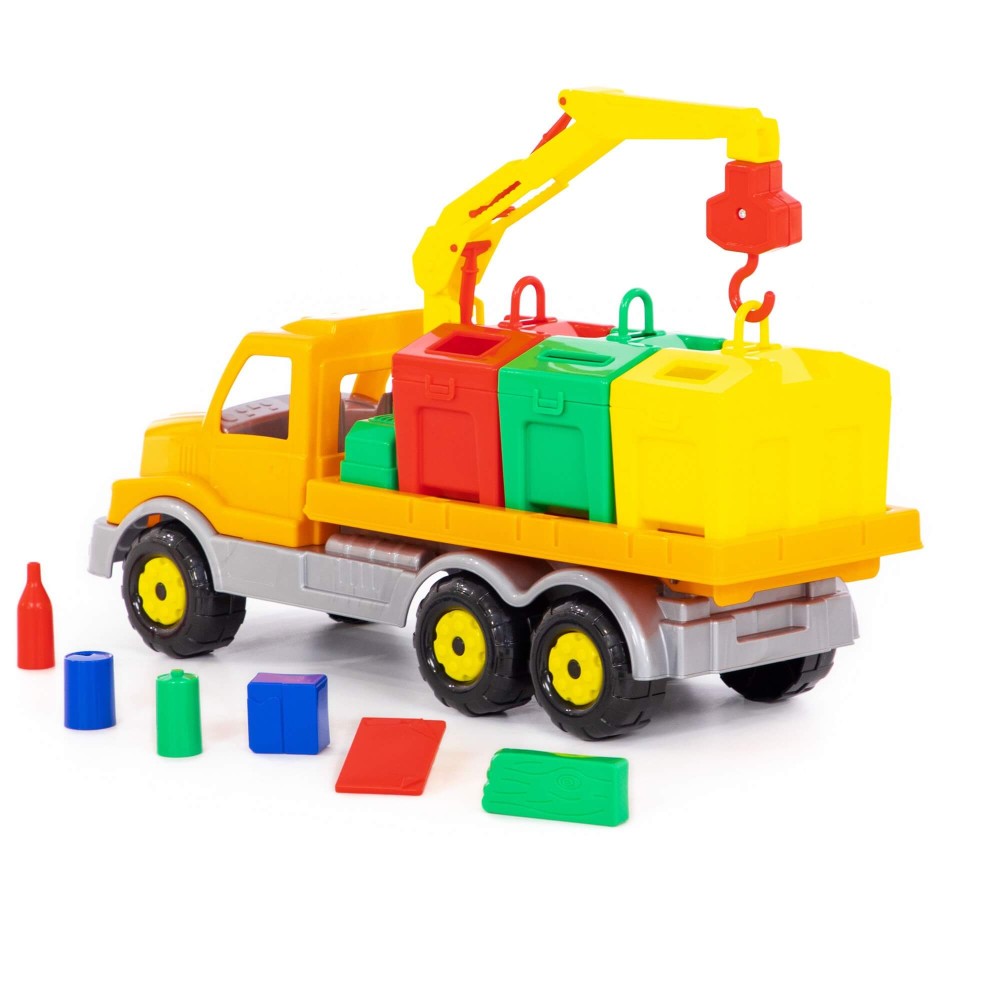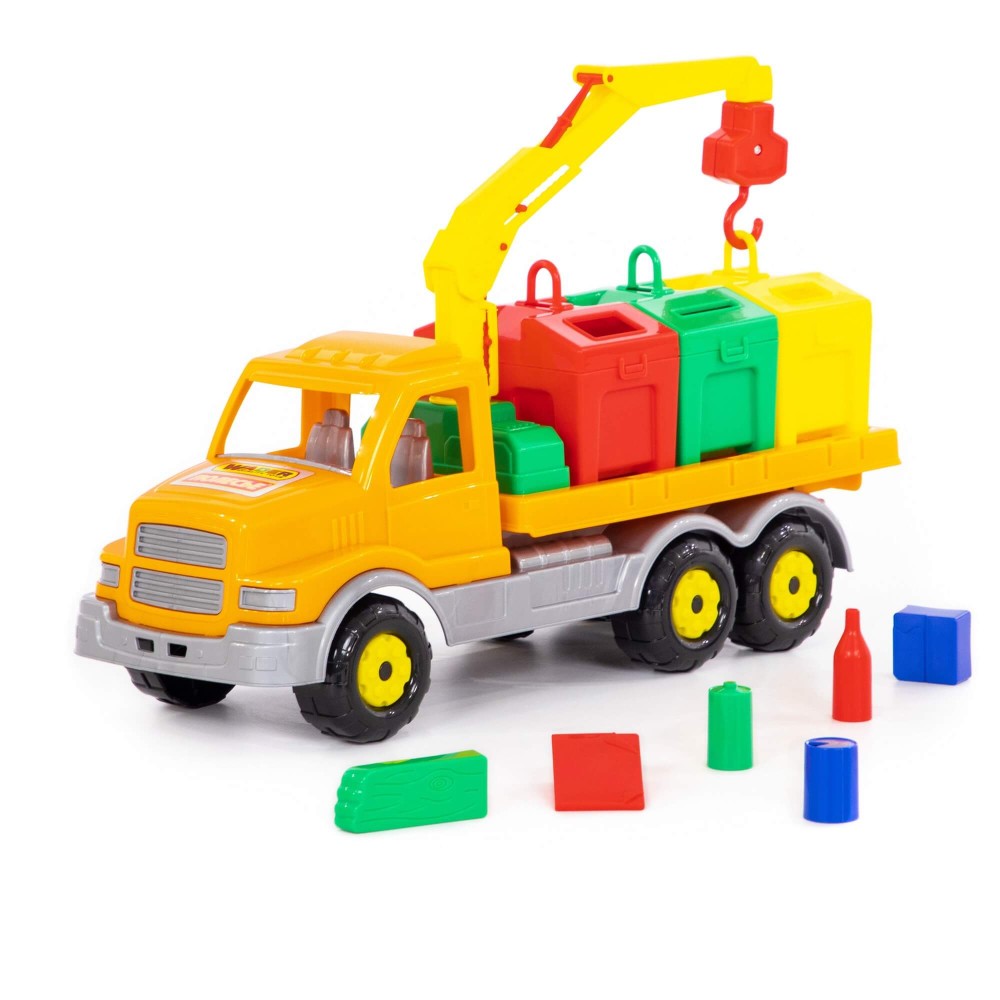 Яркая игрушка, предназначенная для перевозки цветных контейнеров. Ребенок в игровой форме начинает изучать цвета, а так же развивает моторику рук. Автомобиль станет отличным дополнением автопарка Вашего ребенка. На машине установлен поворотный манипулятор с крюком. При помощи этого манипулятора ребенок сможет загружать и снимать контейнеры с платформы автомобиля. Все контейнеры оборудованы отрывающейся крышкой. В них ребенок сможет перевозить различные мелкие грузы. Также автомобиль-контейнеровоз можно использовать как эвакуатор. На игрушке установлена откидывающаяся платформа.