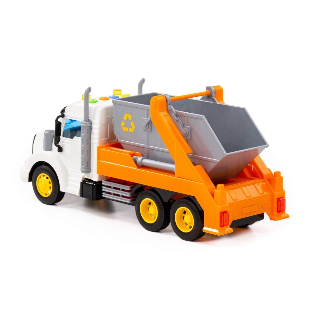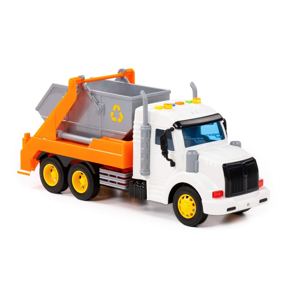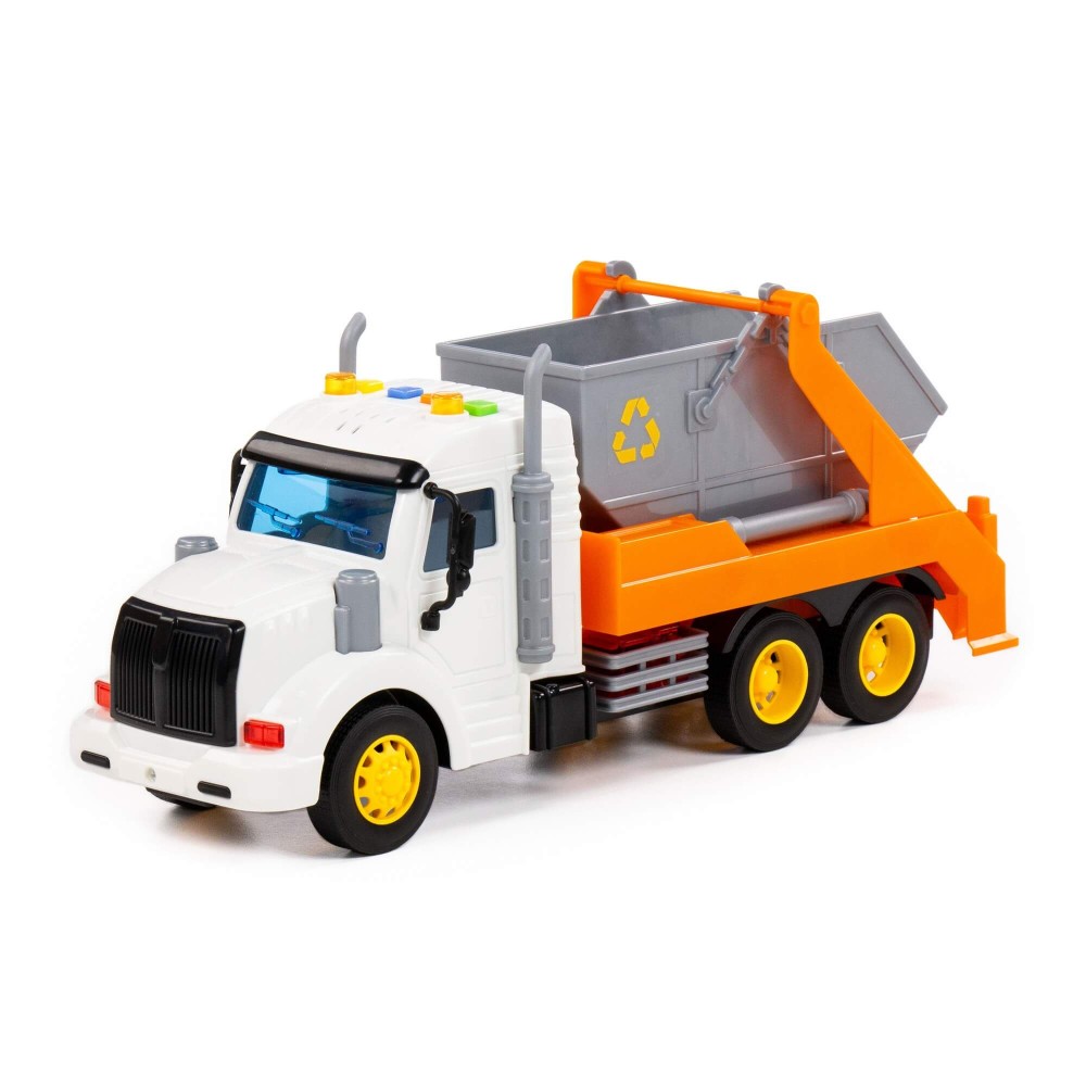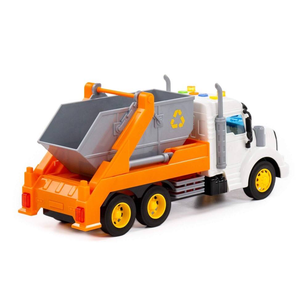 Автомобиль-контейнеровоз инерционный «Профи» от фабрики «Полесье» - это качественная реалистичная игрушка, конструкция которой полностью повторяет дизайн настоящей техники. Спецмашина имеет три пары колёс на железных осях, кроме того, она оснащена съёмным контейнером, который позволит придумывать различные сценарии игры. На кабине авто имеется 4 кнопки управления звуковыми и световыми эффектами.
