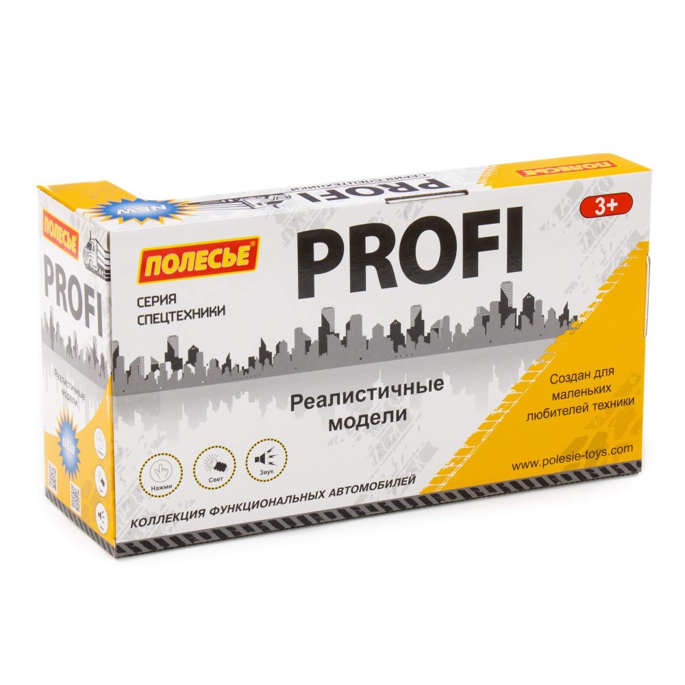 Автомобиль-самосвал инерционный «Профи» от фабрики «Полесье» - это качественная реалистичная игрушка, конструкция которой полностью повторяет дизайн настоящей техники. Спецмашина имеет три пары колёс на железных осях, кроме того, она оснащена подвижным кузовом, который позволит придумывать различные сценарии игры. На кабине авто имеется 4 кнопки управления звуковыми и световыми эффектами.