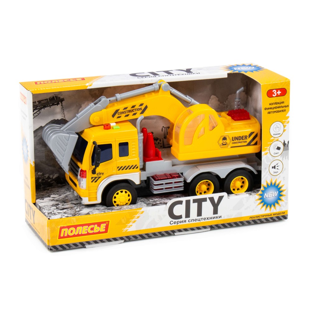 Автомобиль-экскаватор инерционный «Сити» от фабрики «Полесье» - это качественная реалистичная игрушка, конструкция которой полностью повторяет дизайн настоящей техники. Спецмашина имеет три пары колёс на металлических осях, кроме того, она оснащена поворотной платформой с подвижным ковшом, который позволит придумывать различные сценарии игры. На кабине авто имеется 4 кнопки управления звуковыми и световыми эффектами.