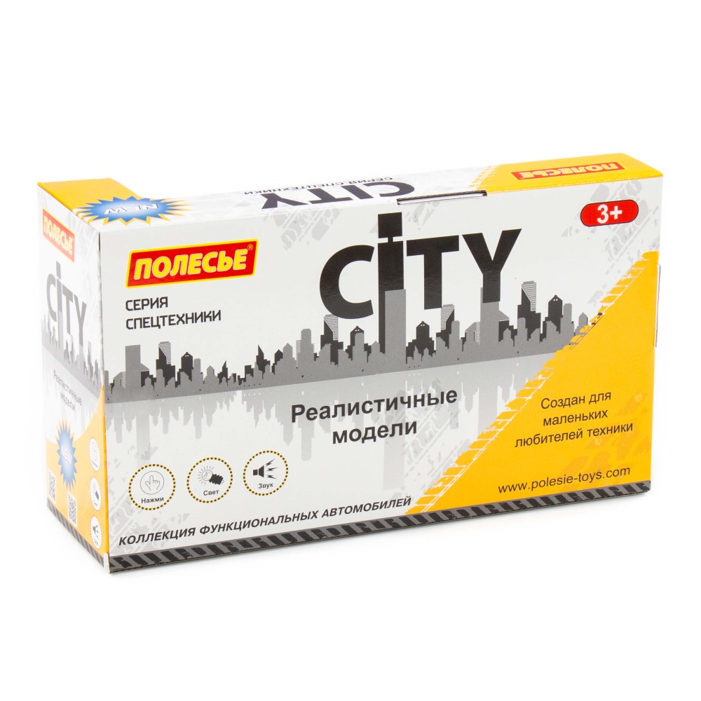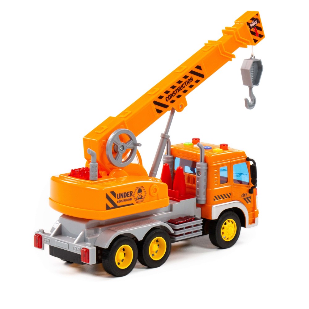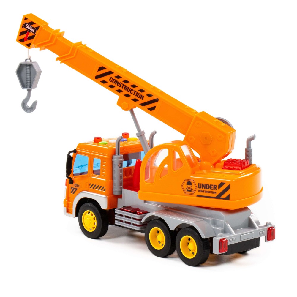 Автомобиль-кран инерционный «Сити» от фабрики «Полесье» - это качественная реалистичная игрушка, конструкция которой полностью повторяет дизайн настоящей техники. Спецмашина имеет три пары колёс на металлических осях, кроме того, она оснащена поворотной платформой с подвижным краном, который позволит придумывать различные сценарии игры. На кабине авто имеется 4 кнопки управления звуковыми и световыми эффектами.