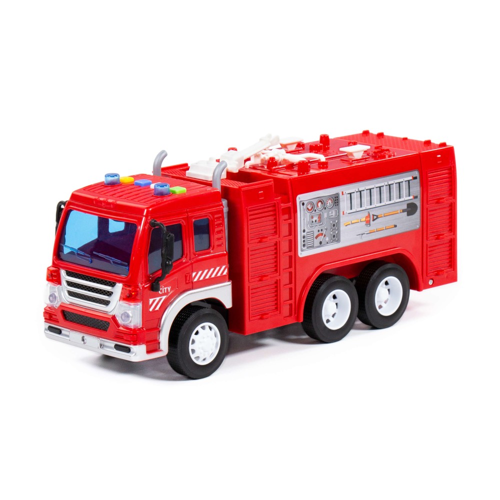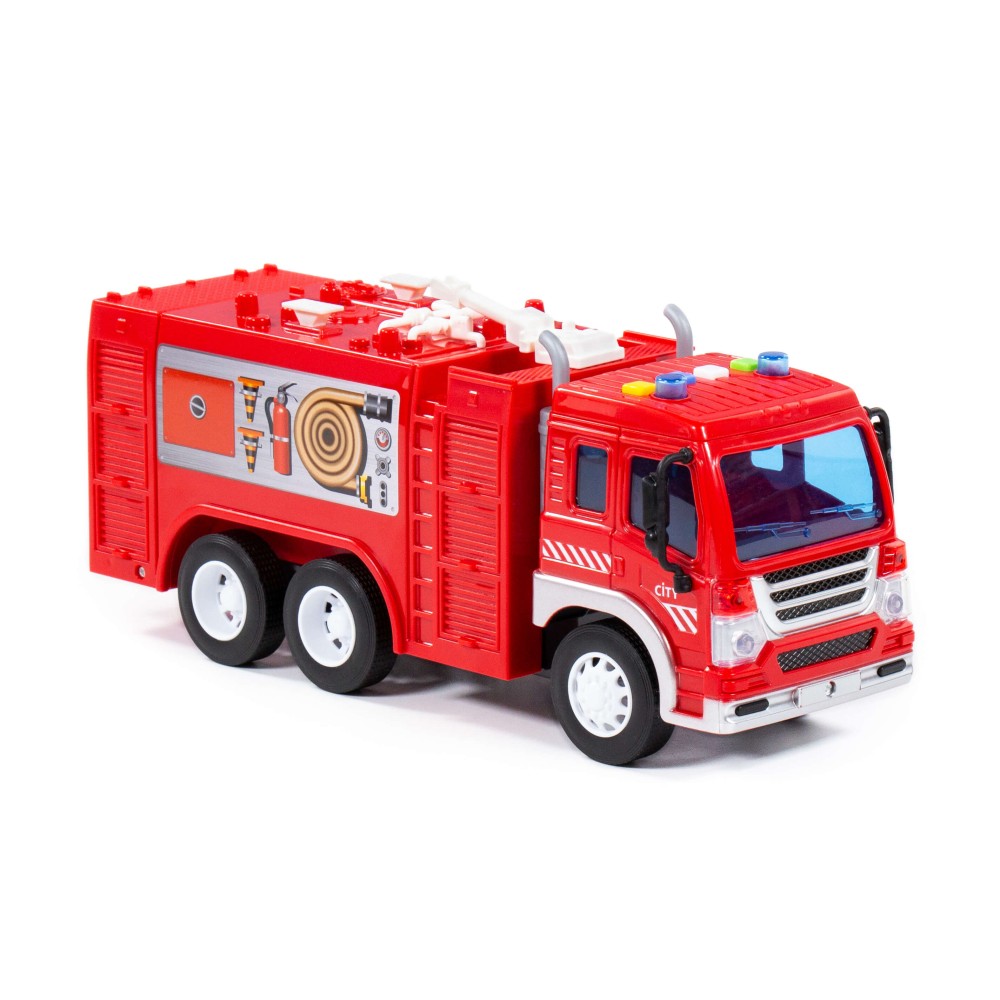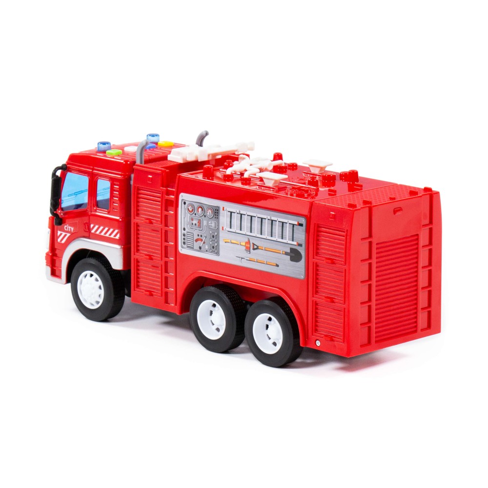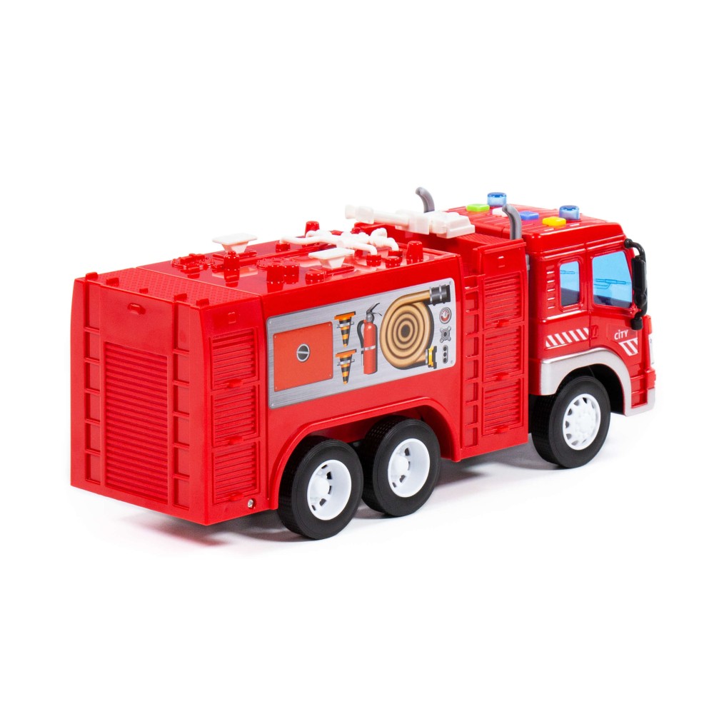 Автомобиль-пожарный инерционный «Сити» от фабрики «Полесье» - это качественная реалистичная игрушка, конструкция которой полностью повторяет дизайн настоящей техники. Спецмашина имеет три пары колёс на металлических осях, кроме того, она оснащена пожарной цистерной для воды, которая позволит придумывать различные сценарии игры. На кабине авто имеется 4 кнопки управления звуковыми и световыми эффектами.