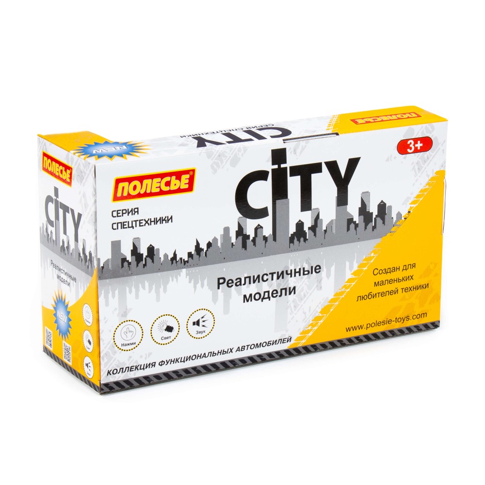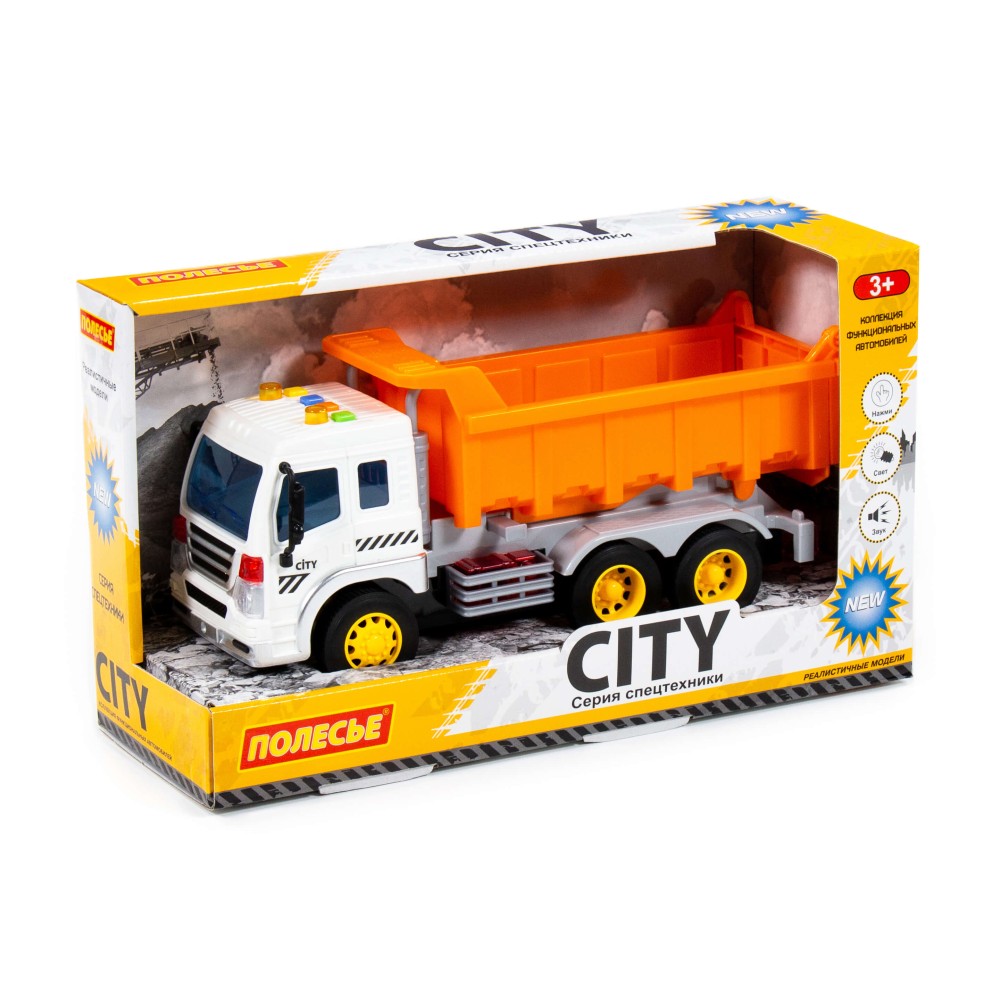 Автомобиль-самосвал инерционный «Сити» от фабрики «Полесье» - это качественная реалистичная игрушка, конструкция которой полностью повторяет дизайн настоящей техники. Спецмашина имеет три пары колёс на металлических осях, кроме того, она оснащена подвижным кузовом, который позволит придумывать различные сценарии игры. На кабине авто имеется 4 кнопки управления звуковыми и световыми эффектами.