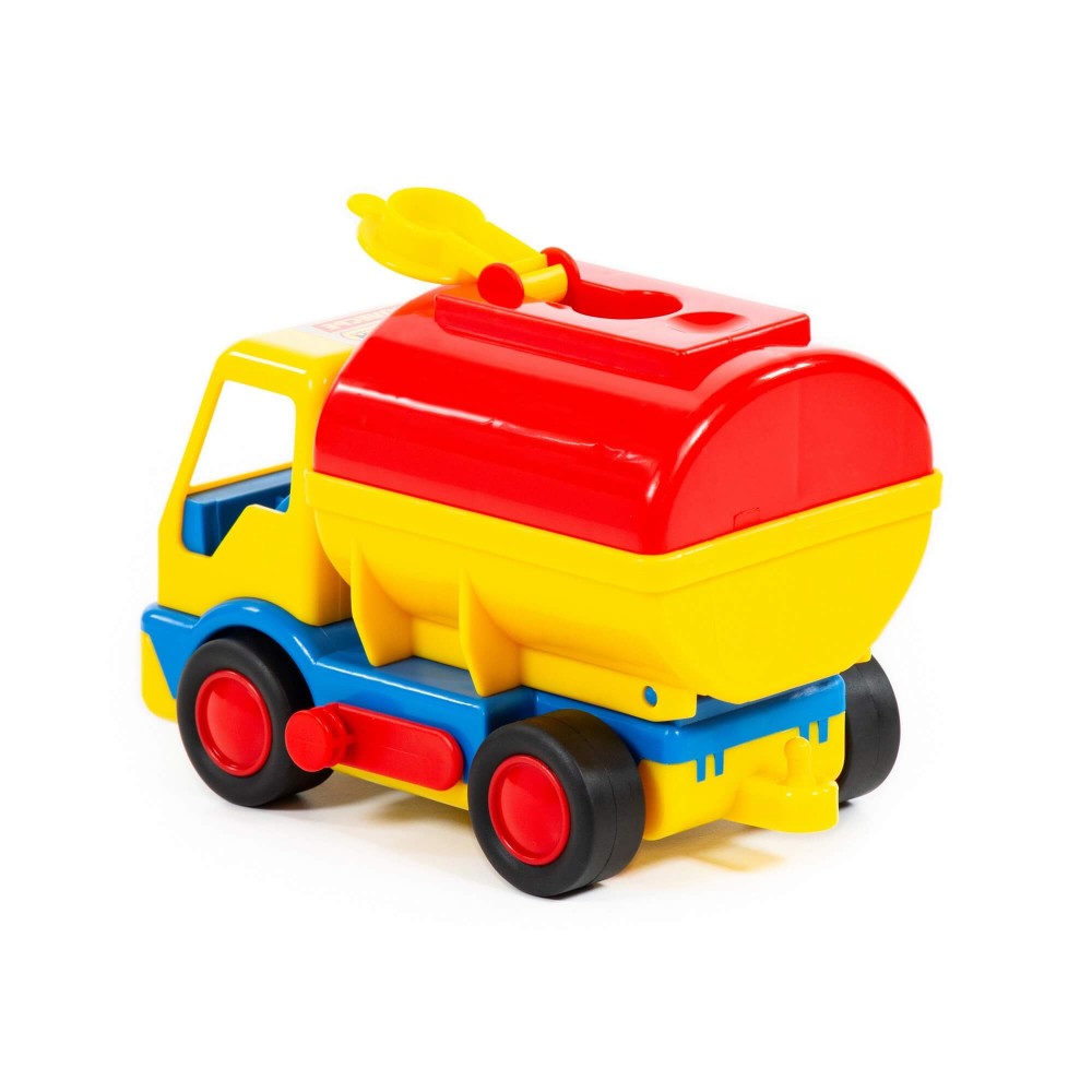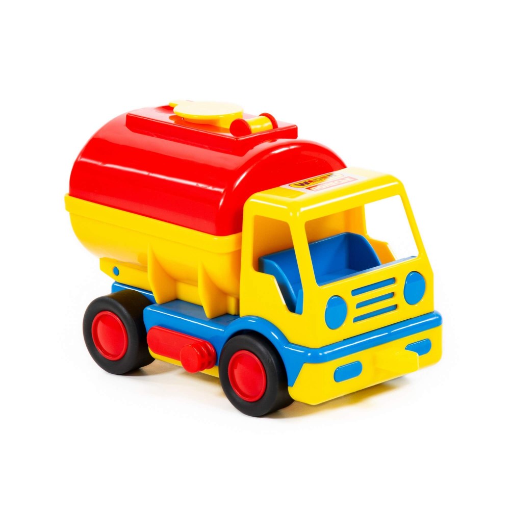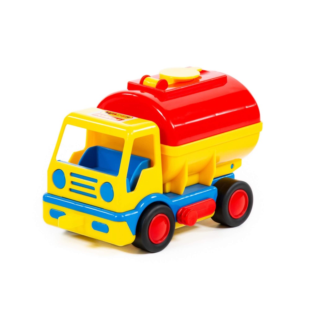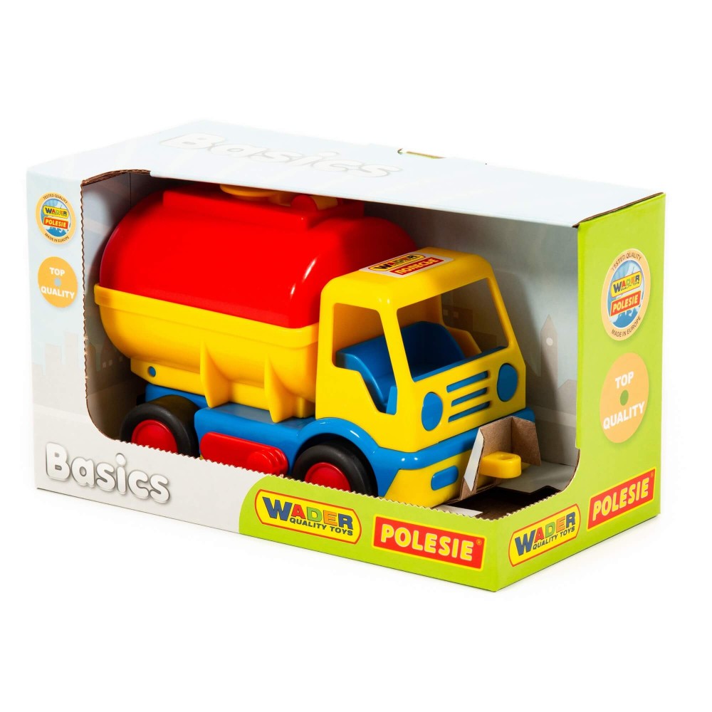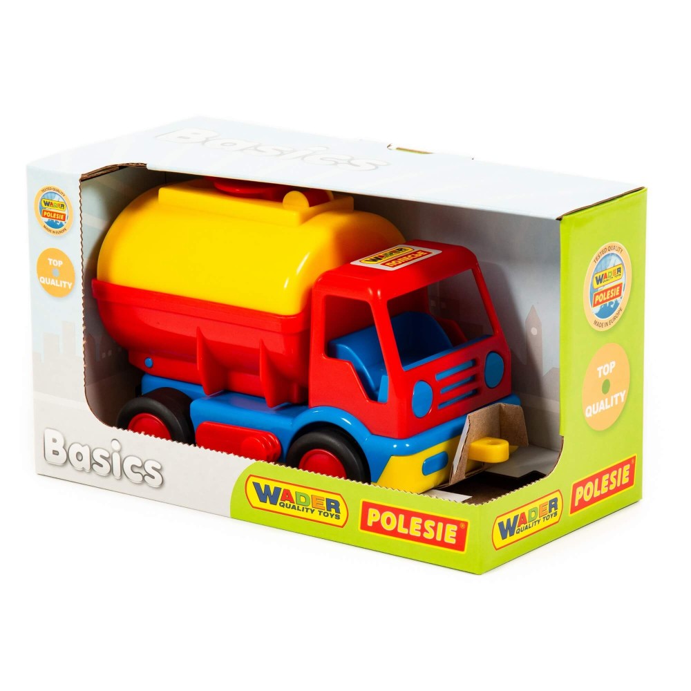 Стильные, удобные и небольшие машинки для малыша от фабрики «Полесье» — это серия «Базик». Они отличаются компактным размером, продуманной эргономикой, расцветкой и функционалом. Автомобиль-бензовоз относится к спецтехнике и предназначен для перевозки топлива. Сверху в цистерне автомобиля имеется отверстие с резиновой заглушкой, которое позволяет наливать в ёмкость воду. Цистерна подымается, если потянуть за специальную рукоятку. Колёса автомобиля — с резиновыми накладками, что обеспечивает практически бесшумное катание игрушки на любой поверхности. Наличие буксировочной петли на переднем бампере автомобиля позволяет возить машинку за собой на верёвочке.