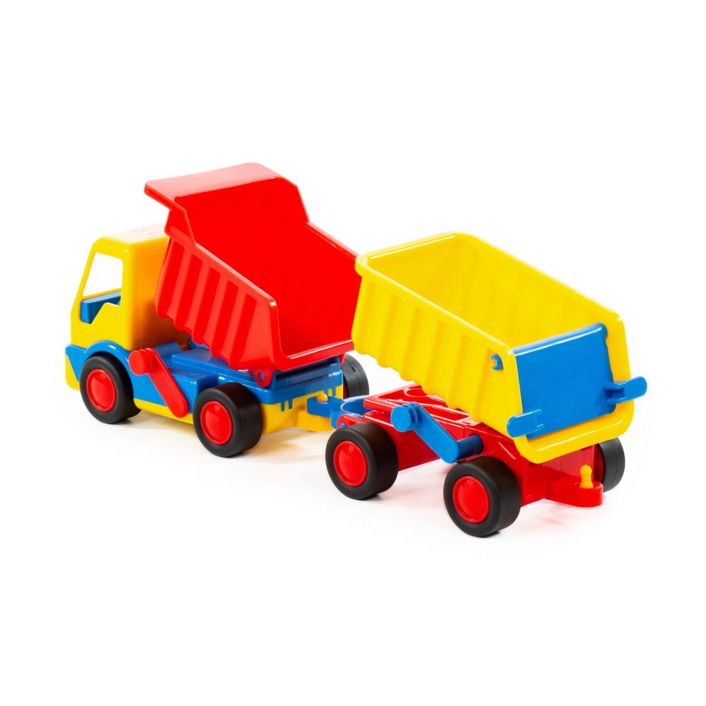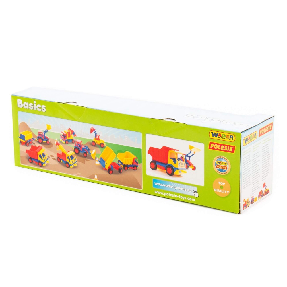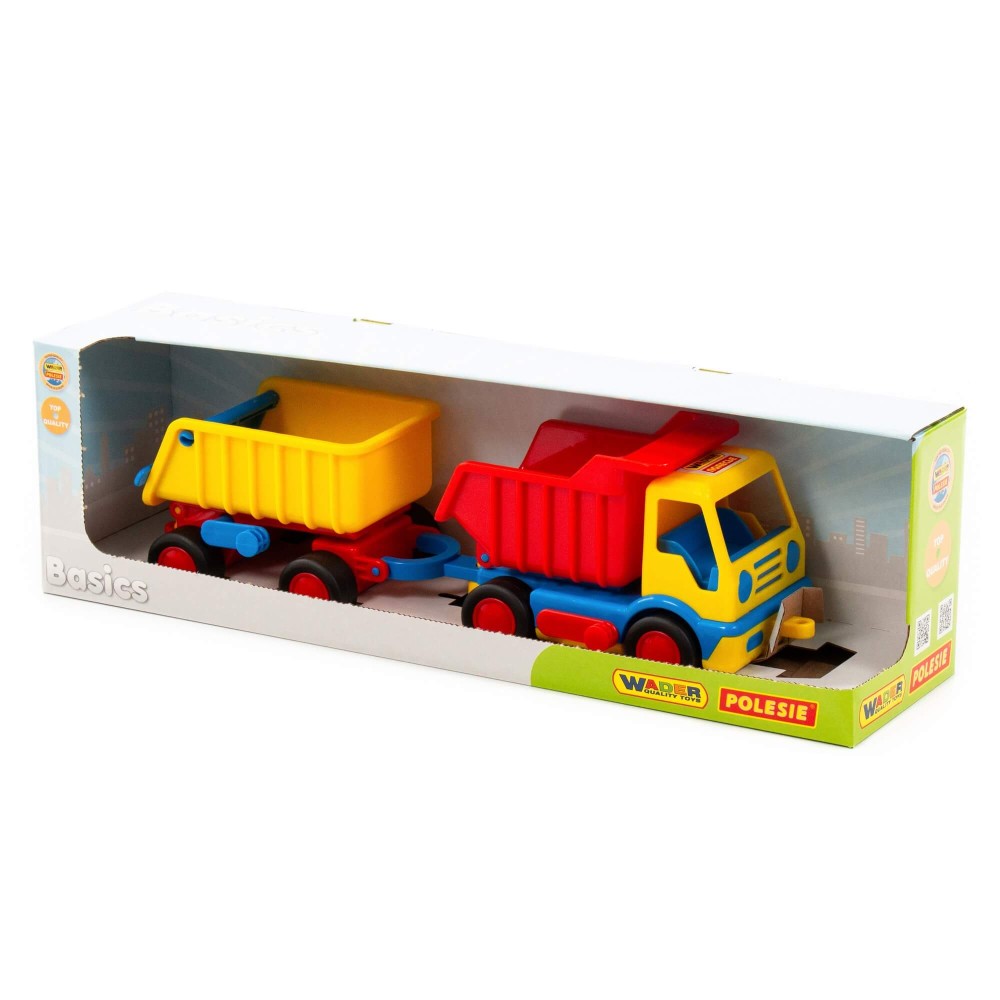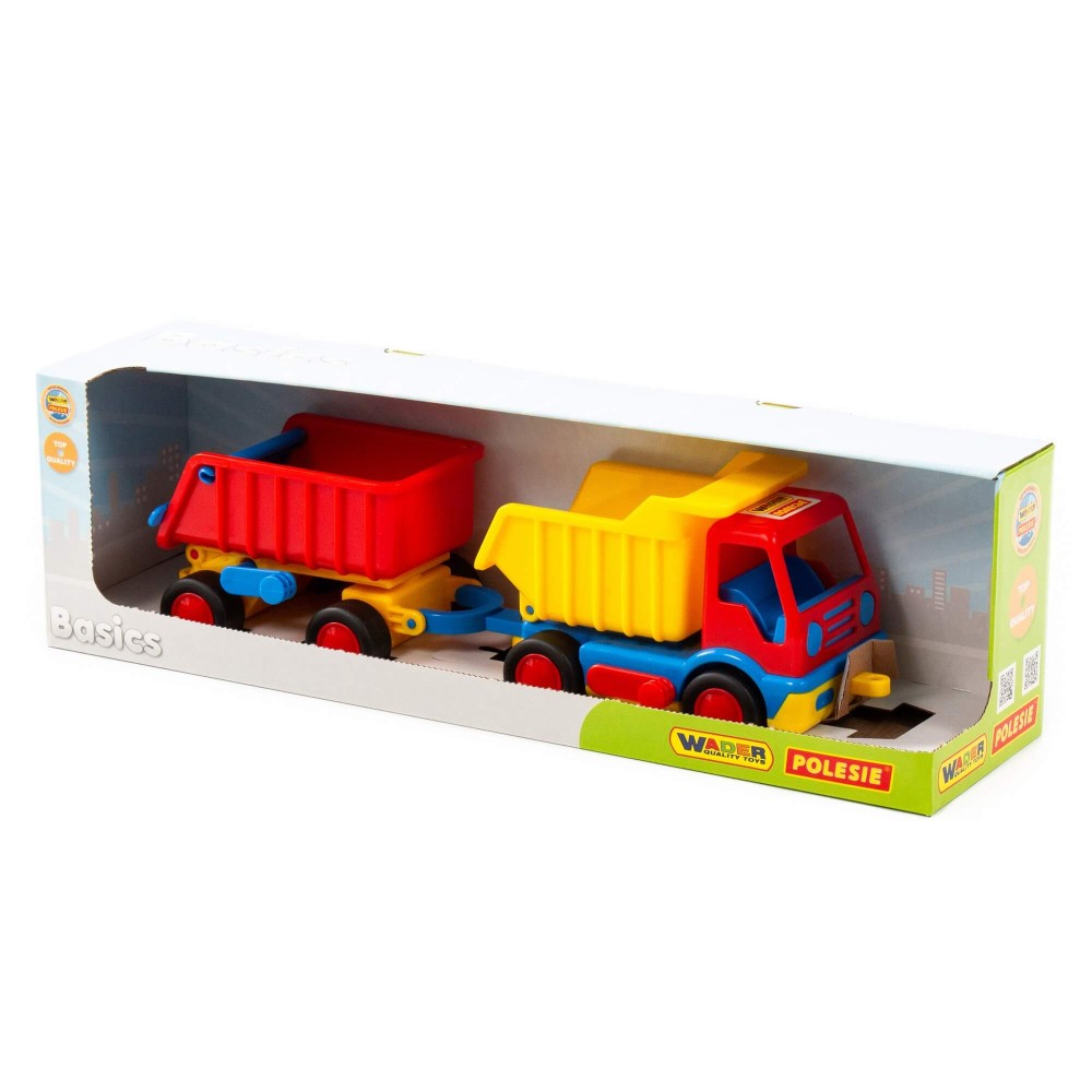 Стильные, удобные и небольшие машинки для малыша от фабрики «Полесье» — это серия «Базик». Они отличаются компактным размером, продуманной эргономикой, расцветкой и функционалом. Кузов автомобиля-самосвала подымается и фиксируется при помощи рычажка. Колеса — с резиновыми накладками, что обеспечивает практически бесшумное катание игрушки на любой поверхности. В данном варианте к автомобилю-самосвалу крепится прицеп, что позволяет перевозить больше грузов. Прицеп функциональный: кузов также подымается при помощи рычажка, а задний борт поворачивается. Наличие буксировочной петли на переднем бампере автомобиля позволяет возить машинку за собой на верёвочке.
