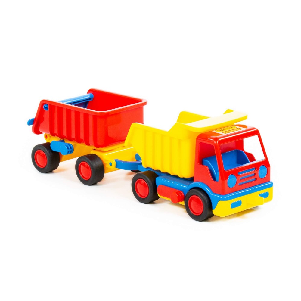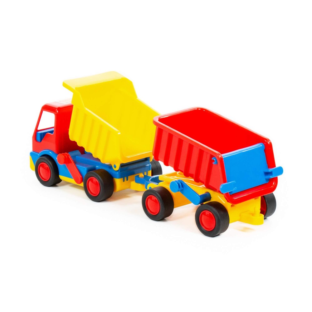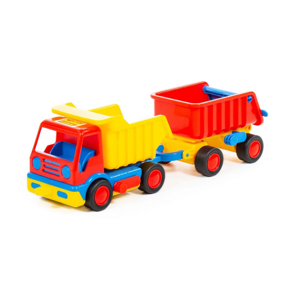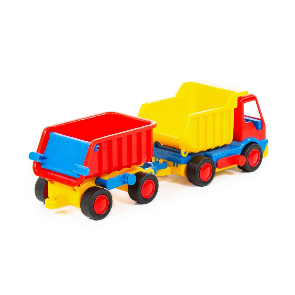 Стильные, удобные и небольшие машинки для малыша от фабрики «Полесье» — это серия «Базик». Они отличаются компактным размером, продуманной эргономикой, расцветкой и функционалом. Кузов автомобиля-самосвала подымается и фиксируется при помощи рычажка. Колеса — с резиновыми накладками, что обеспечивает практически бесшумное катание игрушки на любой поверхности. В данном варианте к автомобилю-самосвалу крепится прицеп, что позволяет перевозить больше грузов. Прицеп функциональный: кузов также подымается при помощи рычажка, а задний борт поворачивается. Наличие буксировочной петли на переднем бампере автомобиля позволяет возить машинку за собой на верёвочке.