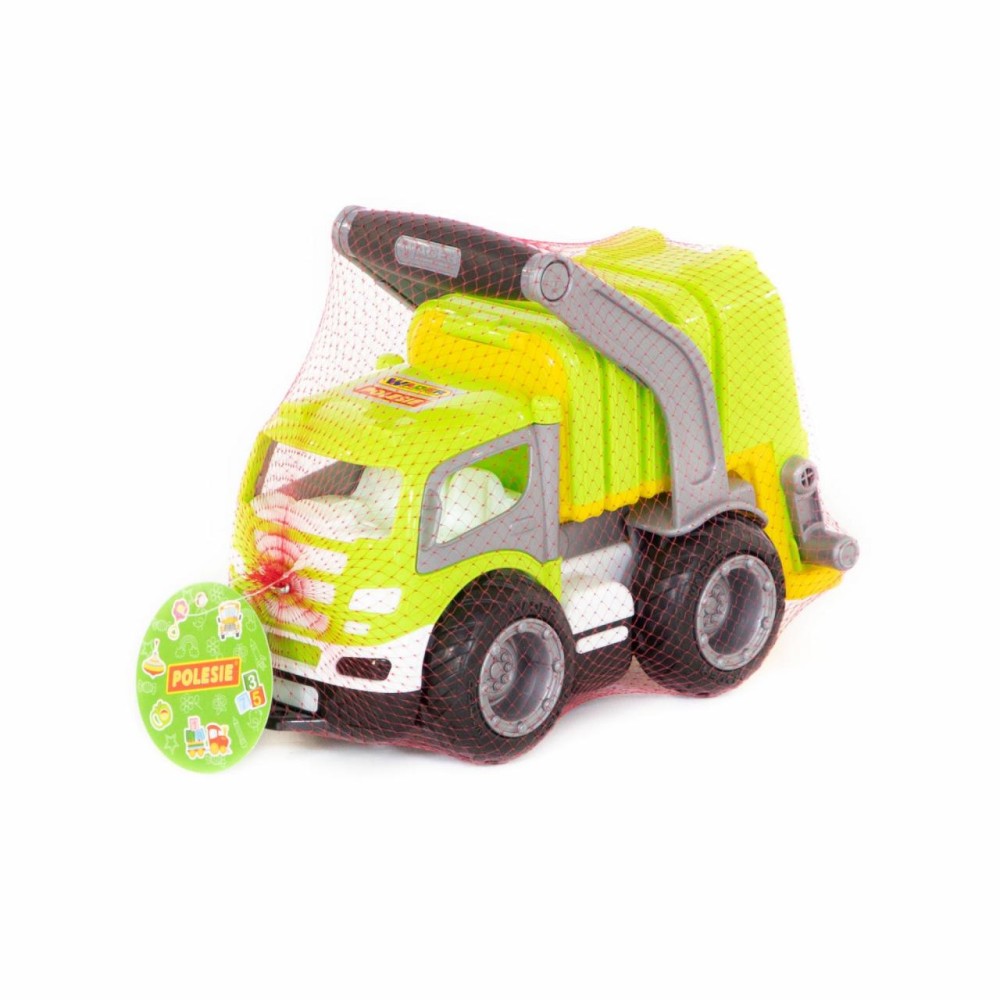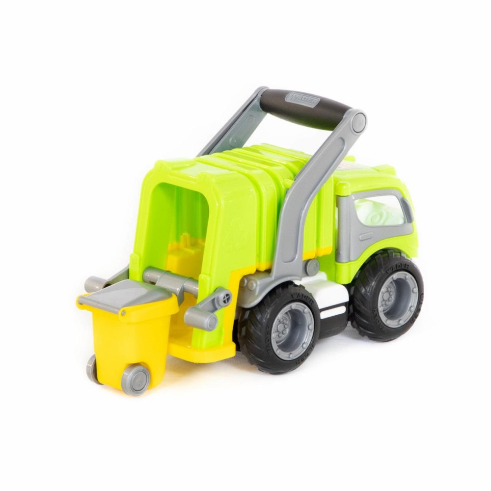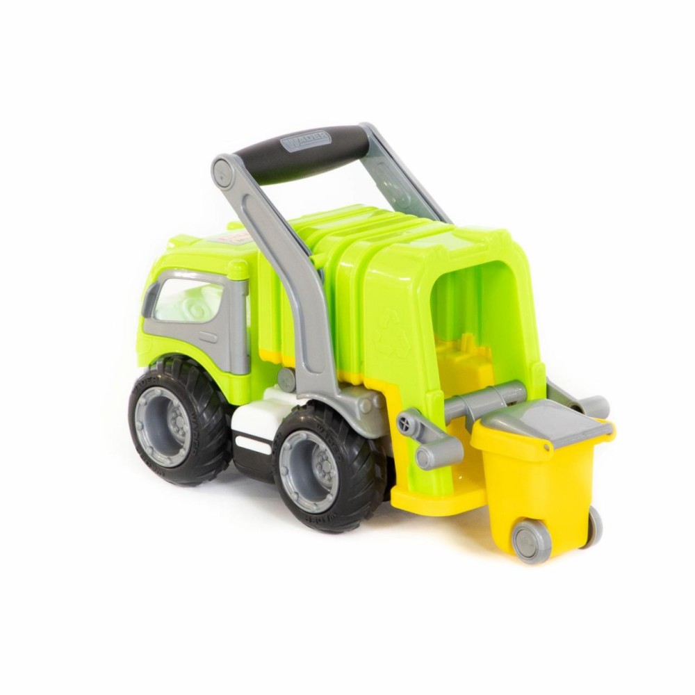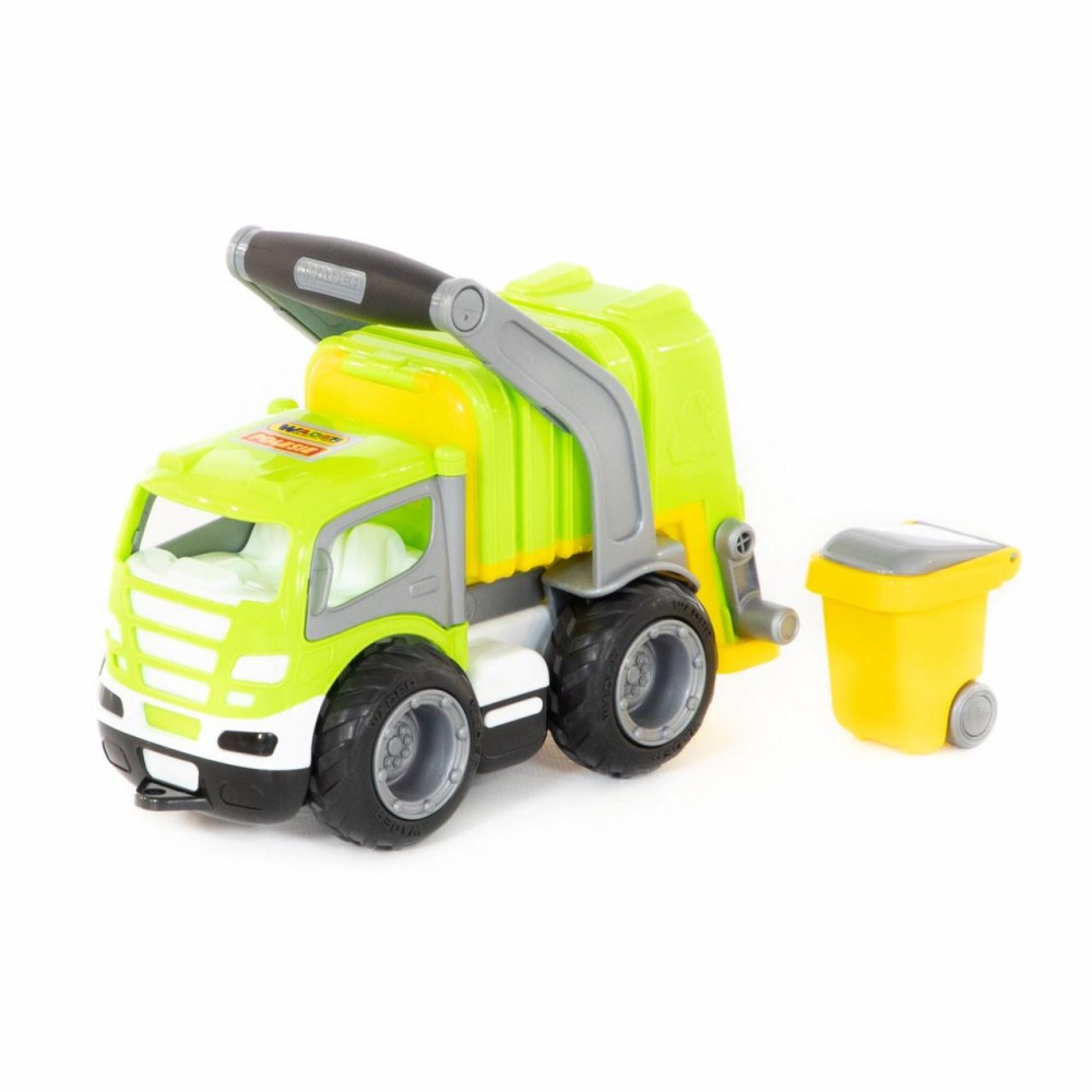 Коммунальный автомобиль всегда вызывает у детей повышенный интерес из-за своих функциональных особенностей. С помощью приятной на ощупь прорезиненной ручки можно снять кузов и установить его откидную подставку. В комплект входит мусорный бак на колёсиках, который опрокидывается в кузов мусоровоза специальными ручками. Кроме того, у автомобиля открываются дверки кабины, туда ребенок может посадить свои игрушки в качестве водителя и пассажира. Еще одна особенность «ГрипТрака» — резиновые колеса с большим протектором: обеспечивают лучшее, чем пластиковые, сцепление с различными поверхностями, а также меньший уровень шума.