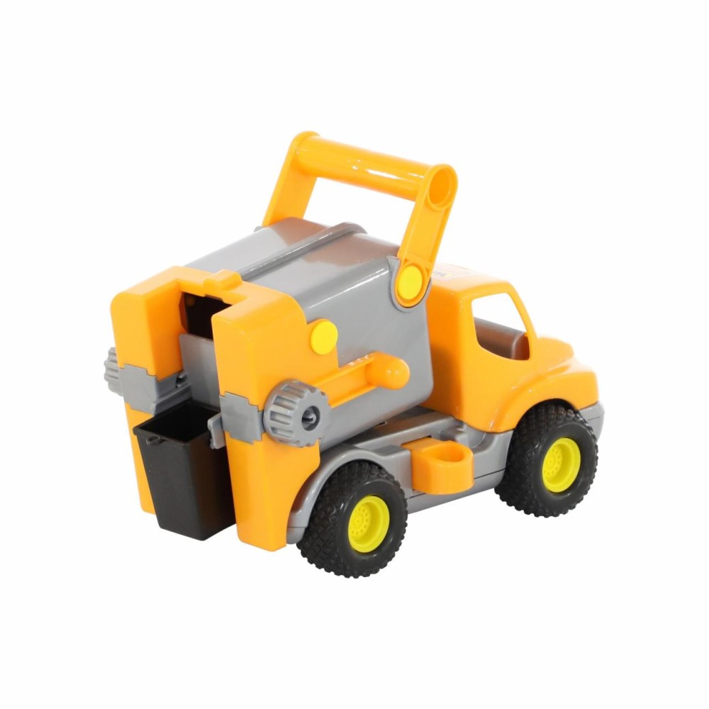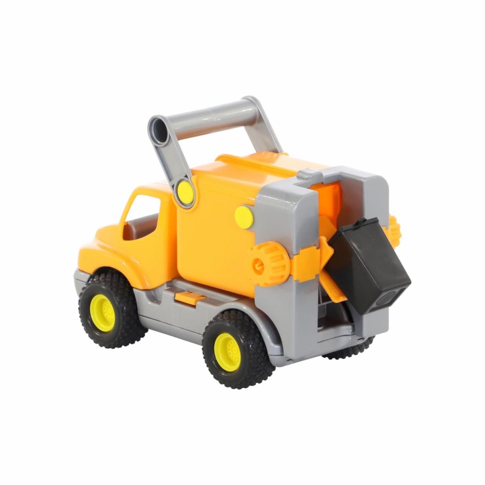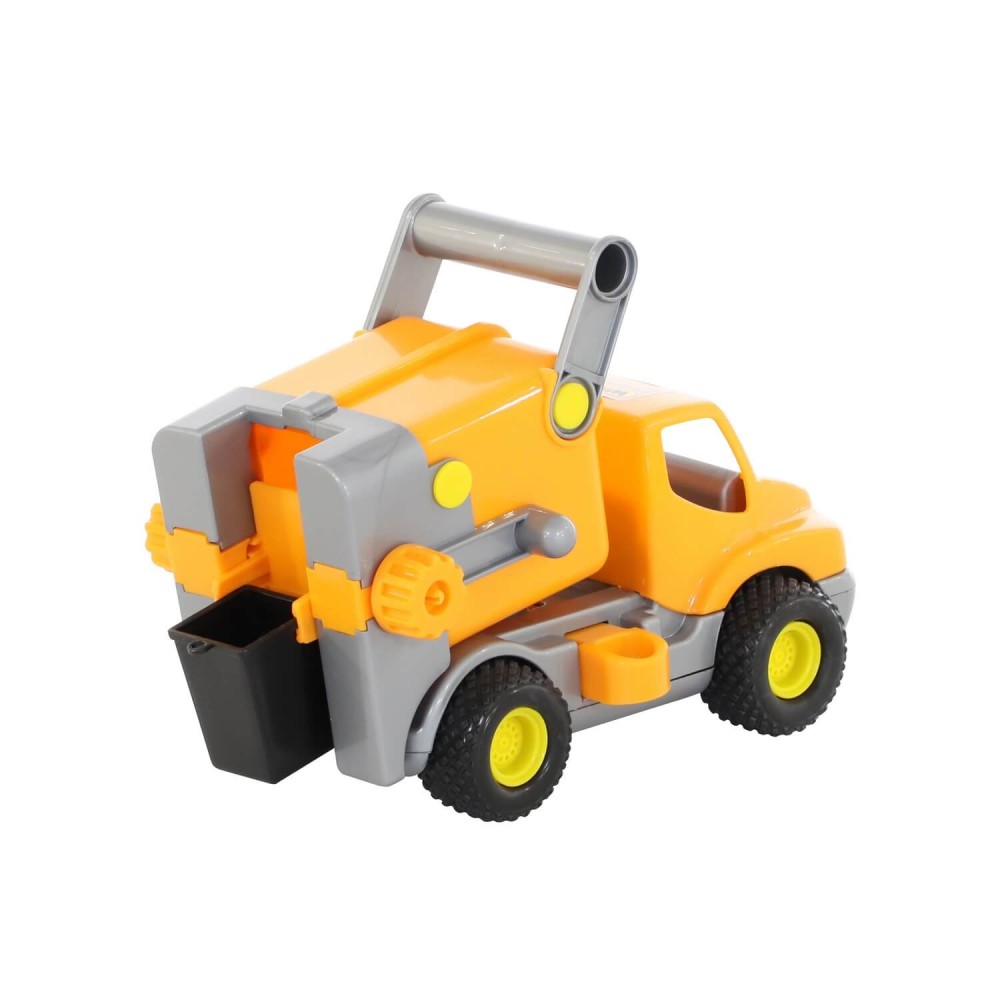 Машинка оборудована резиновыми шинами с крупным протектором, что обеспечивает высокую проходимость и бесшумное движение по различным видам поверхностей. Игрушку легко переносить благодаря специальной ручке. За счет оснащения подвижными элементами, коммунальным автомобилем интересно играть как дома, так на свежем воздухе. Машинка оснащена механической системой подъема и выгрузки съемного контейнера для мусора.