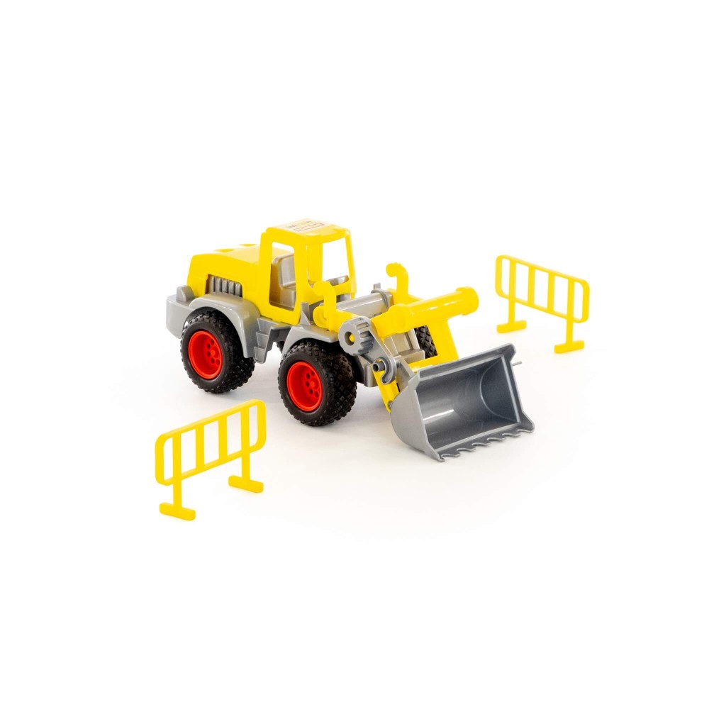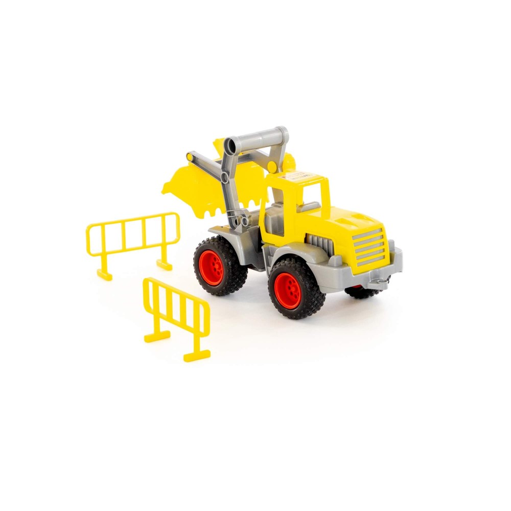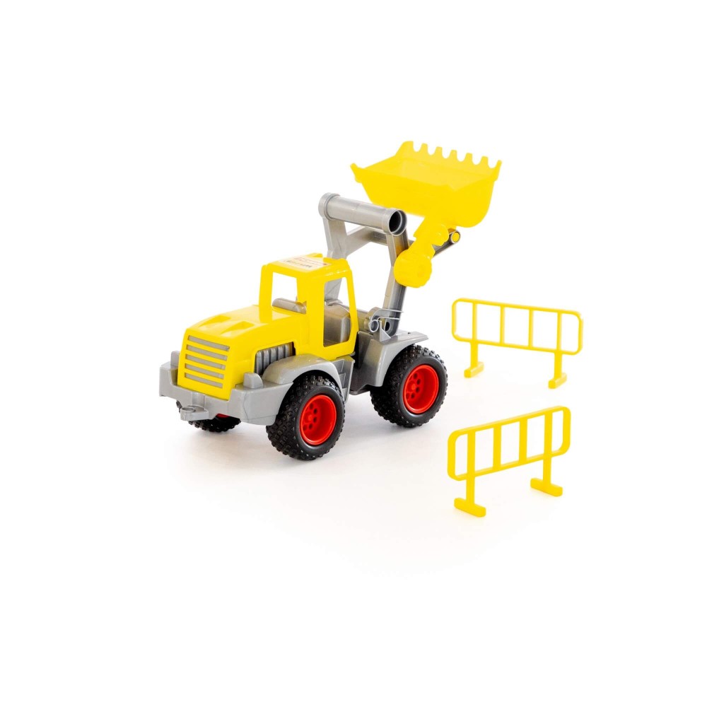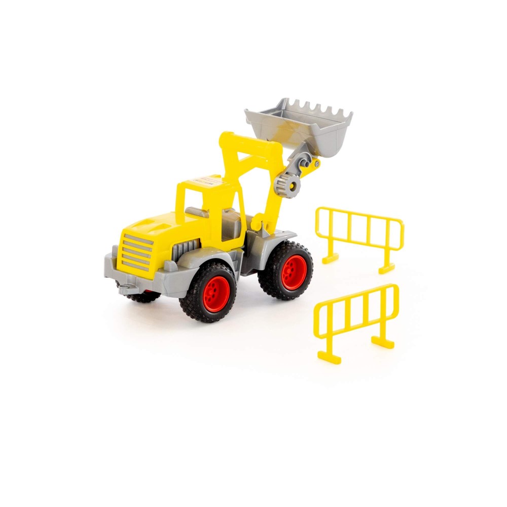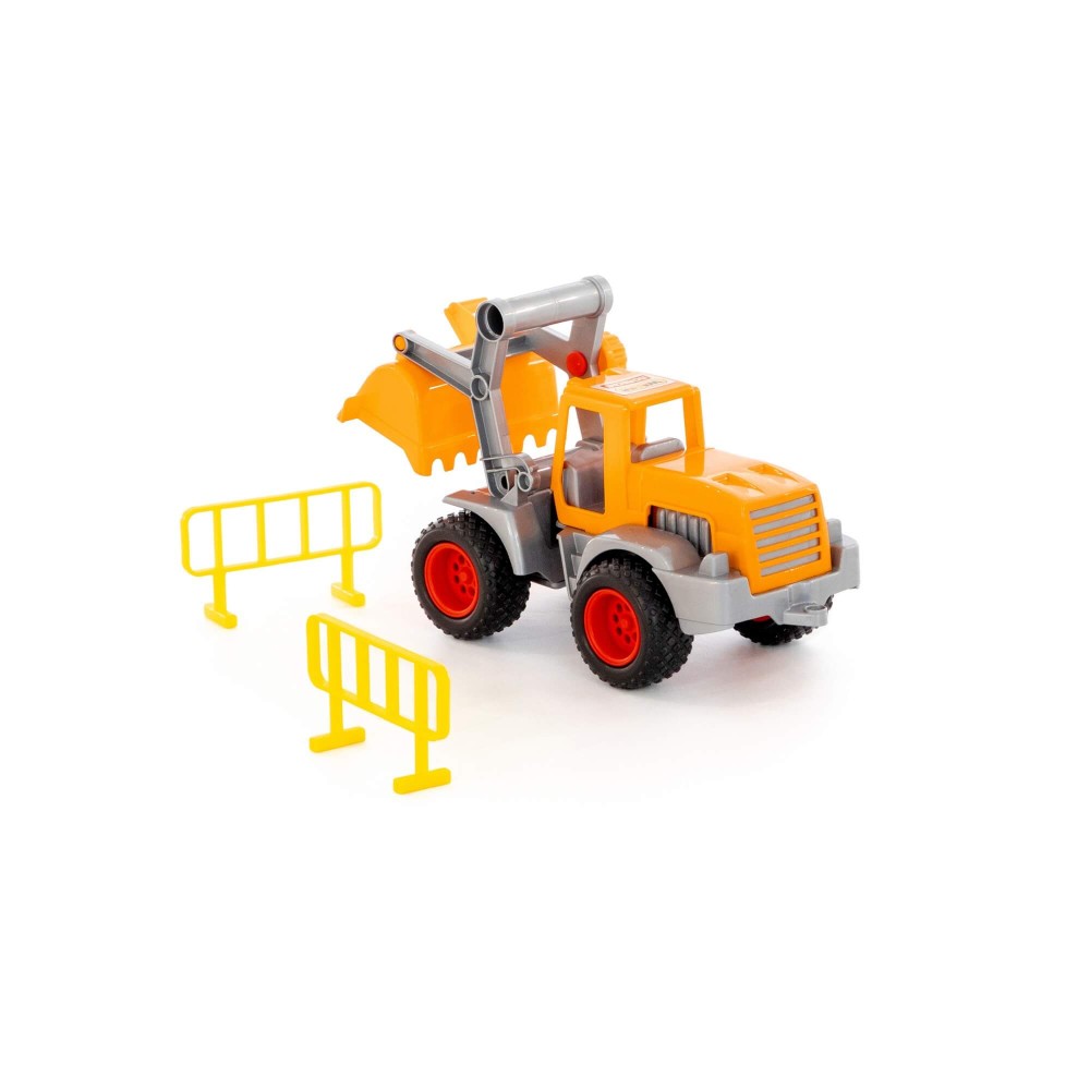 Игрушка выполнена в запоминающейся цветовой гамме из высококачественных материалов. Машинка оборудована резиновыми шинами с крупным протектором, что обеспечивает высокую проходимость и бесшумное движение по различным видам поверхностей, ей интересно играть как дома, так на свежем воздухе. Трактор-погрузчик оборудован подвижным ковшом для совершения манипуляций с различными грузами. В комплект к строительной технике входят специальные ограждения.