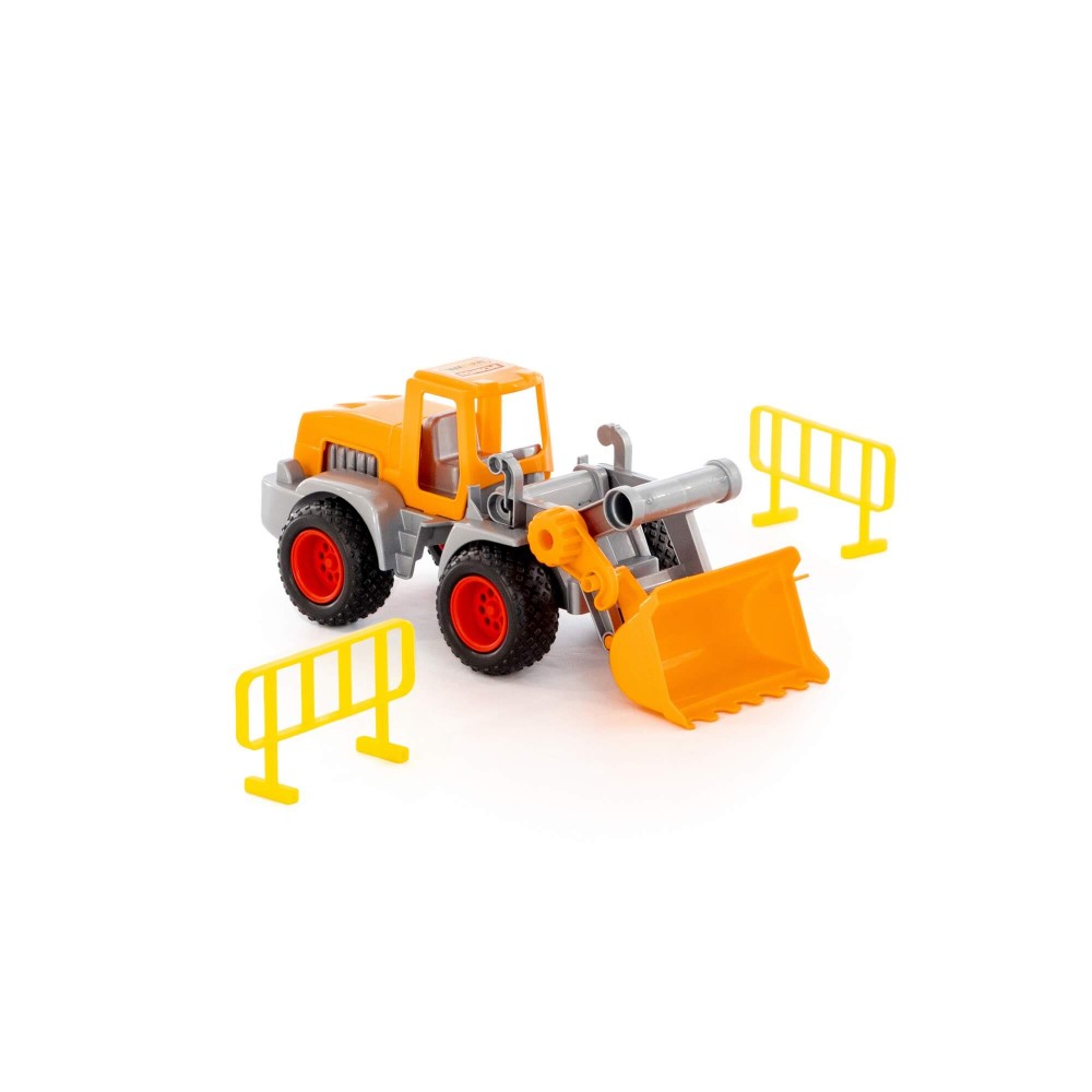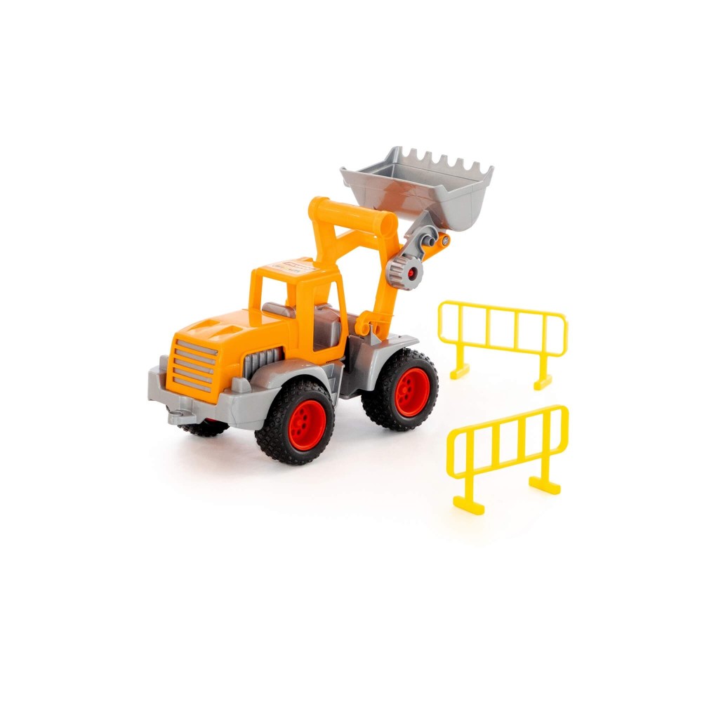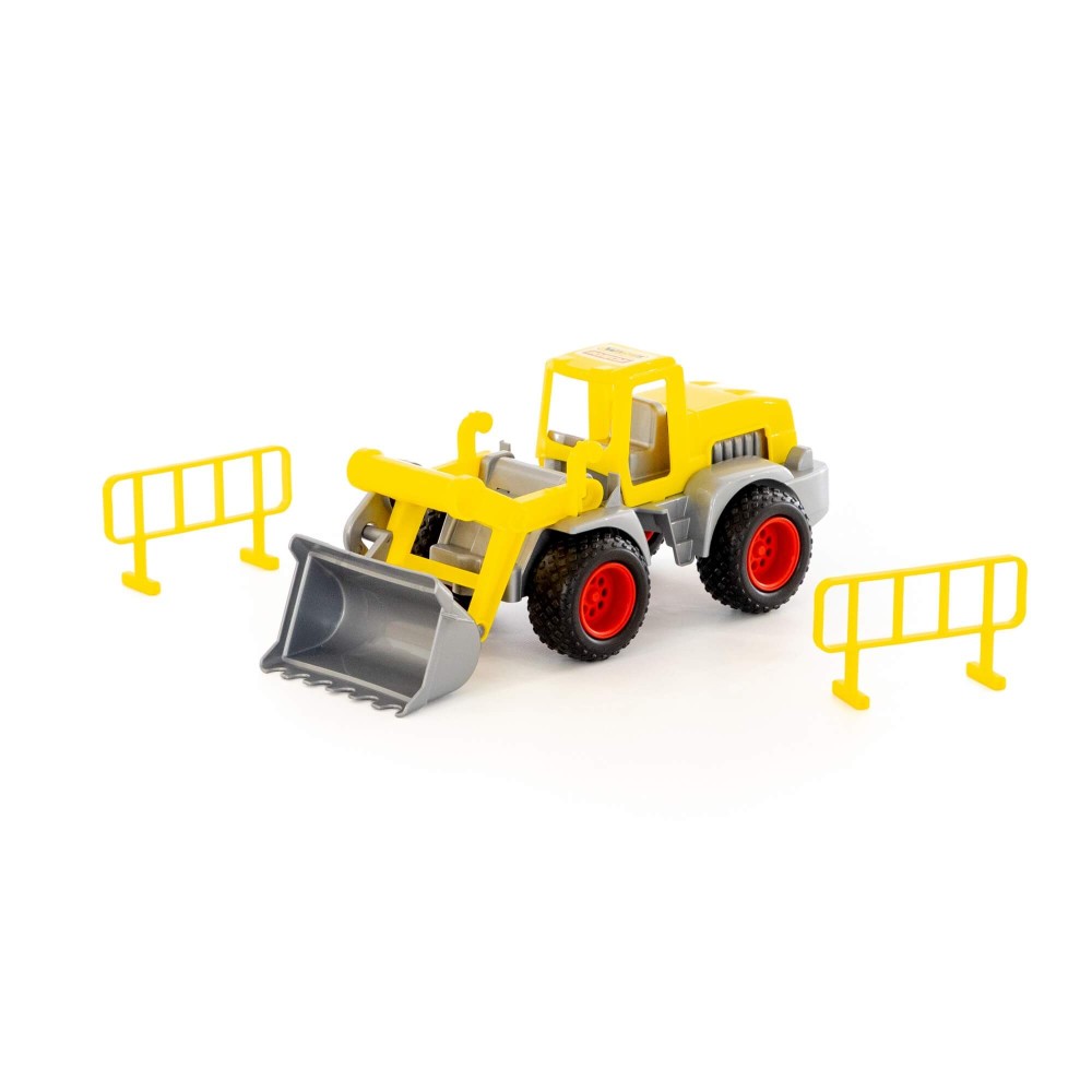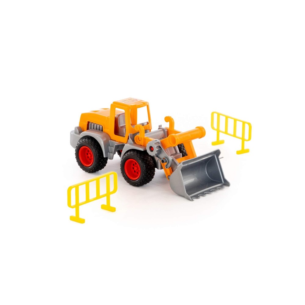 Игрушка выполнена в запоминающейся цветовой гамме из высококачественных материалов. Машинка оборудована резиновыми шинами с крупным протектором, что обеспечивает высокую проходимость и бесшумное движение по различным видам поверхностей, ей интересно играть как дома, так на свежем воздухе. Трактор-погрузчик оборудован подвижным ковшом для совершения манипуляций с различными грузами. В комплект к строительной технике входят специальные ограждения.